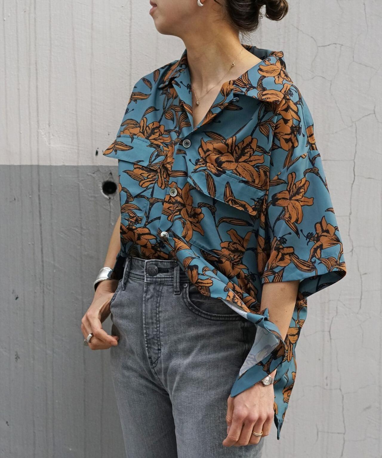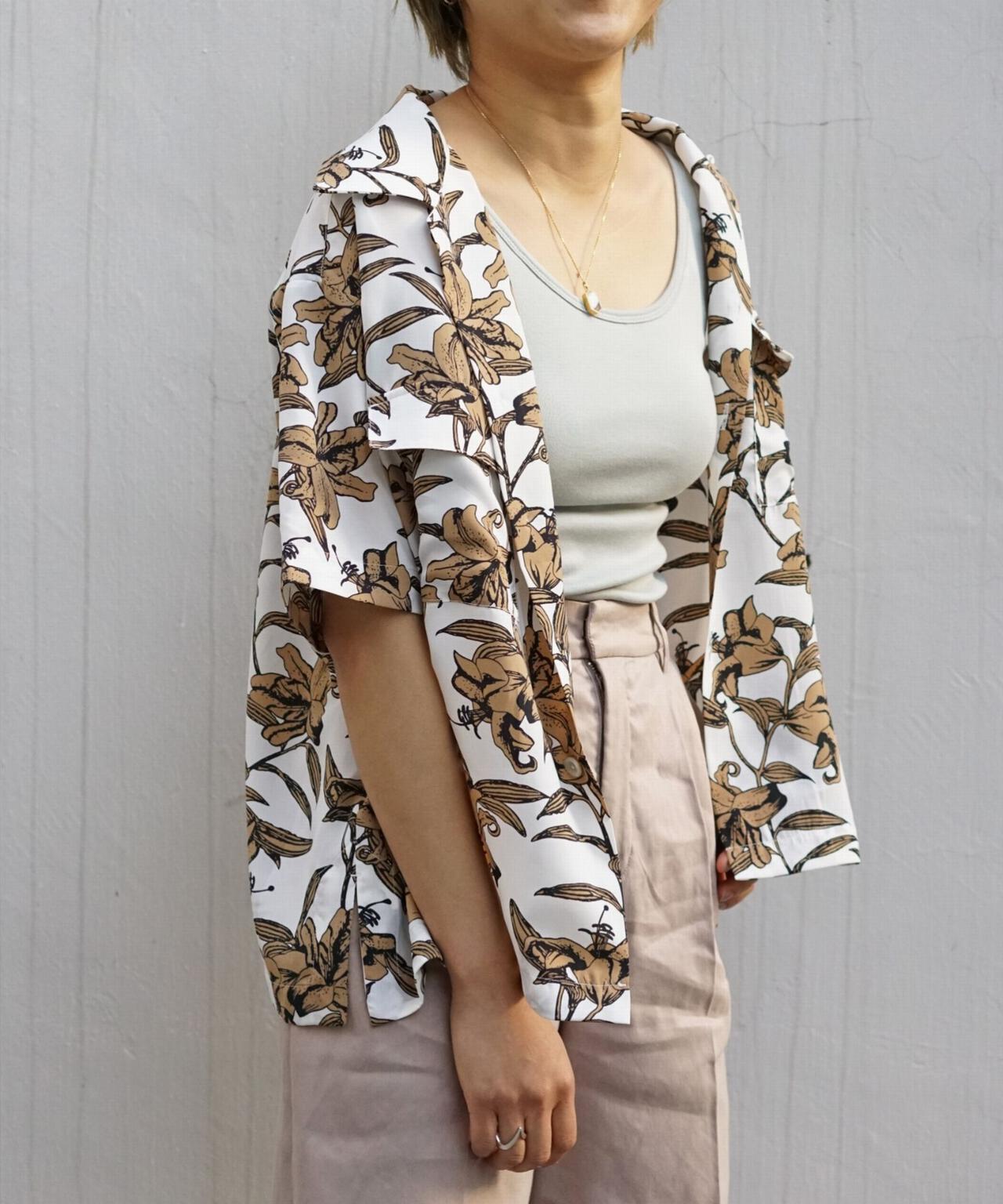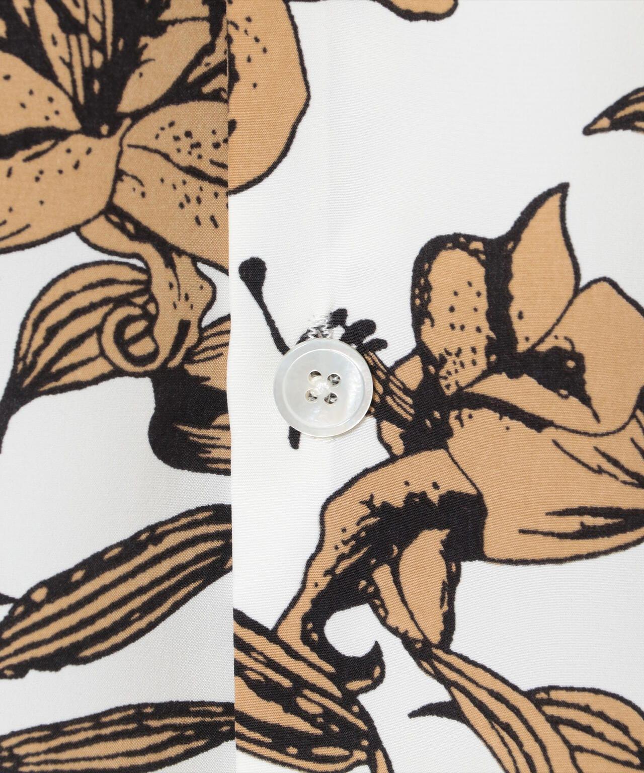 DROIT BELLO 特製花卉印花襯衫。前襟紐扣開合設計,既可敞開穿出梭織上衣的健康風格,也可合攏穿出整潔、乾淨的休閒風格,讓您根據自己的穿著方式享受各種氛圍。也可與同系列長褲搭配穿著。(品牌貨號:607421302-70)白色:模特:166cm藍色:模特:155cm【DROIT BELLO】2017AW年出道的日本品牌。該品牌提供成人上班和下班均可穿著的服裝,注重材質和細節。