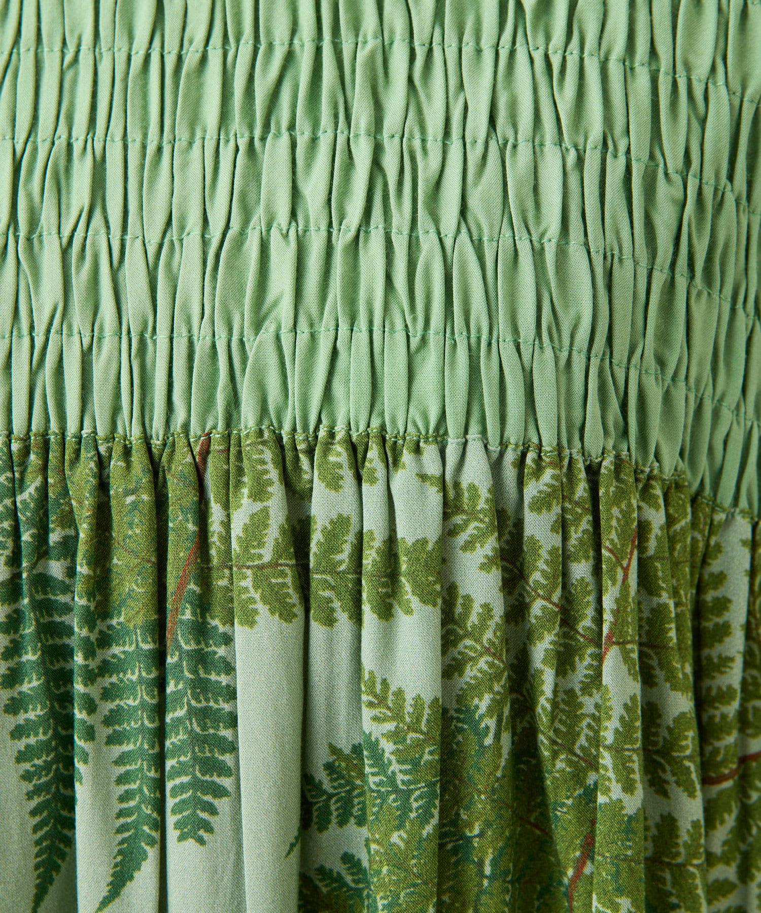 蕨類植物圖案和胸前的褶皺為這款連身裙增添了無限魅力。