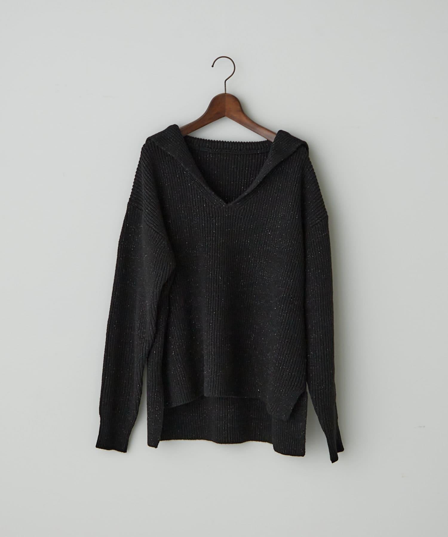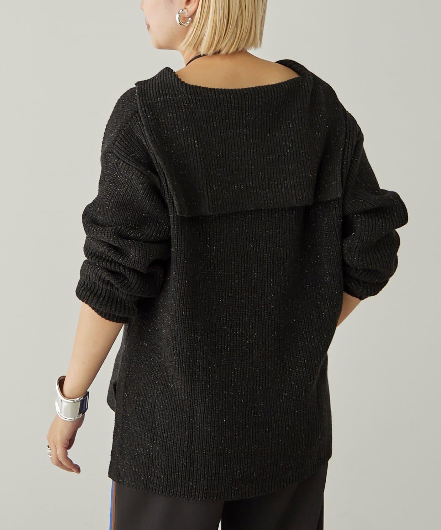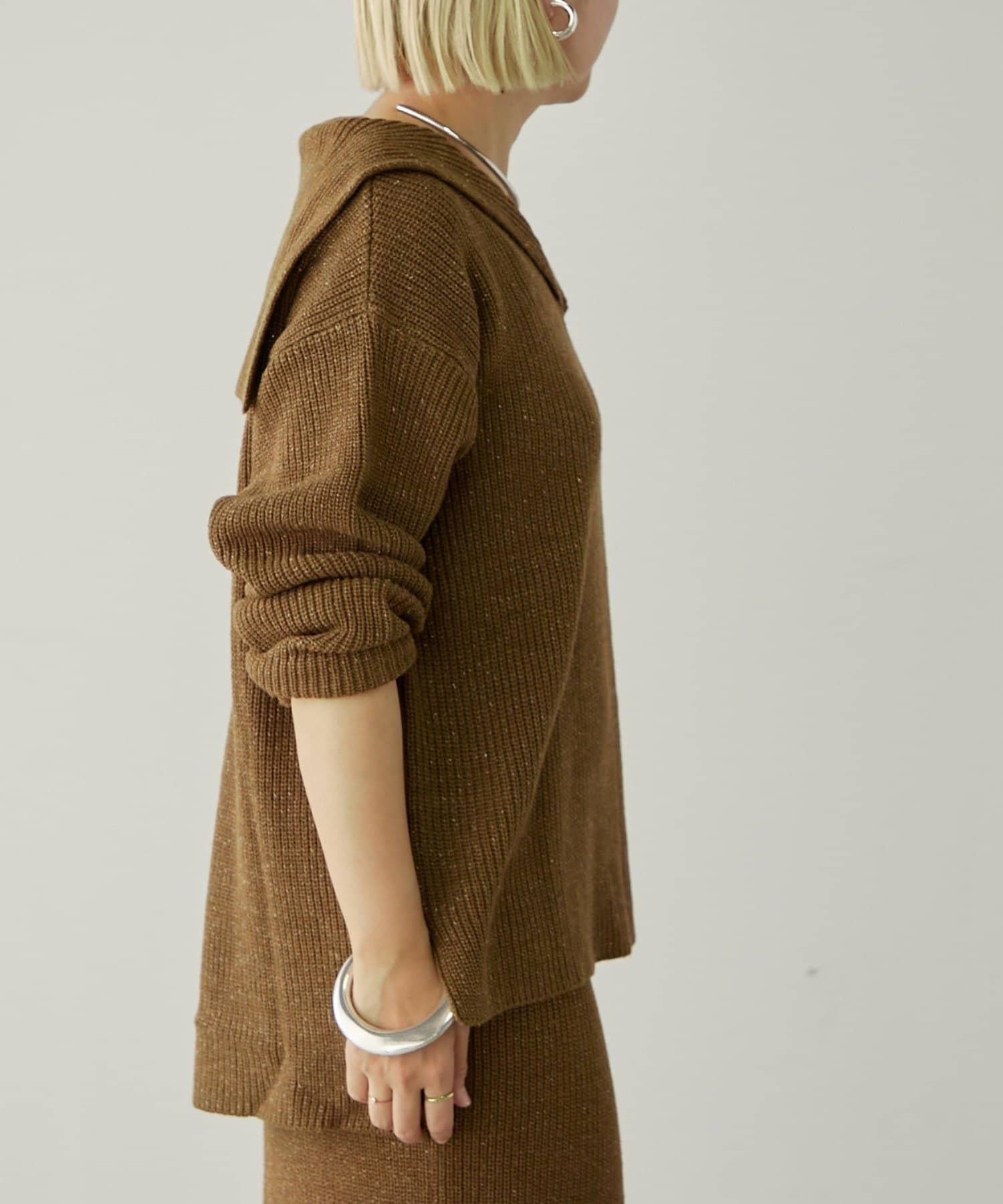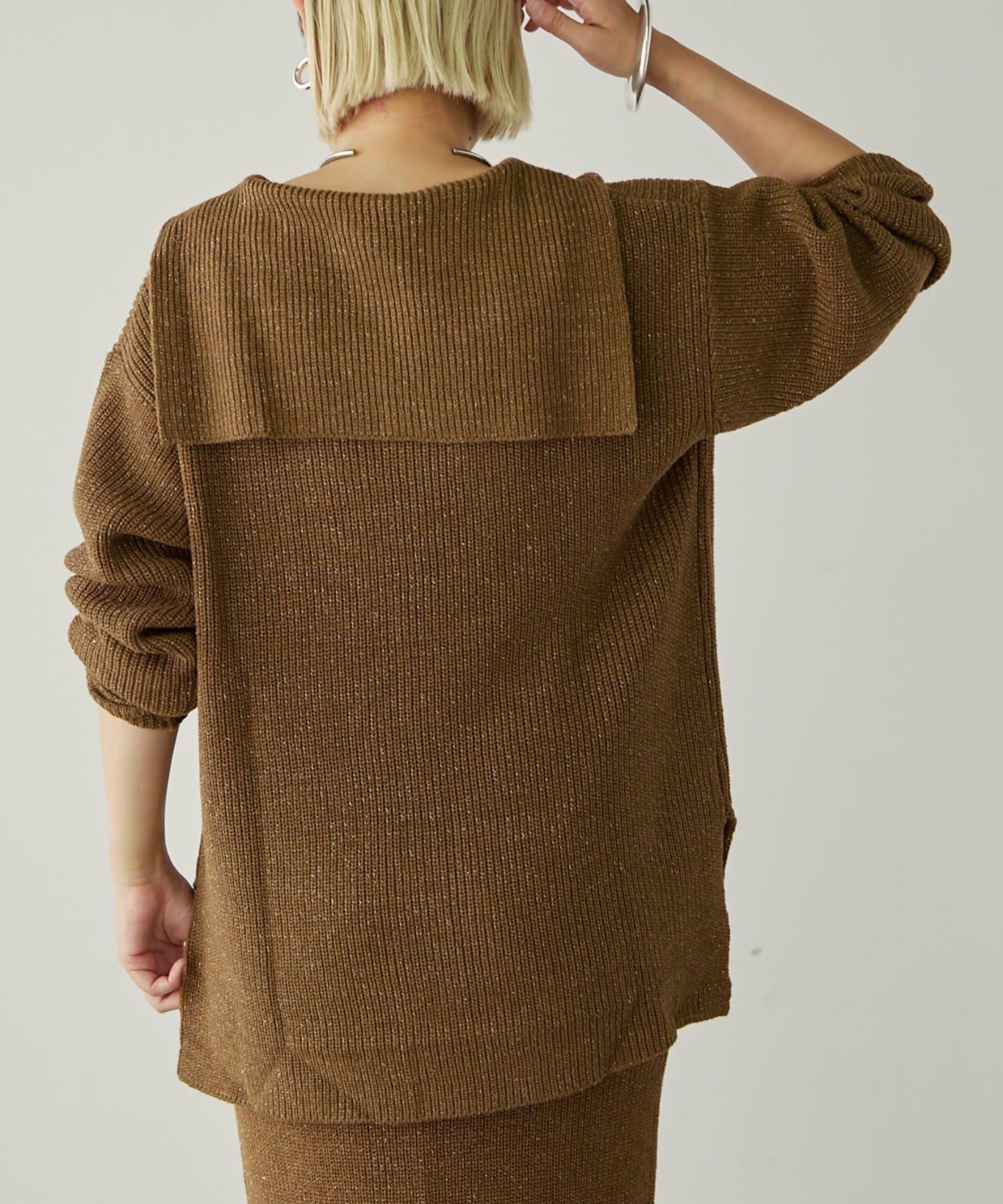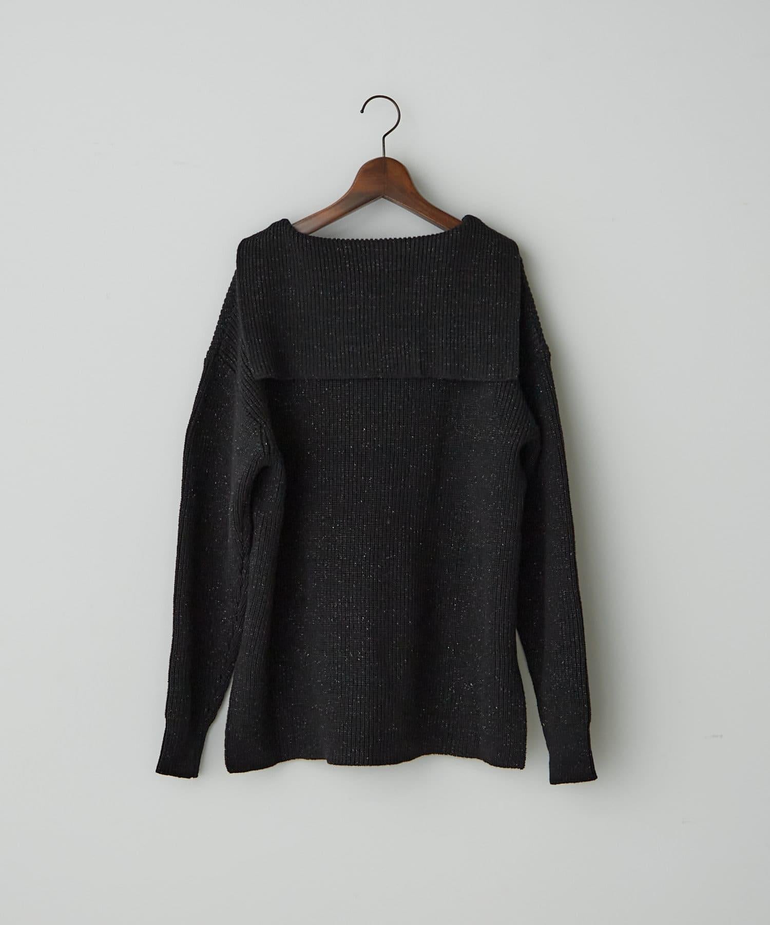 這款針織套頭衫帶有時尚的水手領,單面採用混有微微閃光的紗線隨意編織而成。