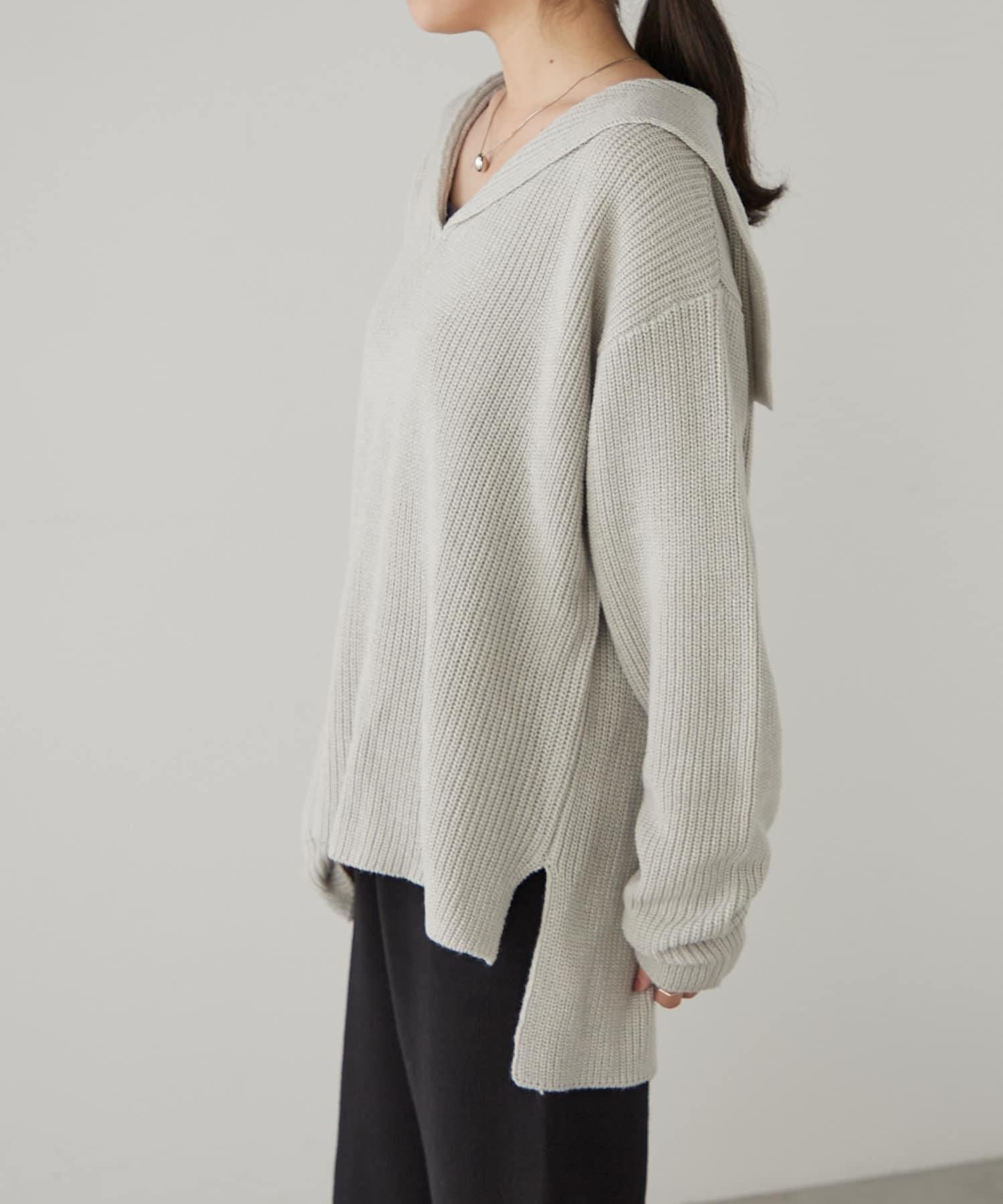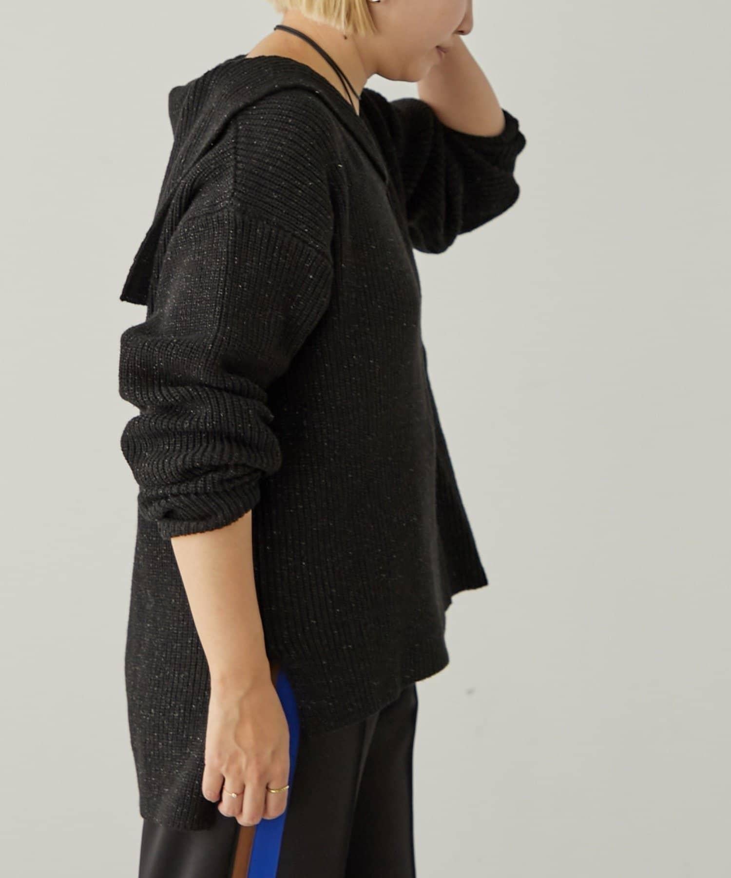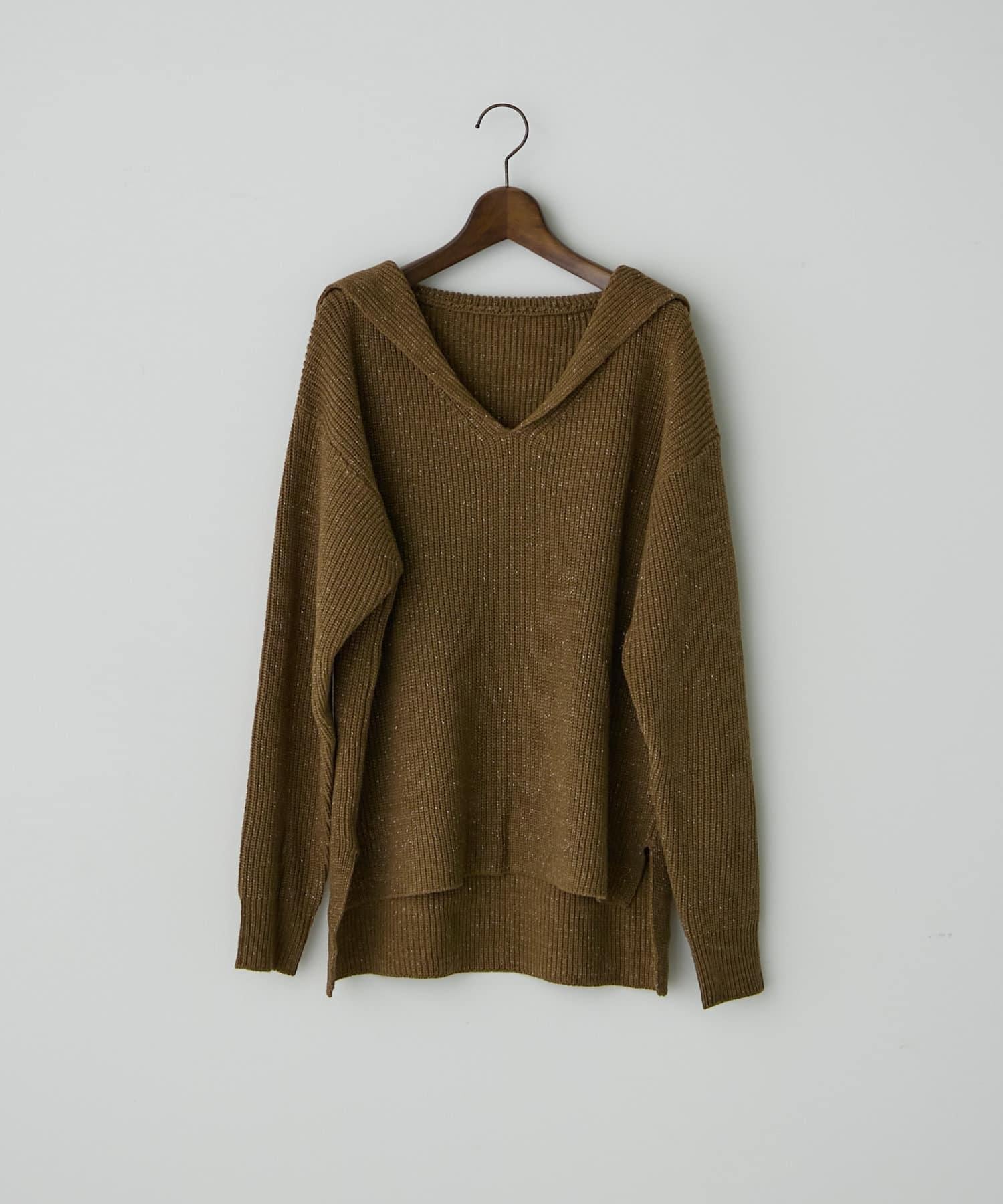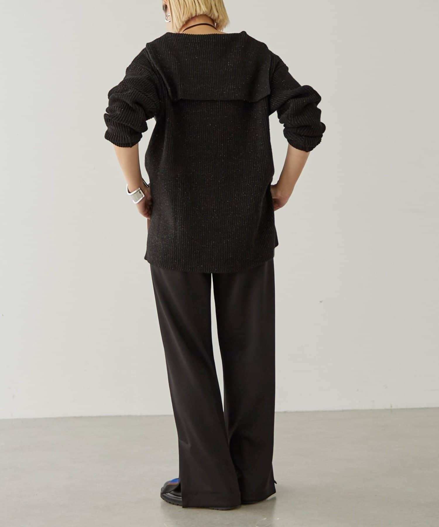 這款針織套頭衫帶有時尚的水手領,單面採用混有微微閃光的紗線隨意編織而成。