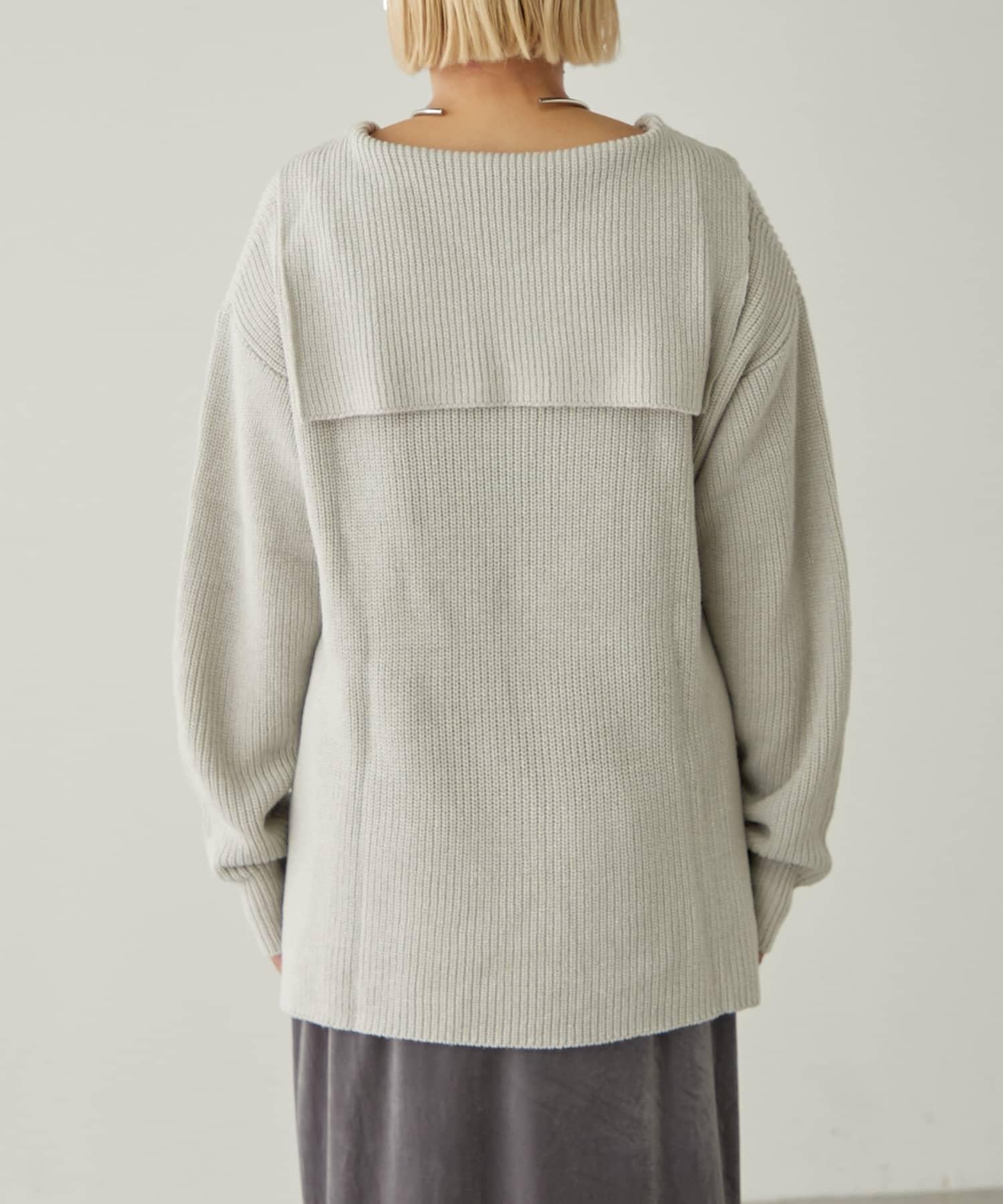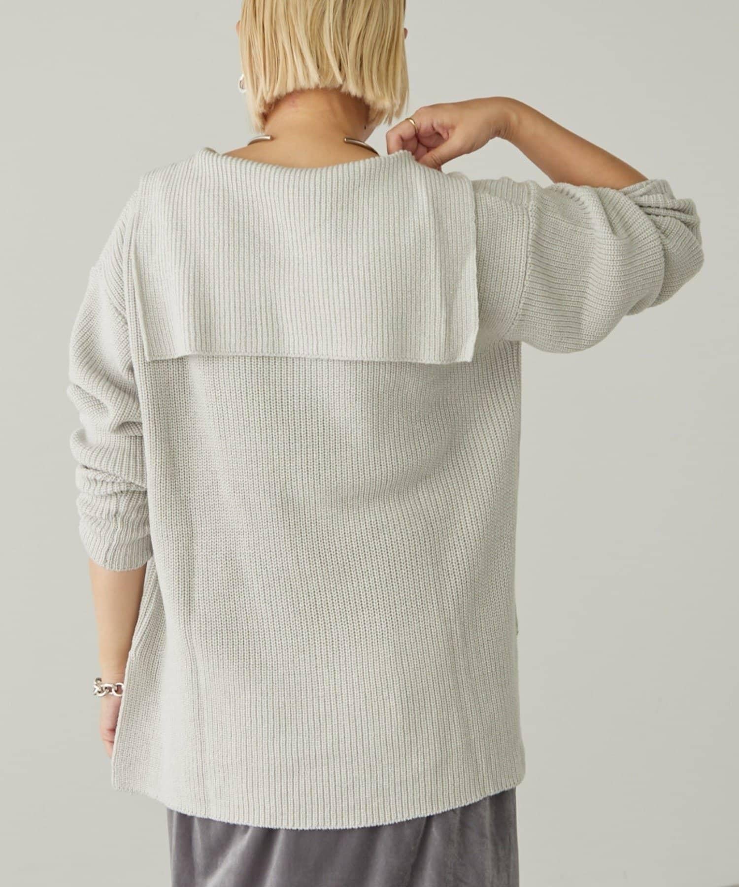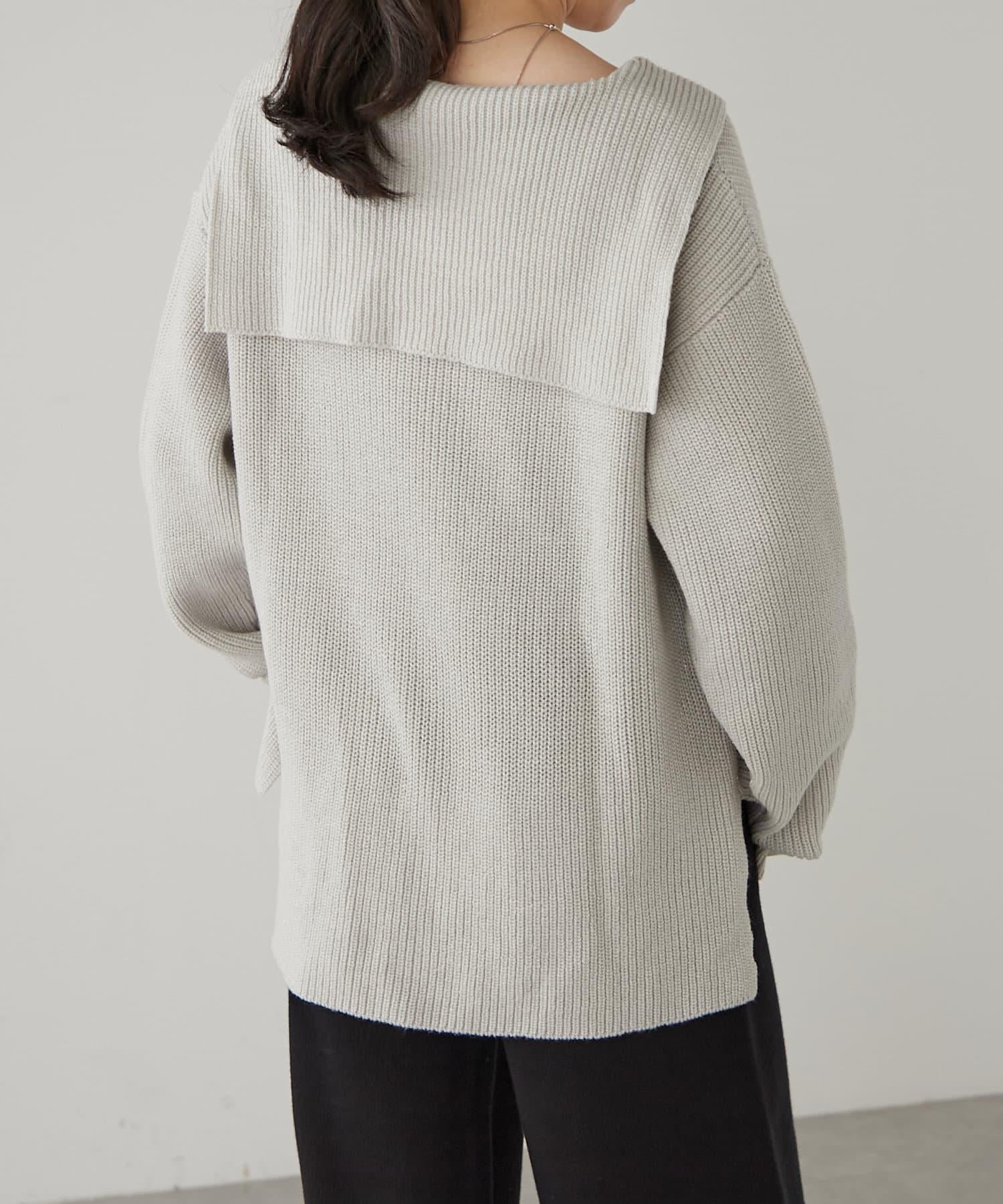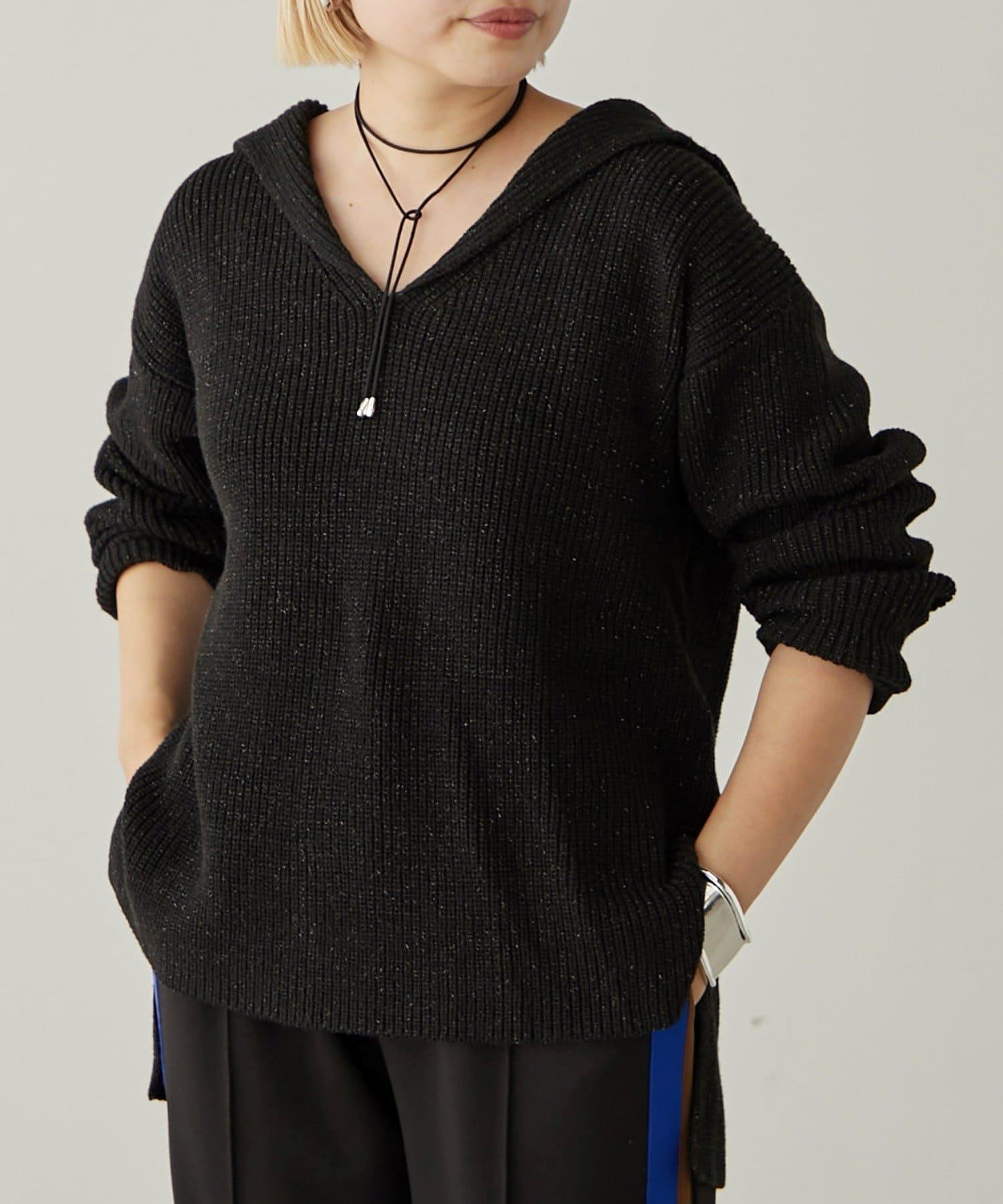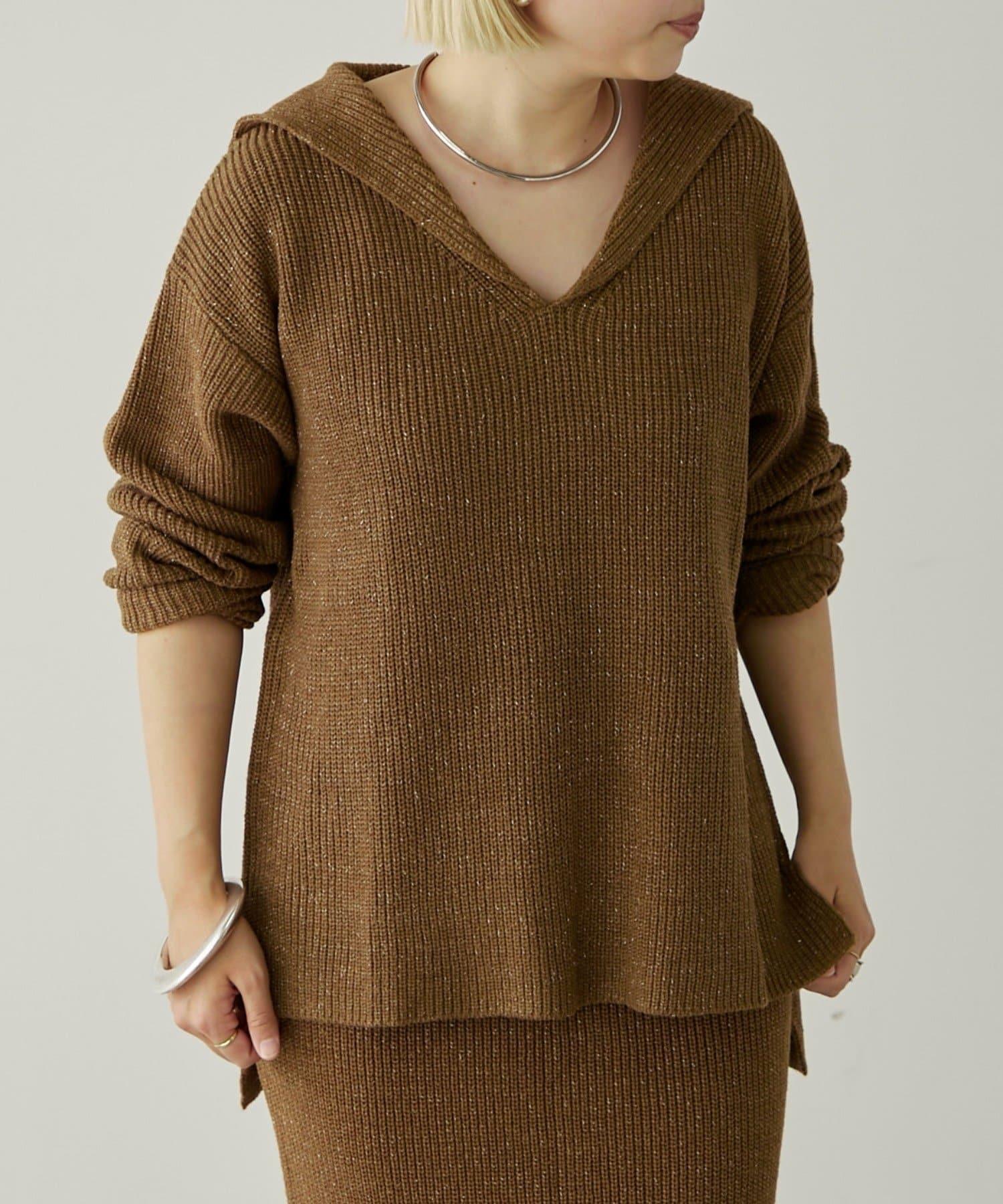 這款針織套頭衫帶有時尚的水手領,單面採用混有微微閃光的紗線隨意編織而成。