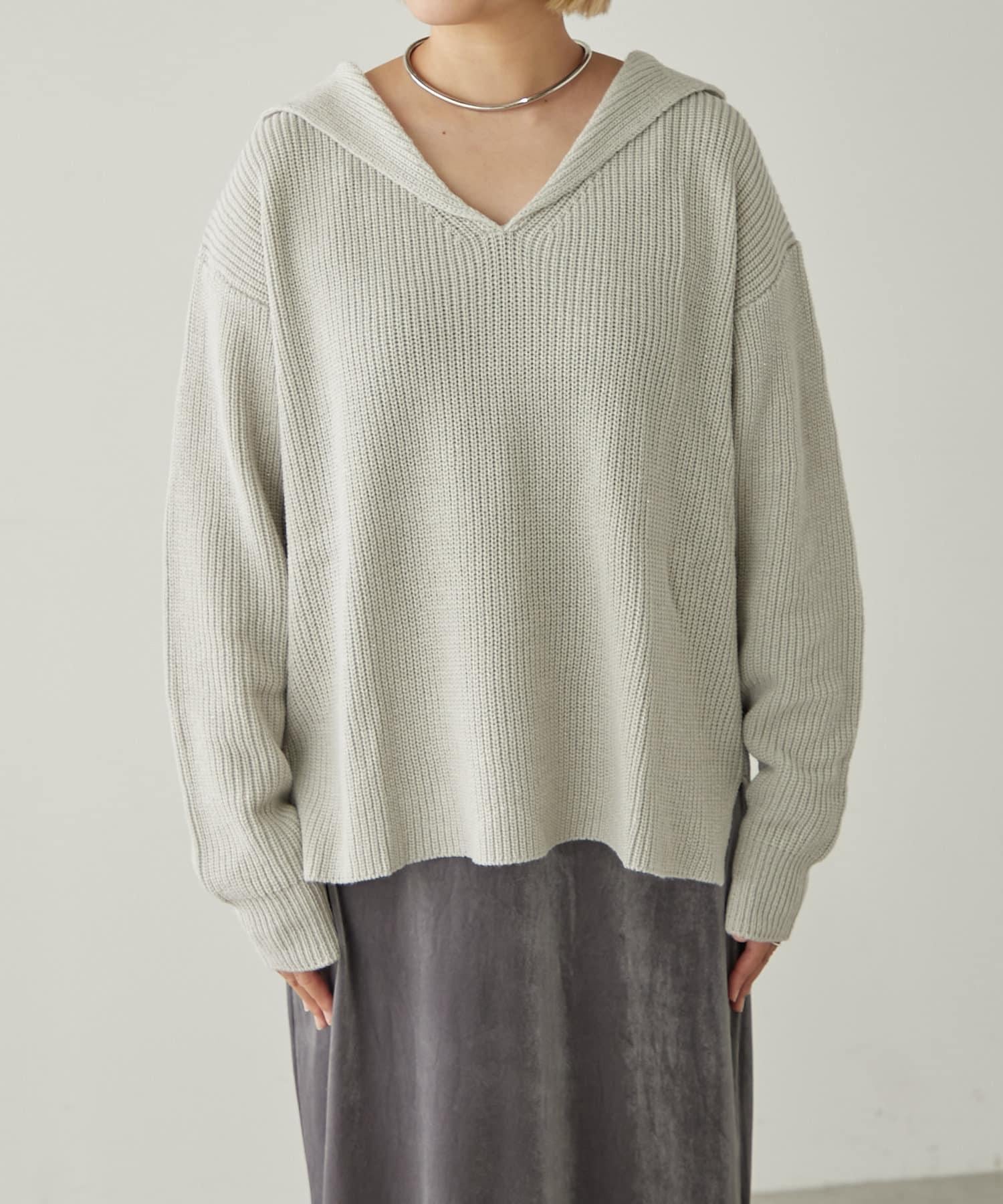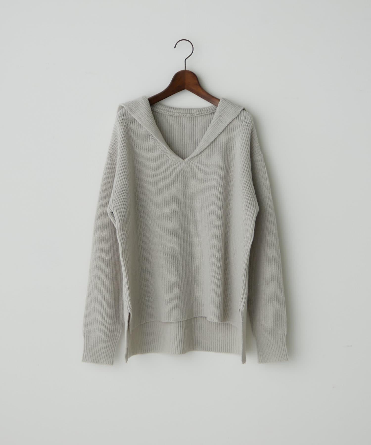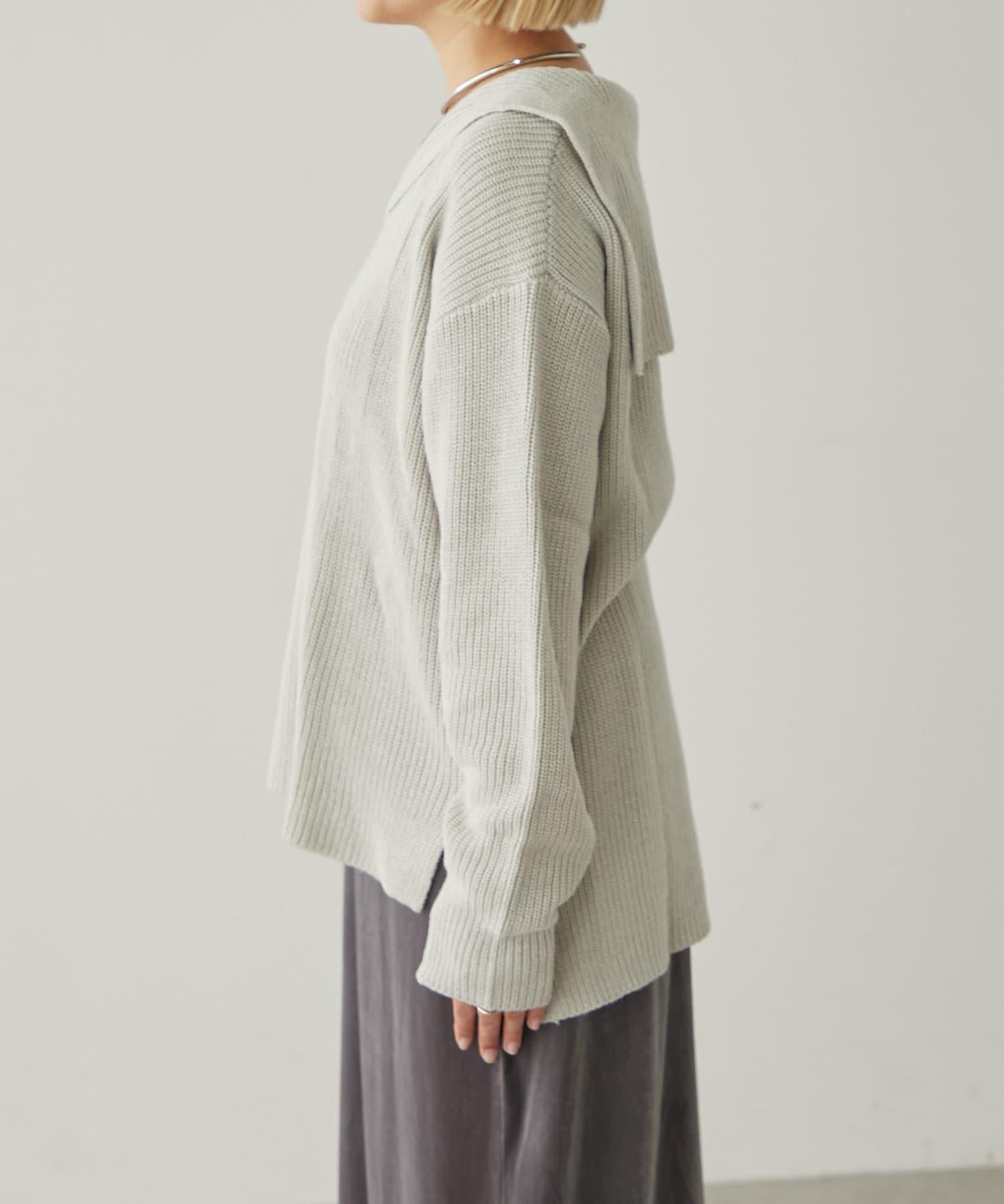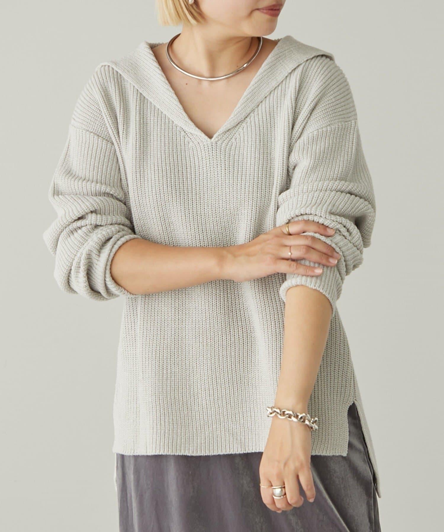這款針織套頭衫帶有時尚的水手領,單面採用混有微微閃光的紗線隨意編織而成。