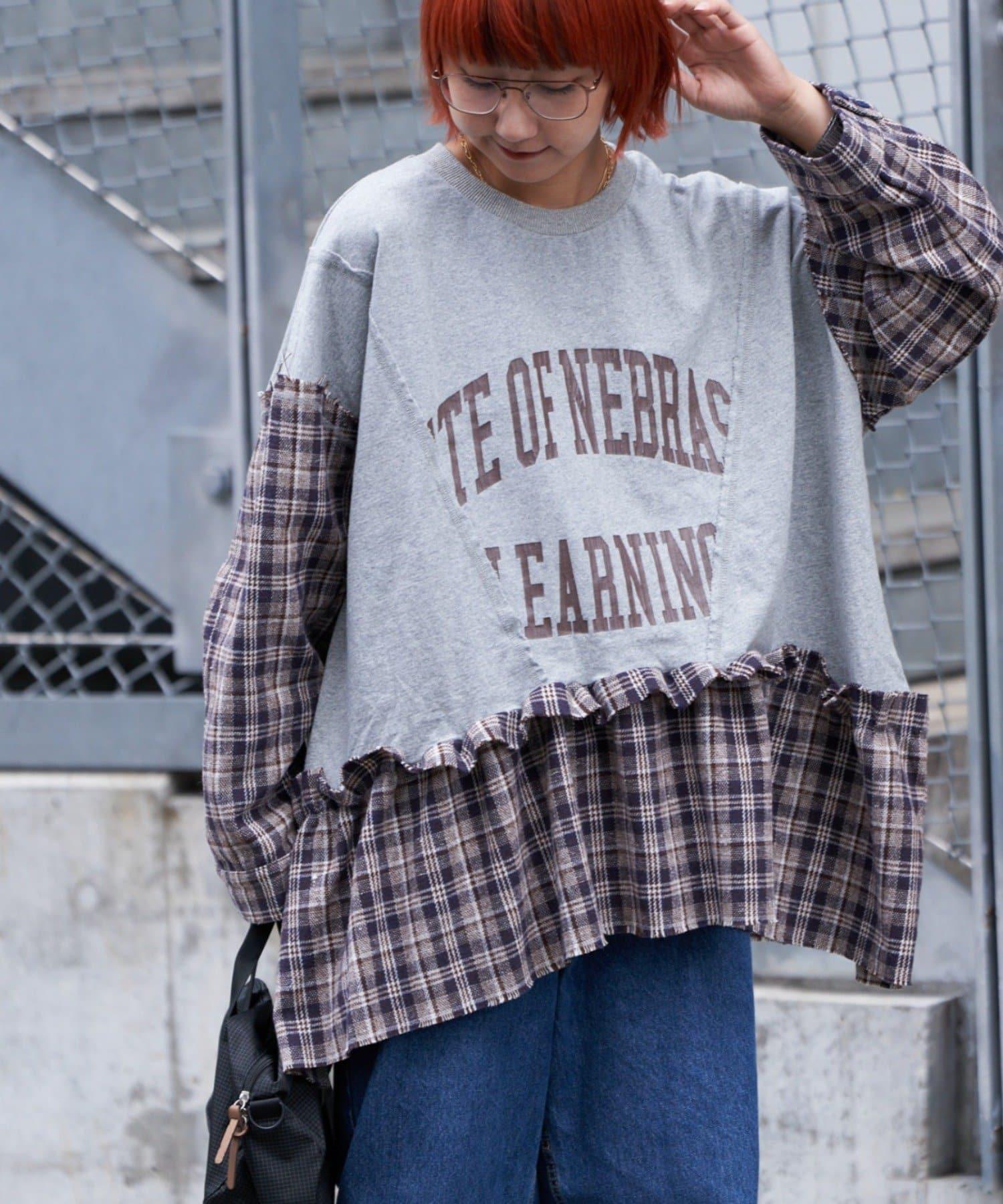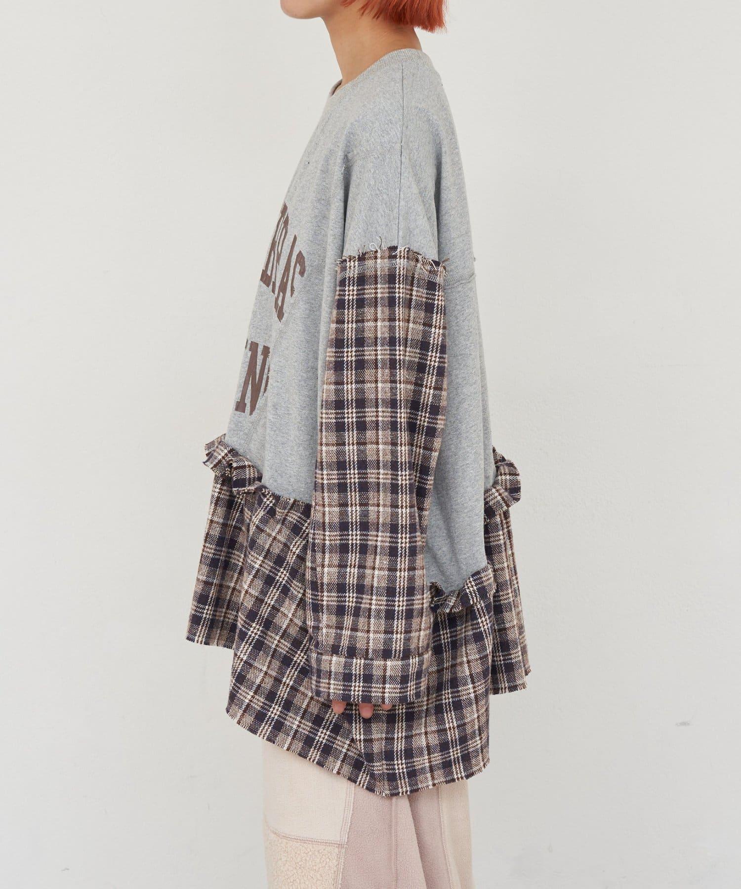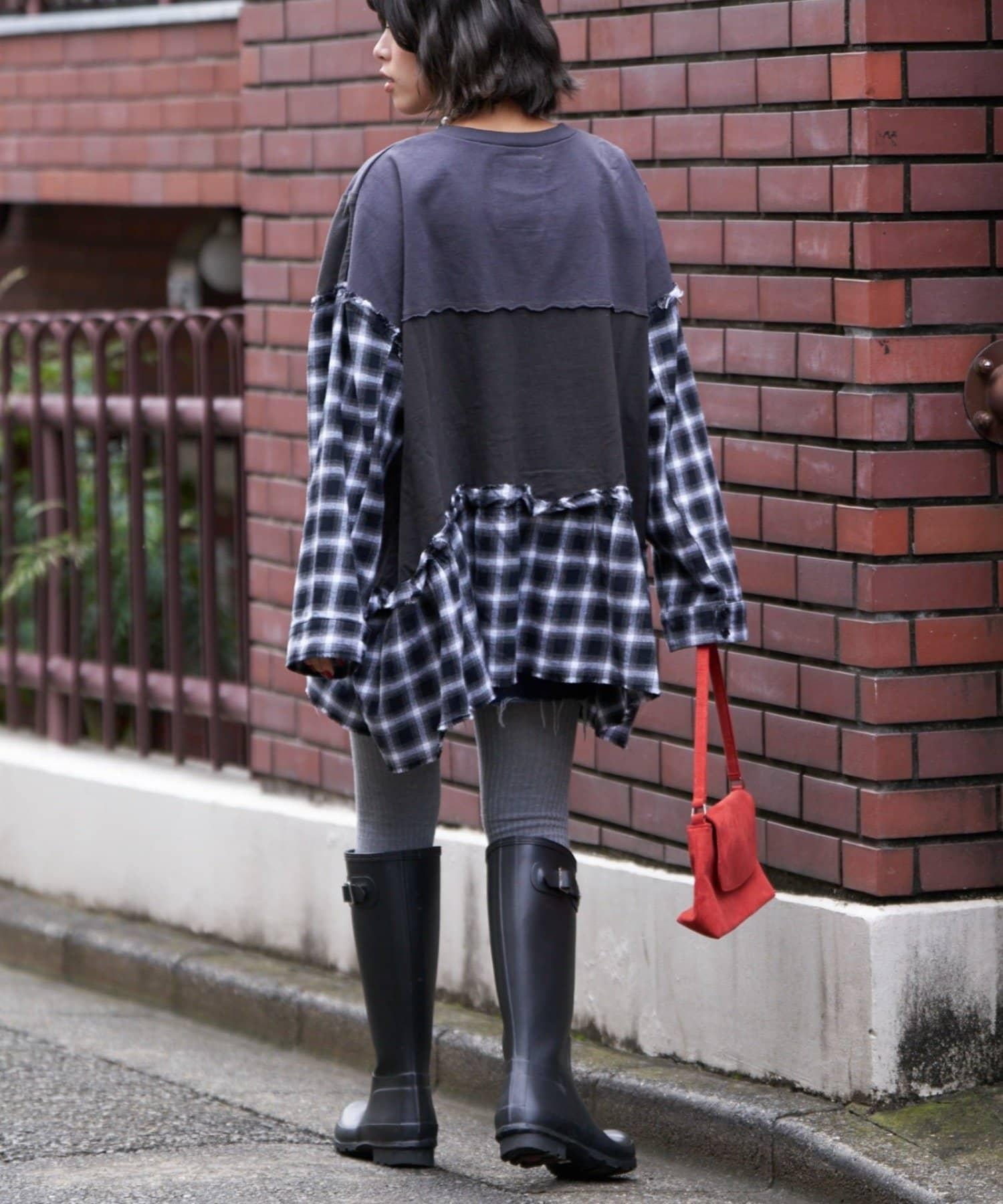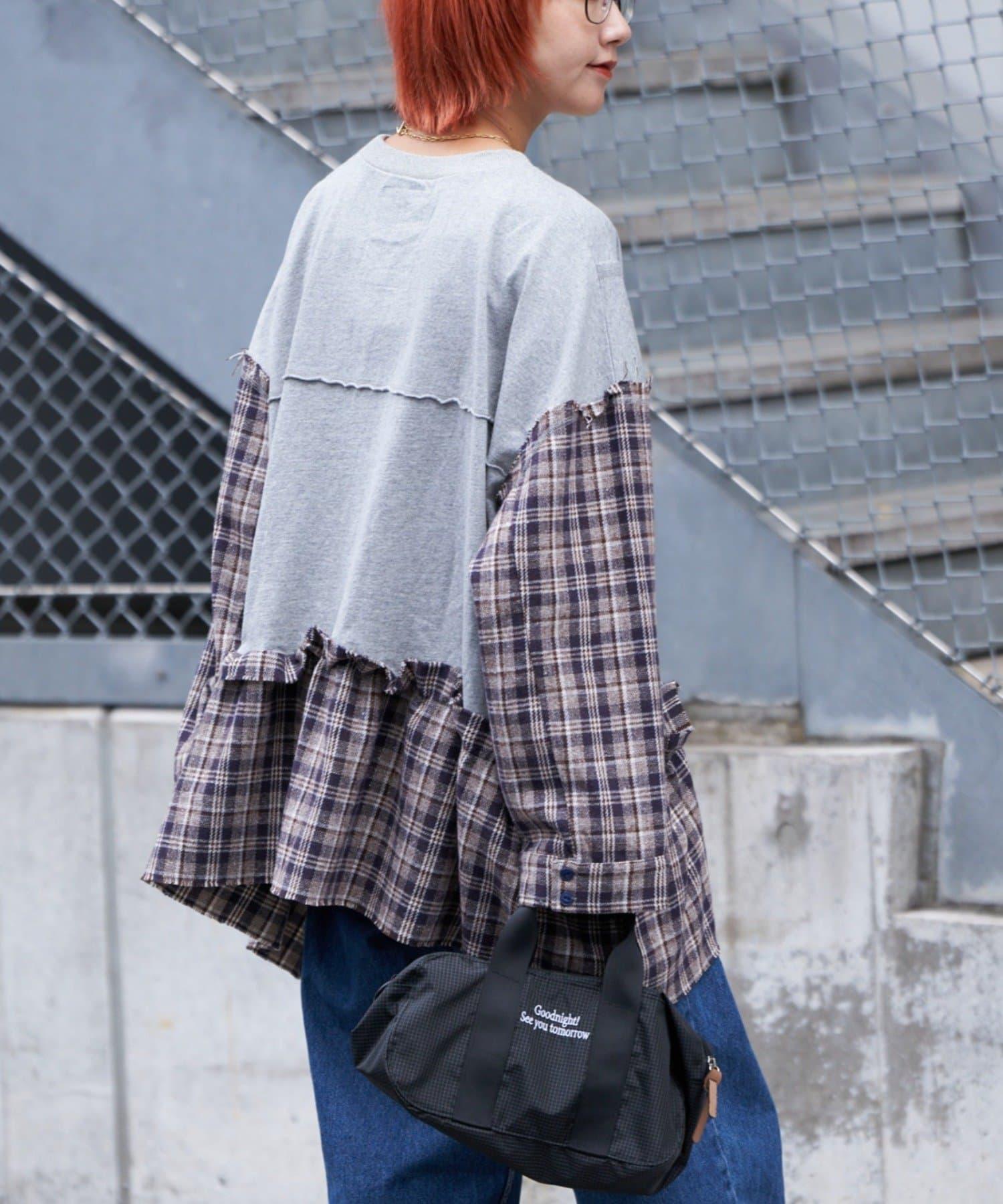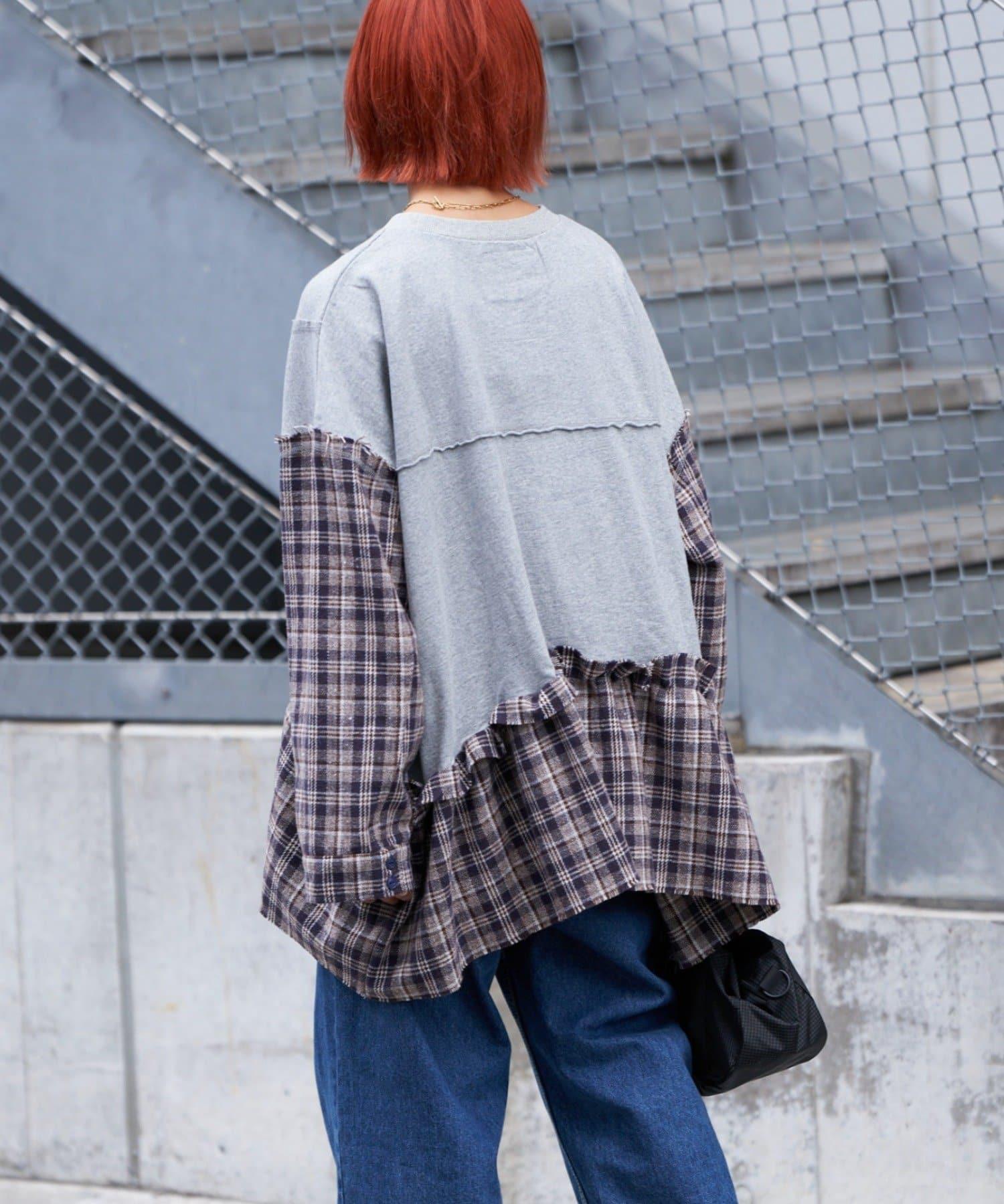【etsinta/エシンタ】拼接格紋荷葉邊T恤