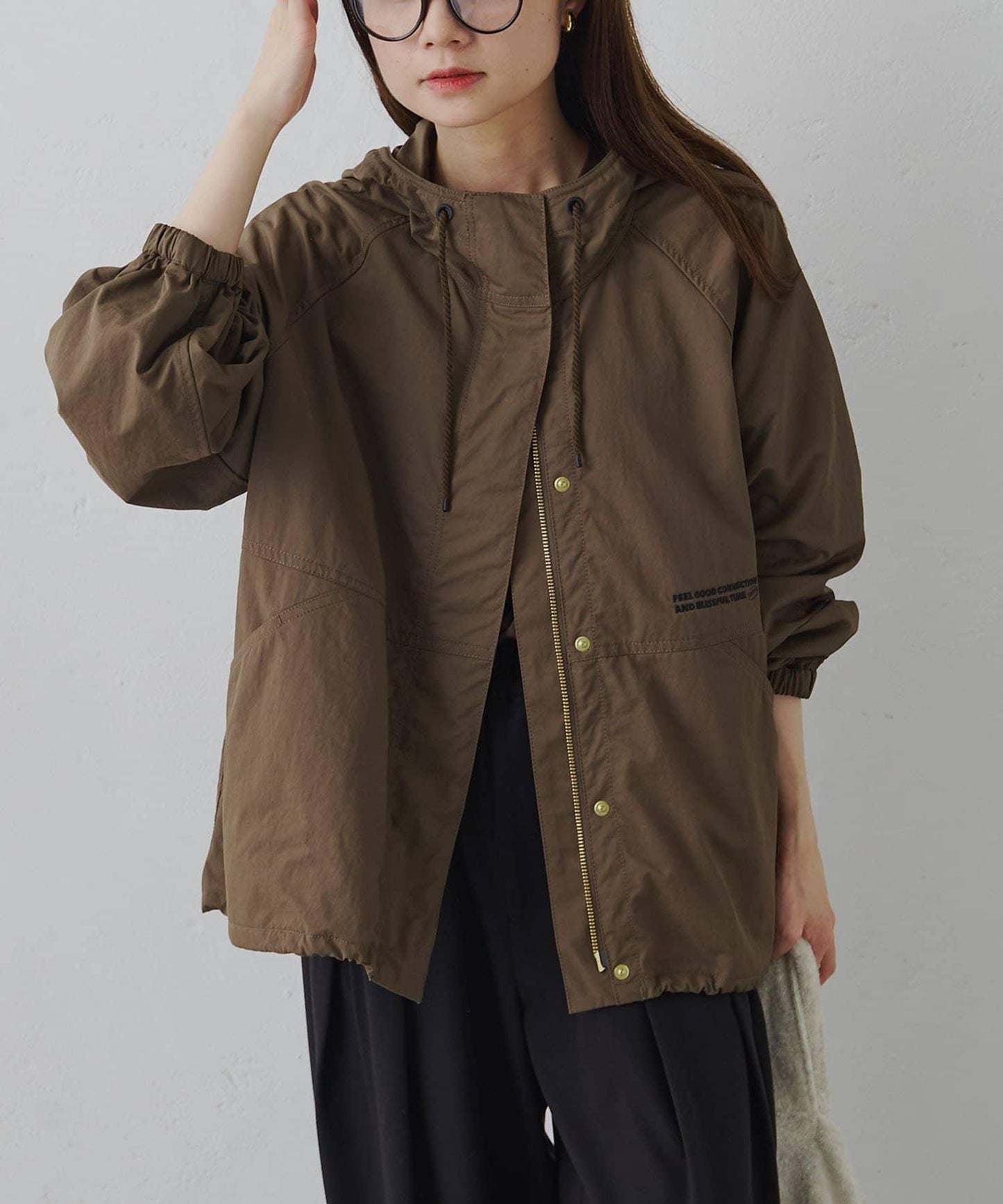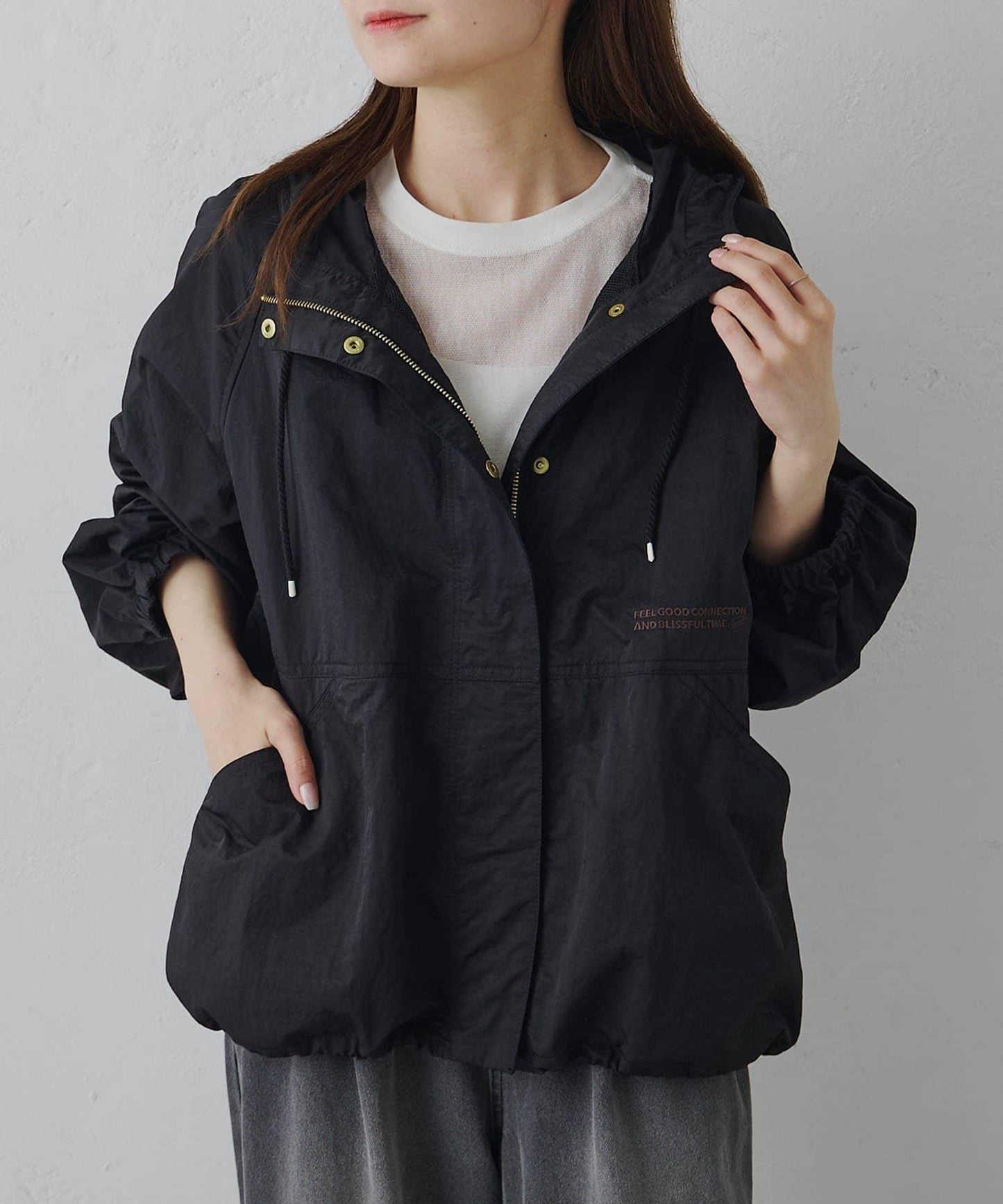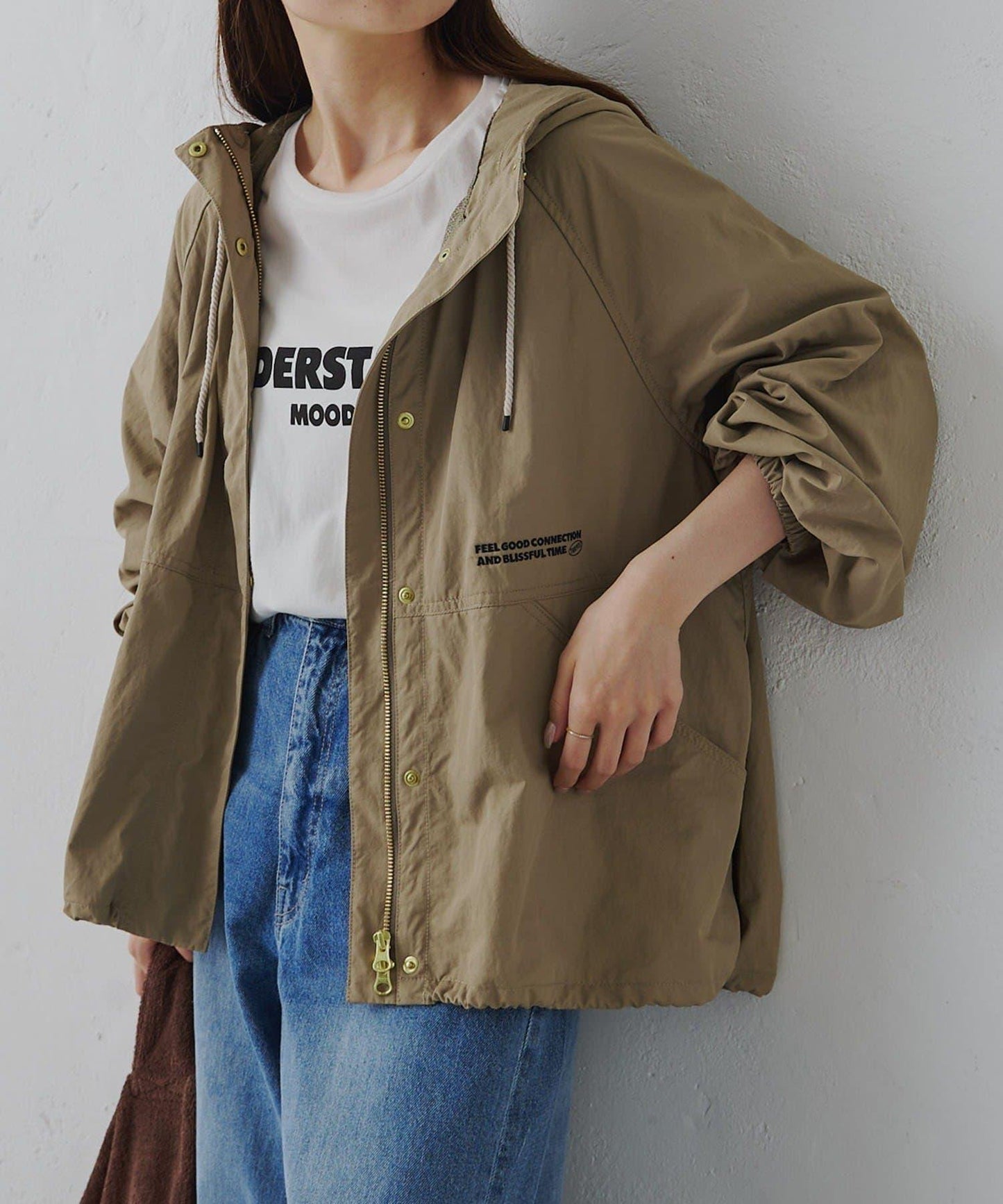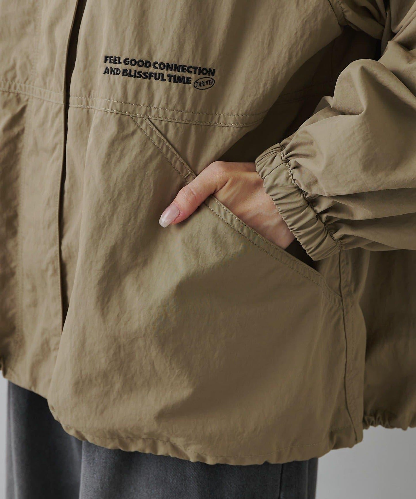 右側的刺繡和從兜帽延伸出來的編織繩恰到好處地增加了點睛之筆。