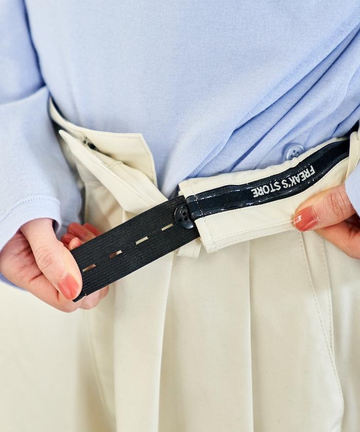 腰部有鬆緊帶,可在腰部內側扣上,以調整合身度、