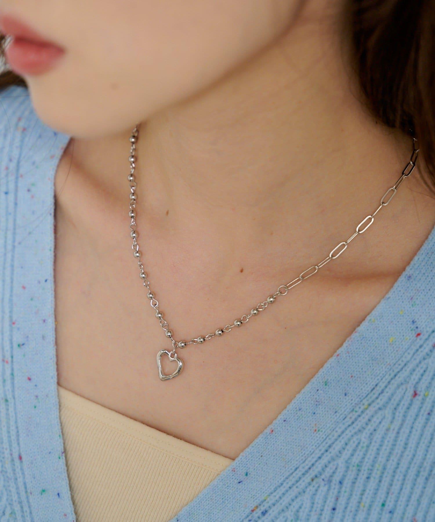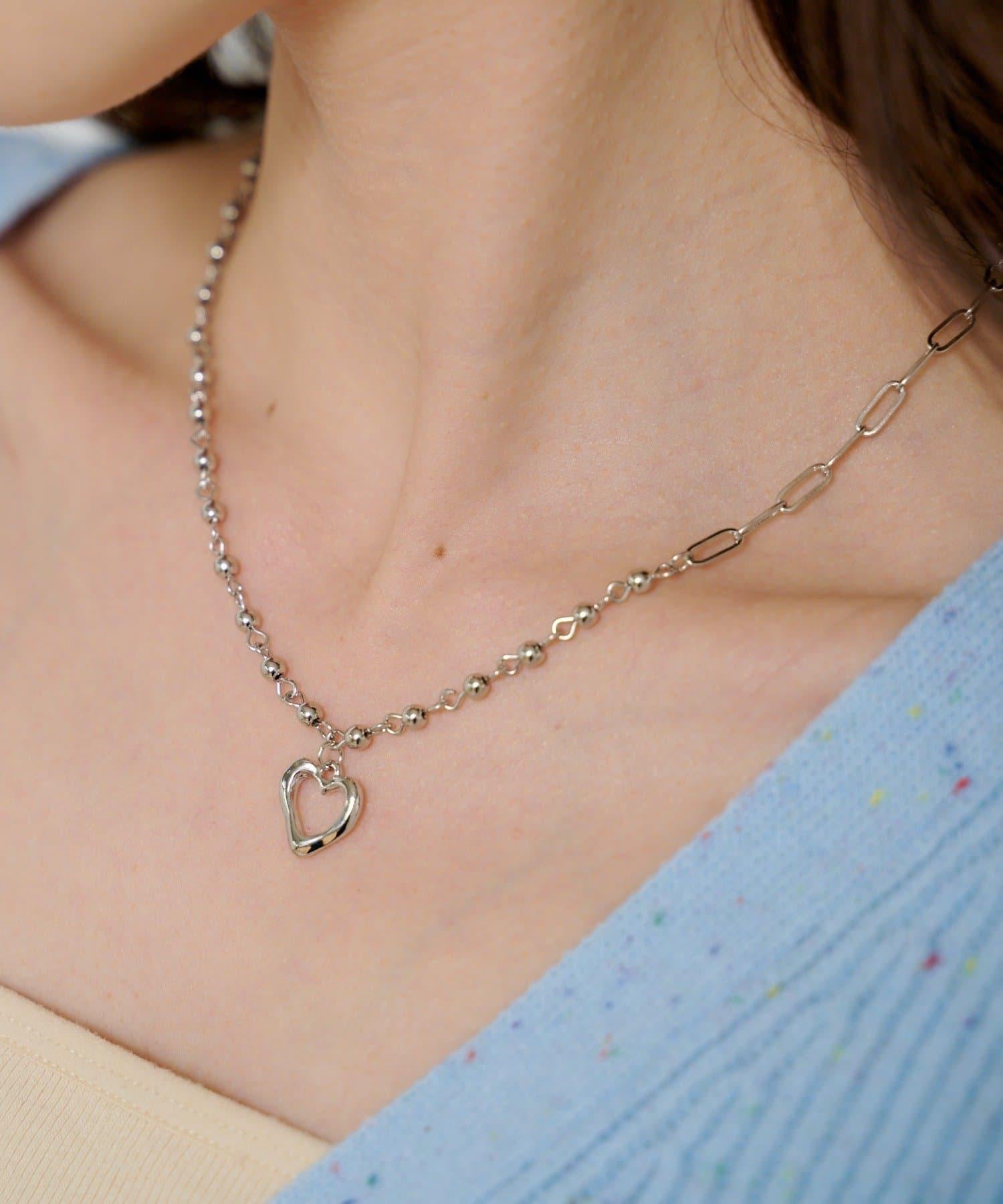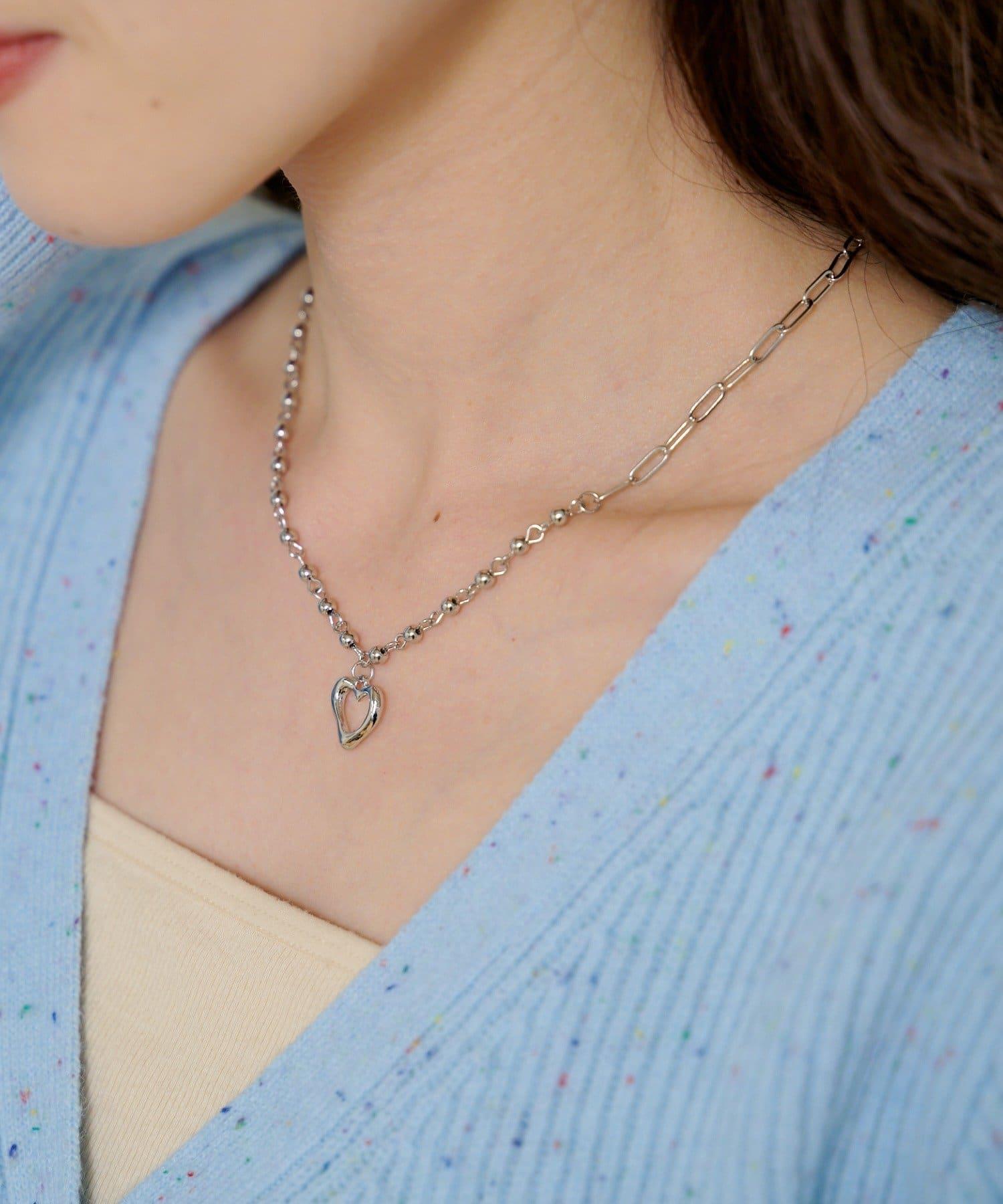 這款項鍊採用不對稱設計,將不同的鏈條組合在一起,上面有一個擺動的立體心形圖案。