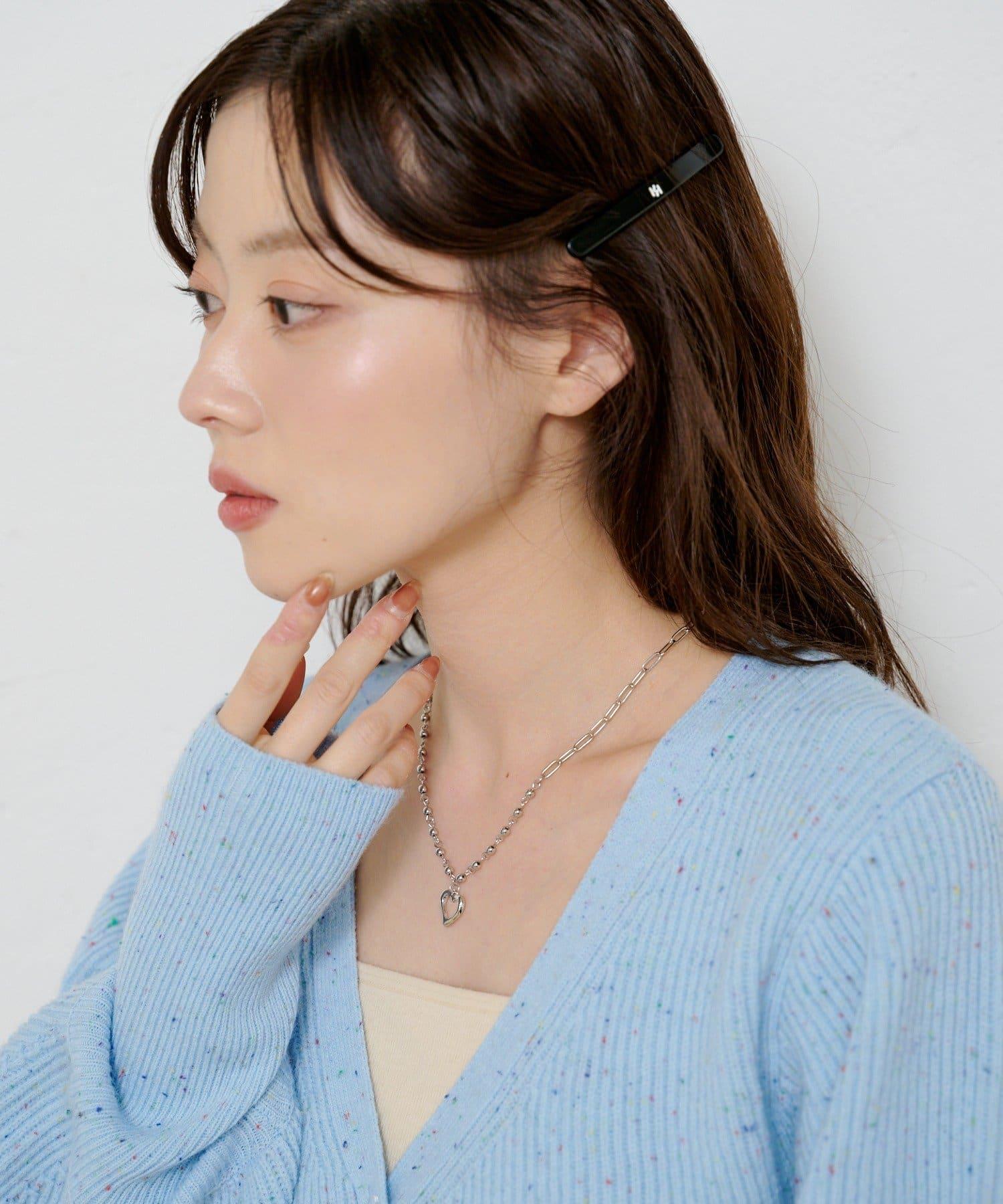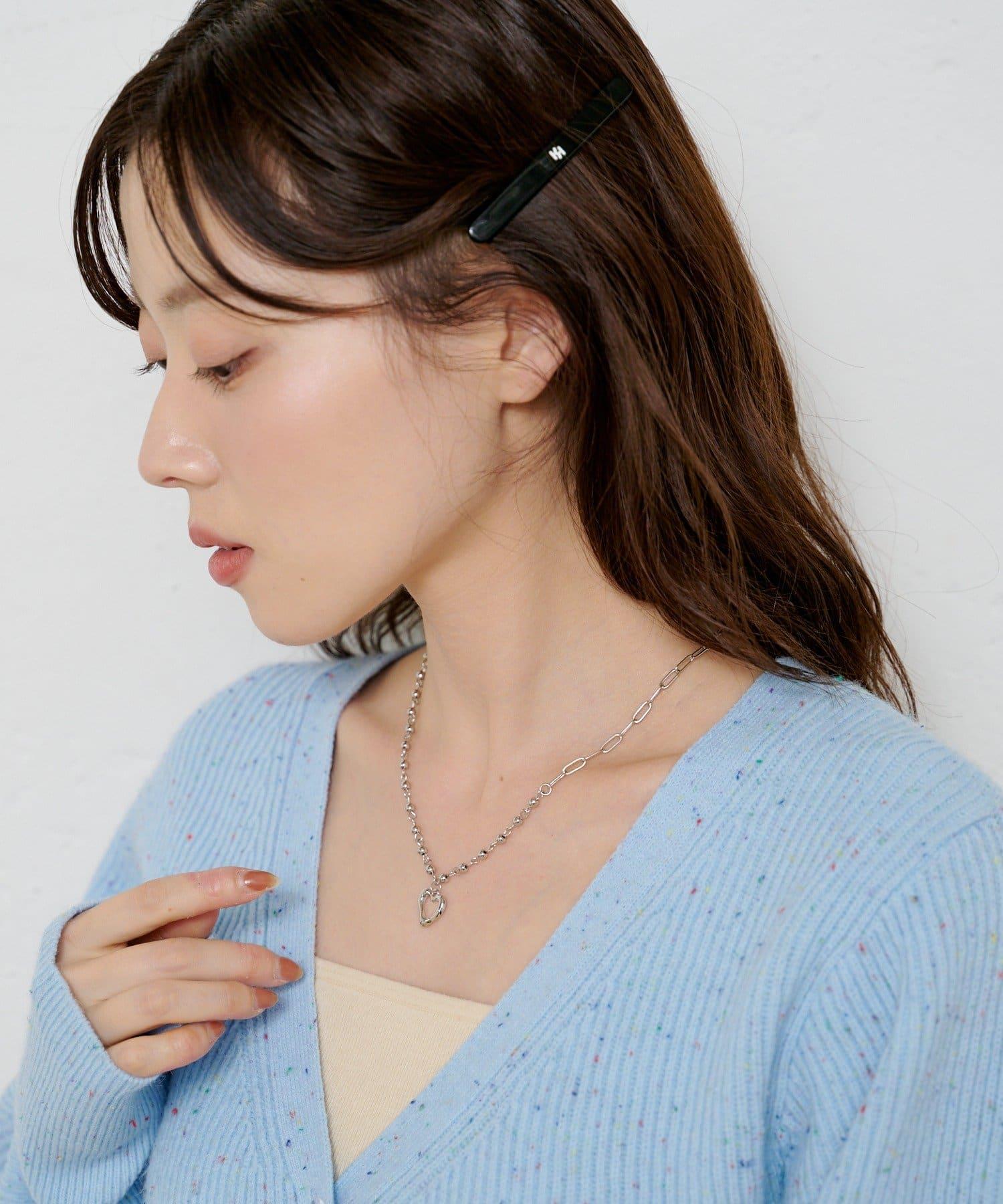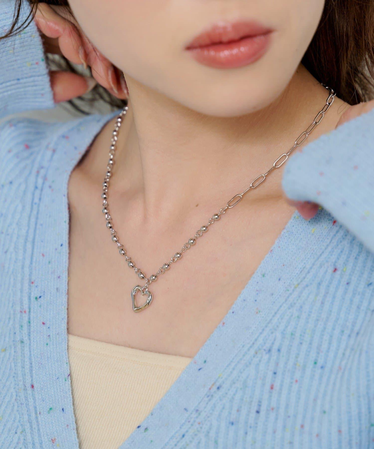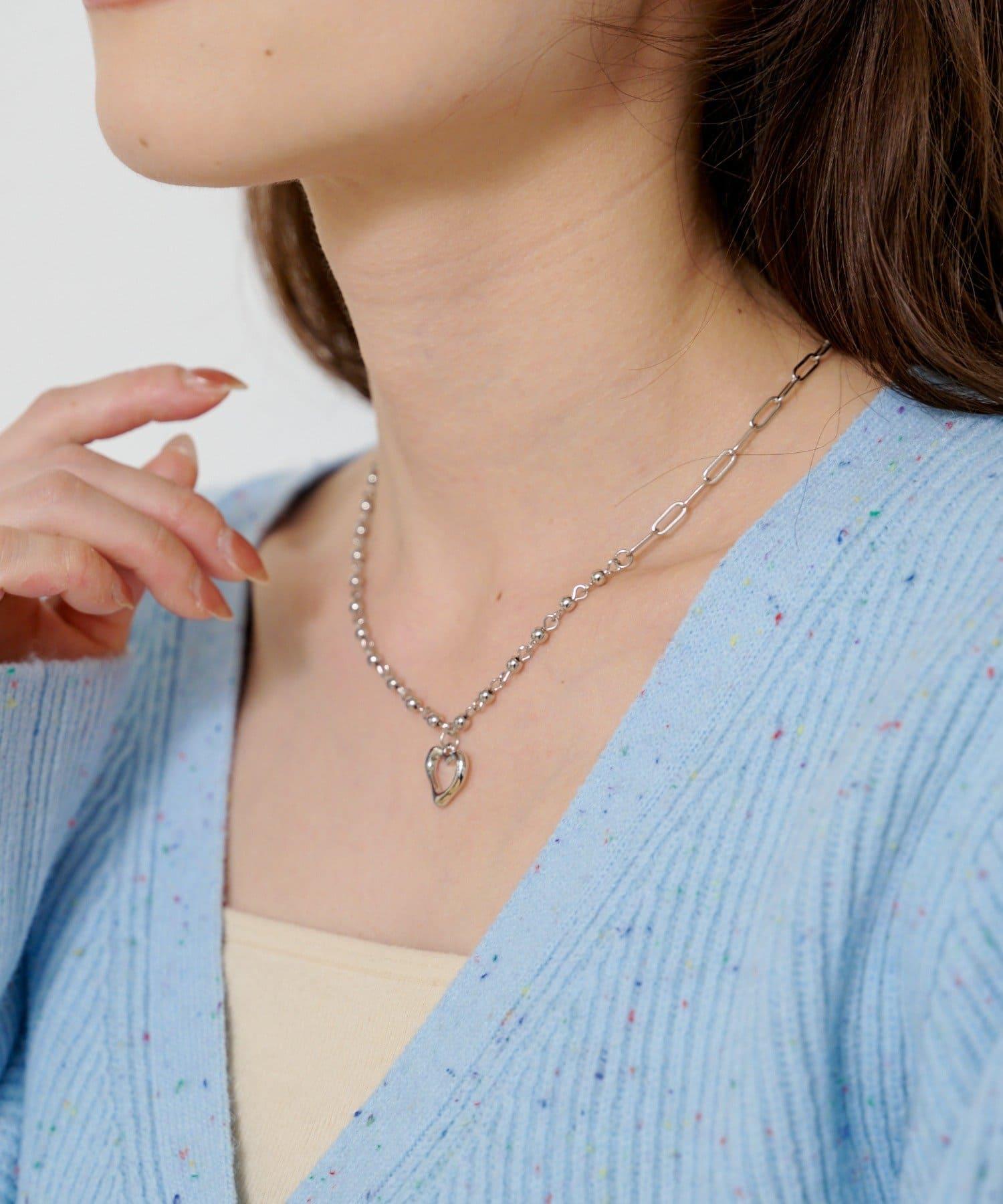 這款項鍊採用不對稱設計,將不同的鏈條組合在一起,上面有一個擺動的立體心形圖案。