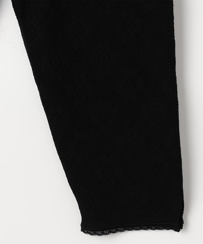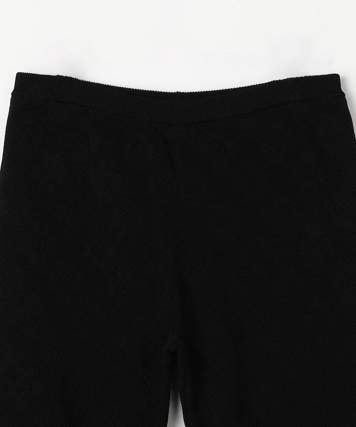 長褲採用獨特的針織面料,飾有小孔和提花。