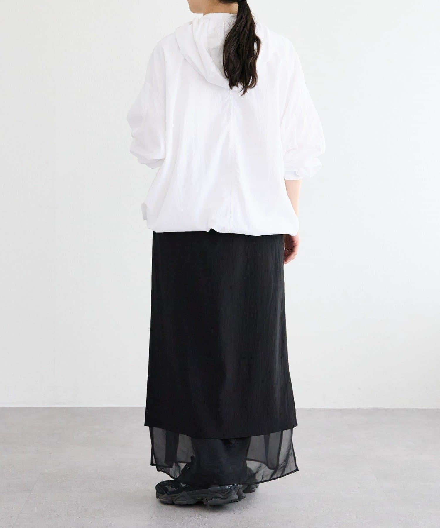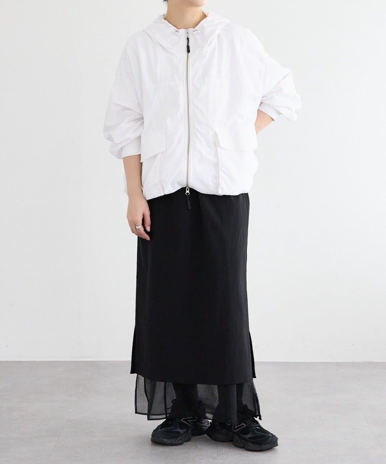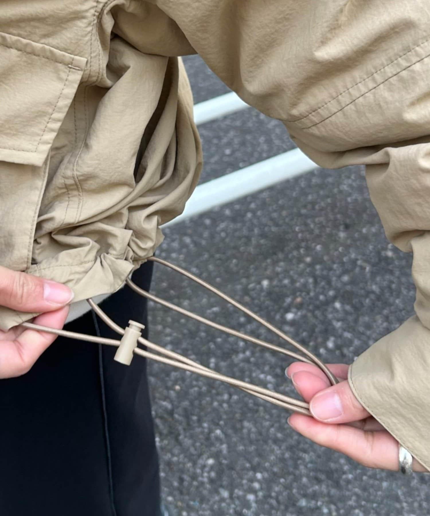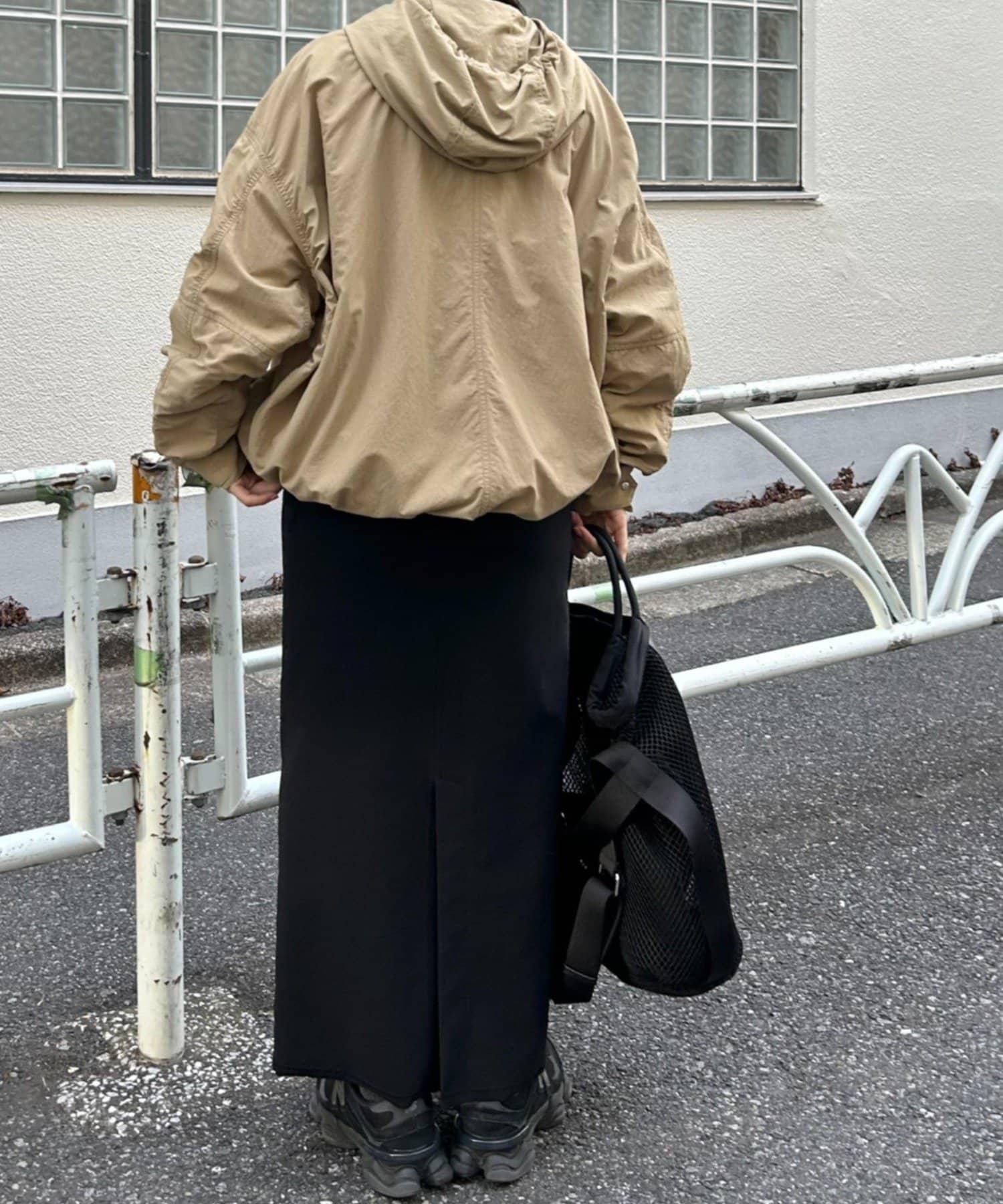 前後長度不同,後部可遮住臀部。下襬用抽繩收攏,也可穿得更短。