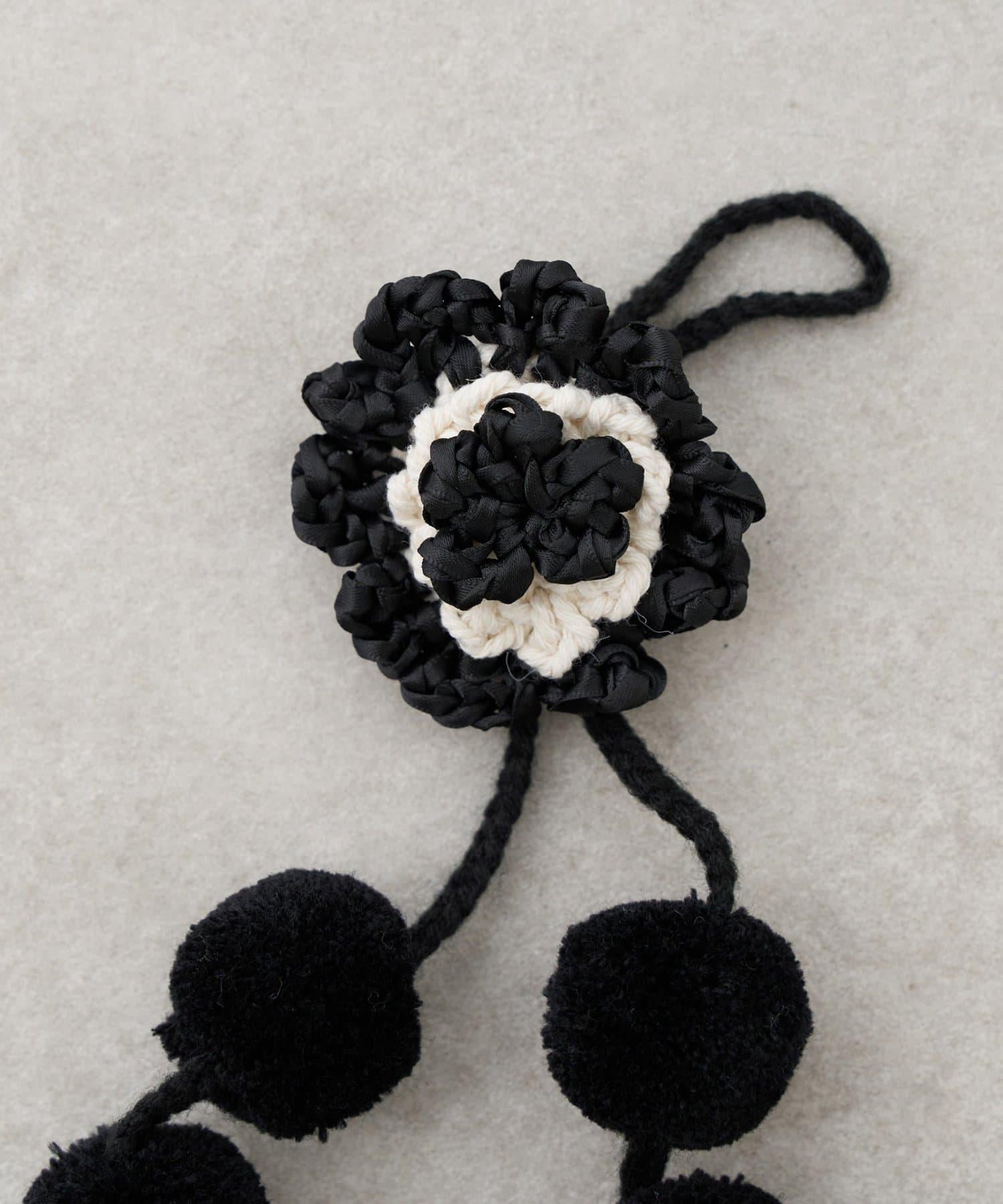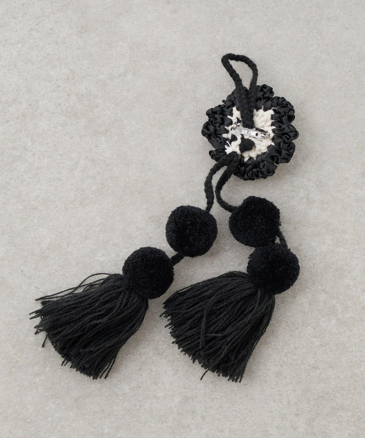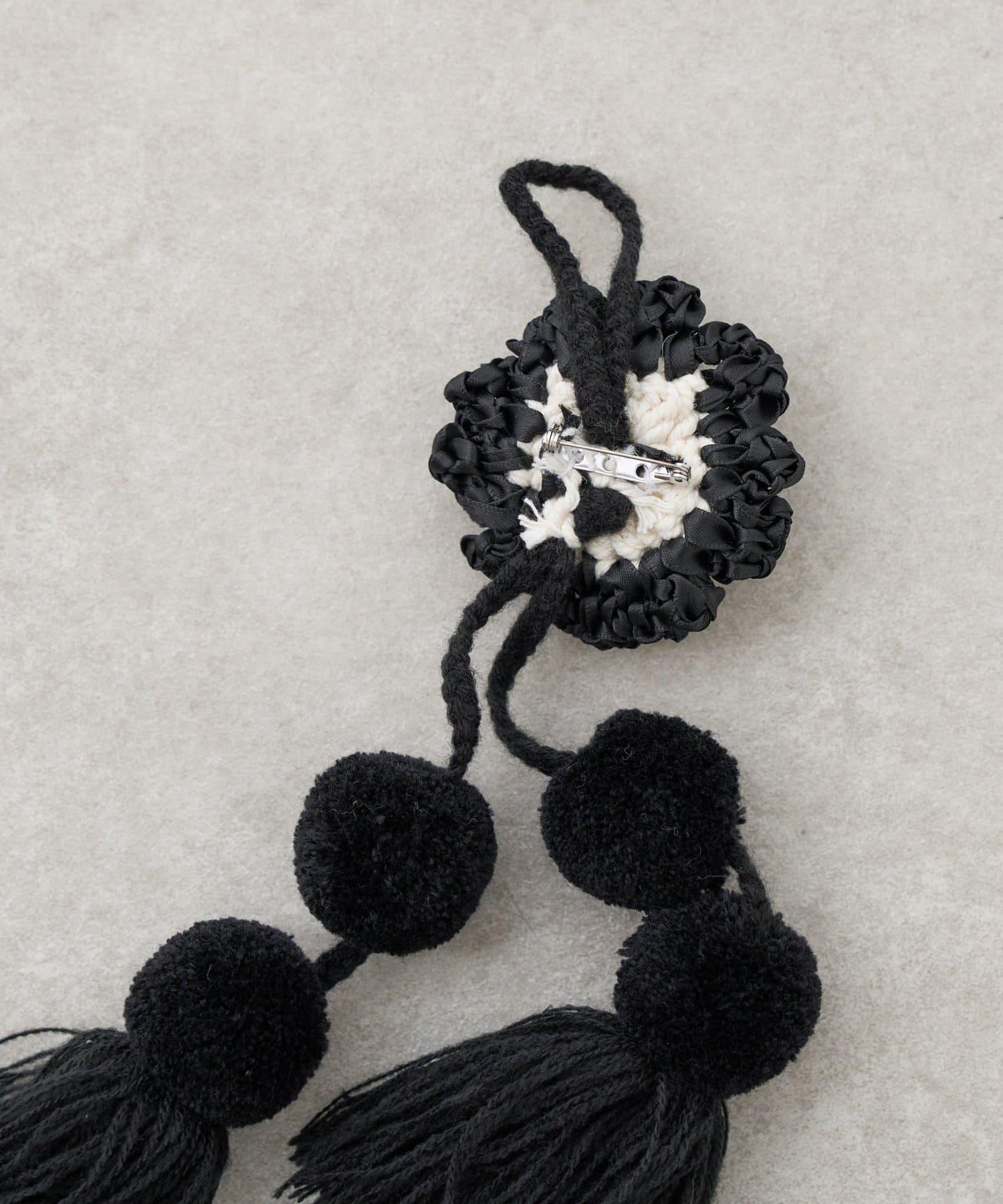 它有一個用絲帶編織成花朵形狀的掛飾,有兩種固定方式:繞圈或用胸針固定。