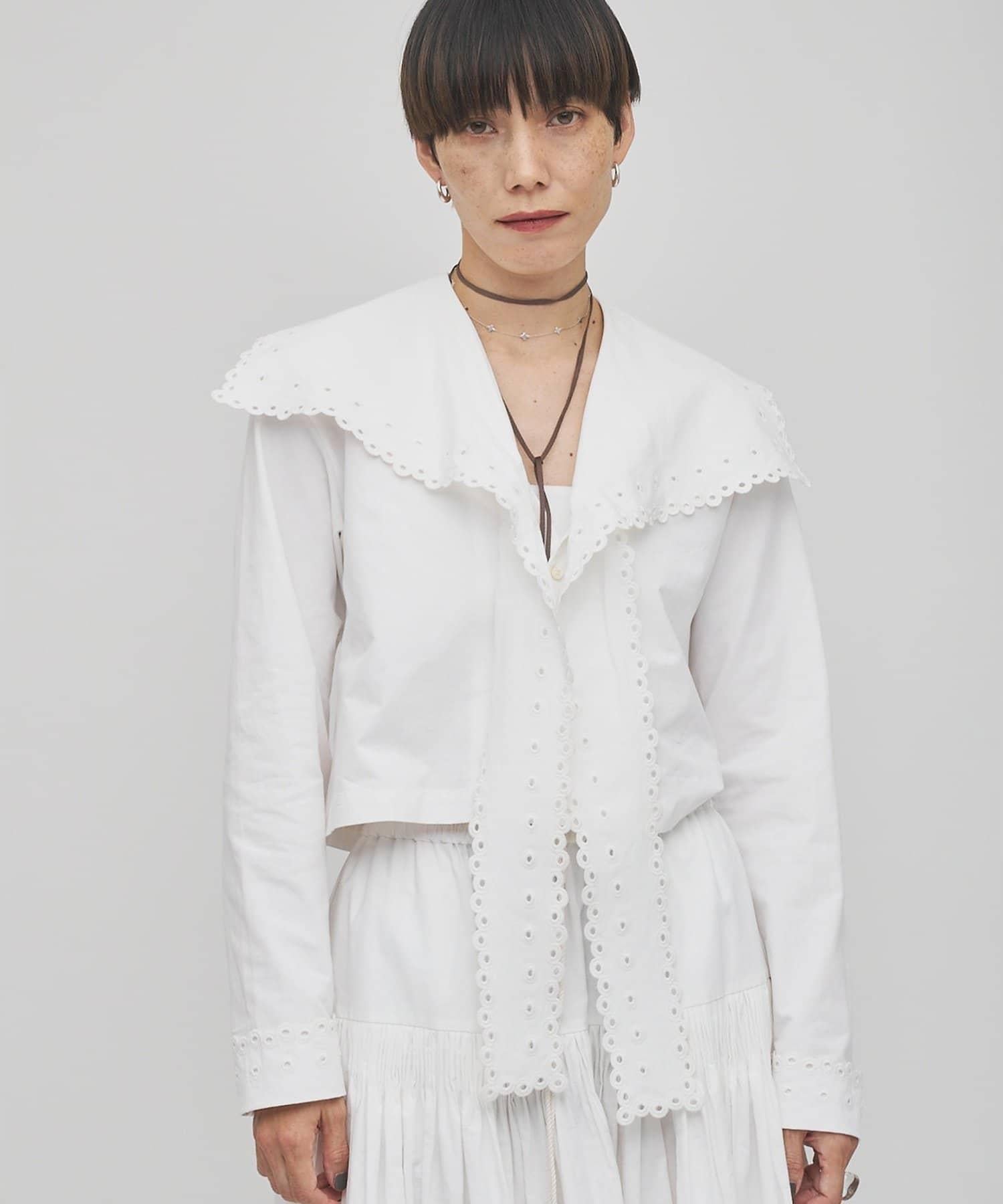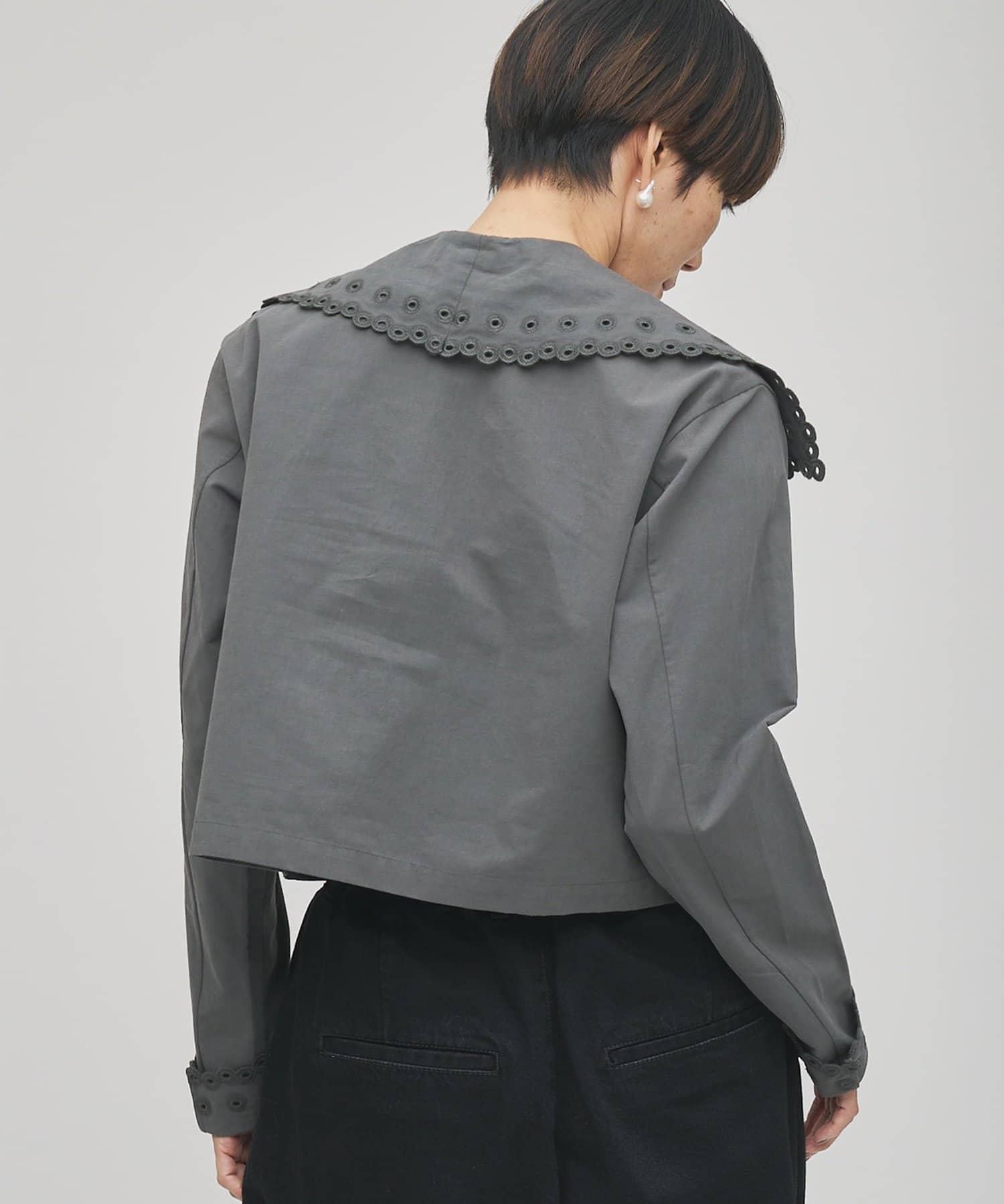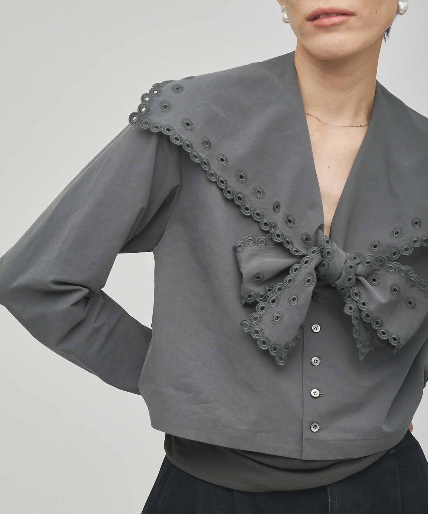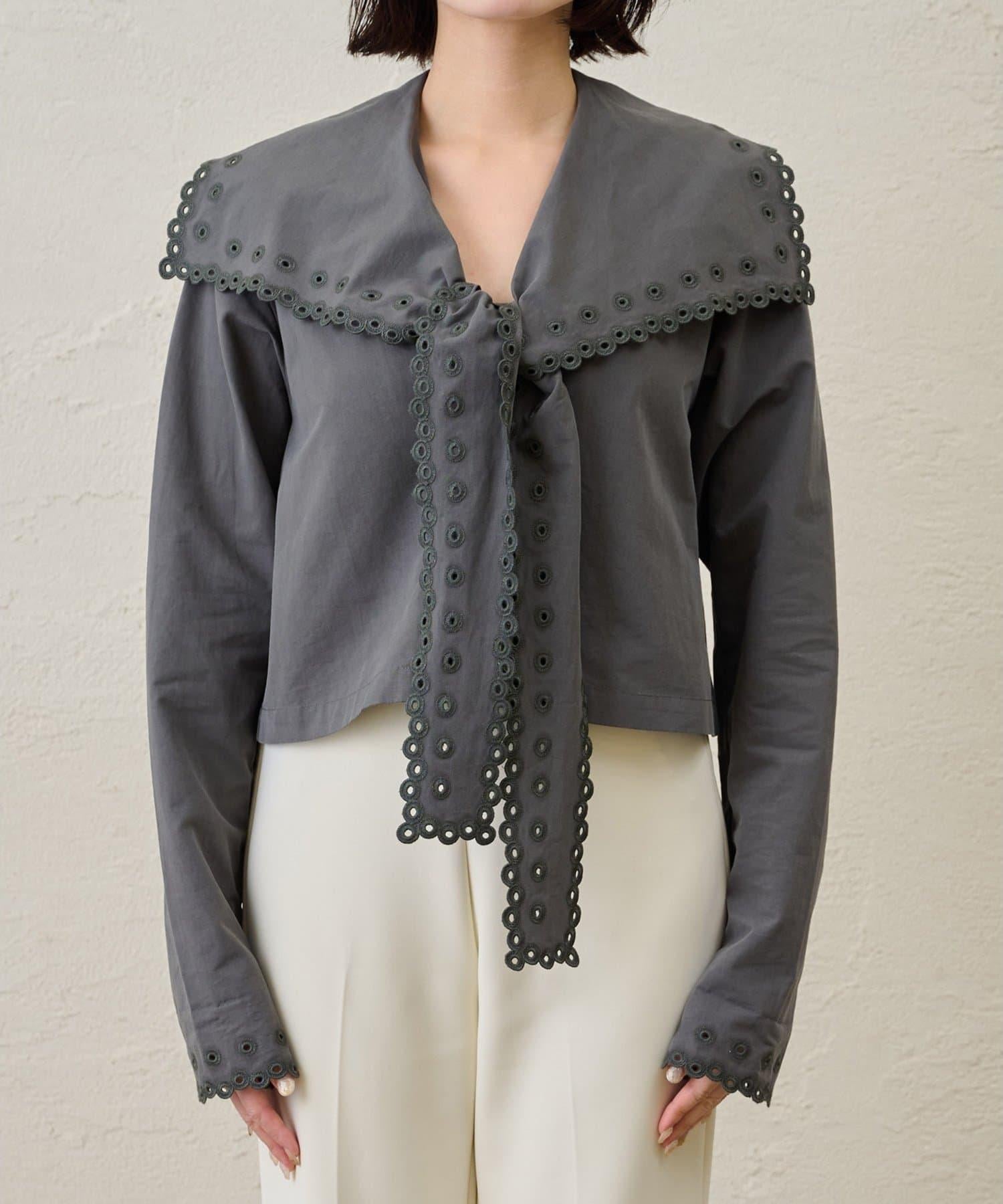 大領和領帶的設計共同營造出環繞臉部的迷人效果。