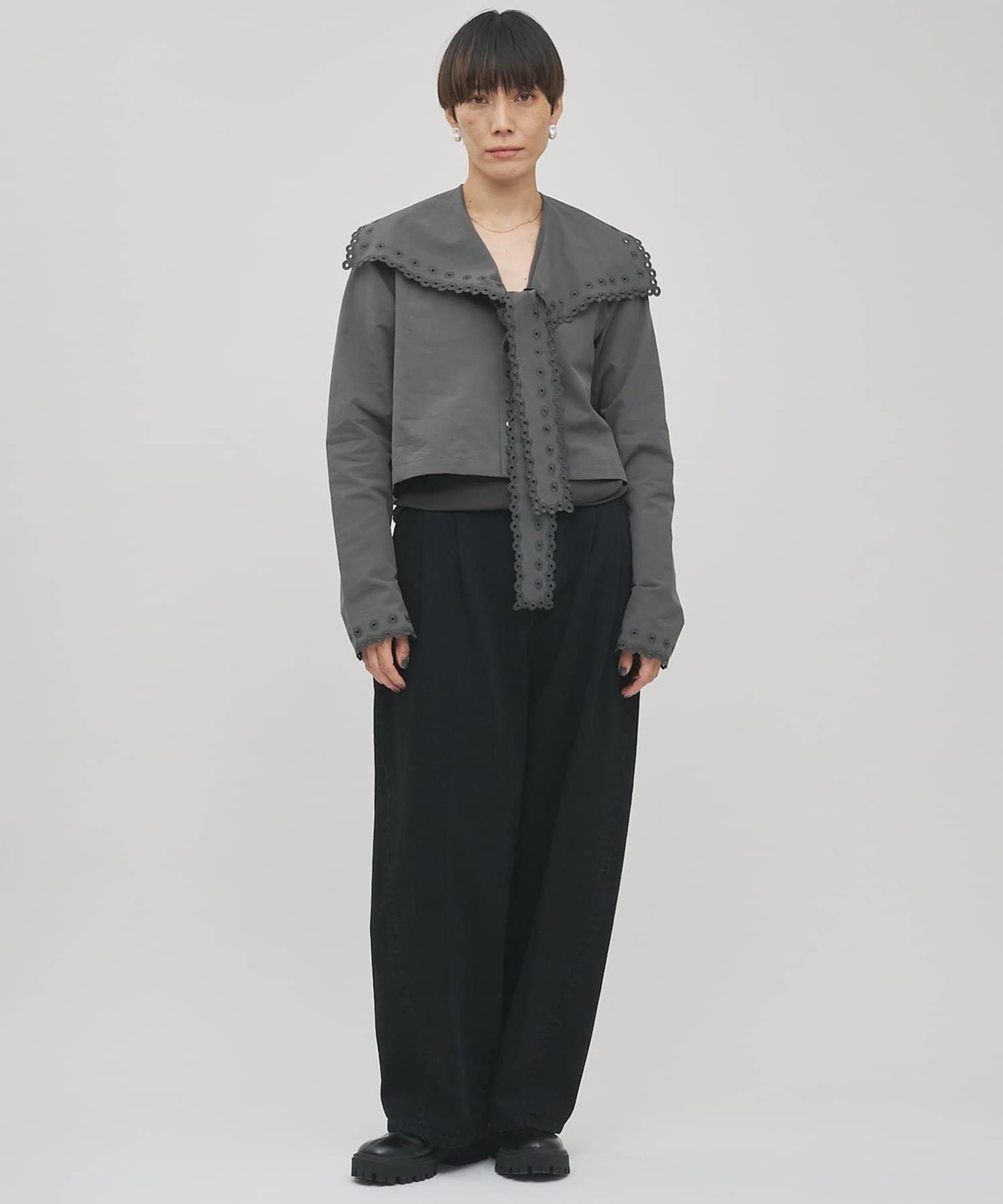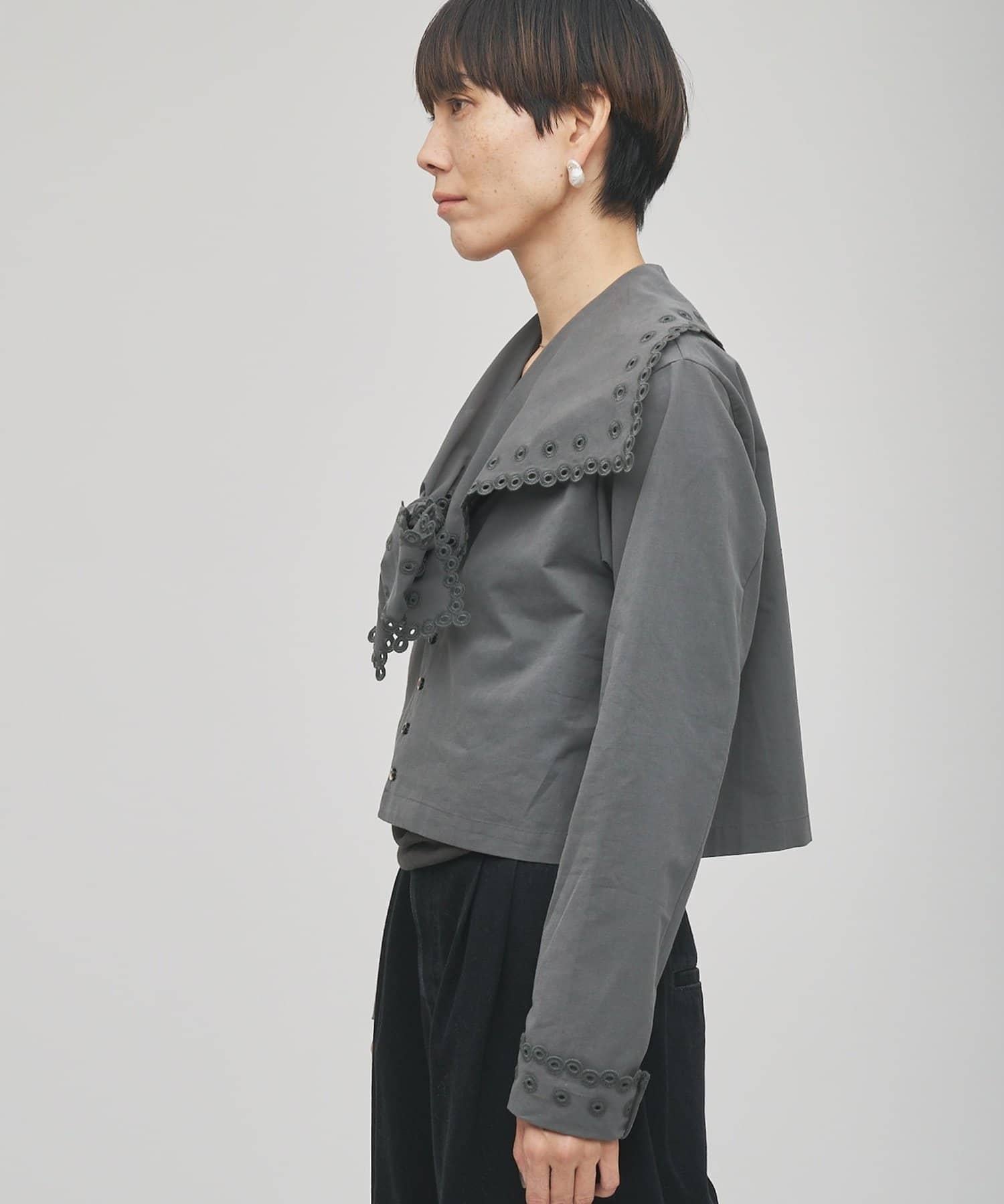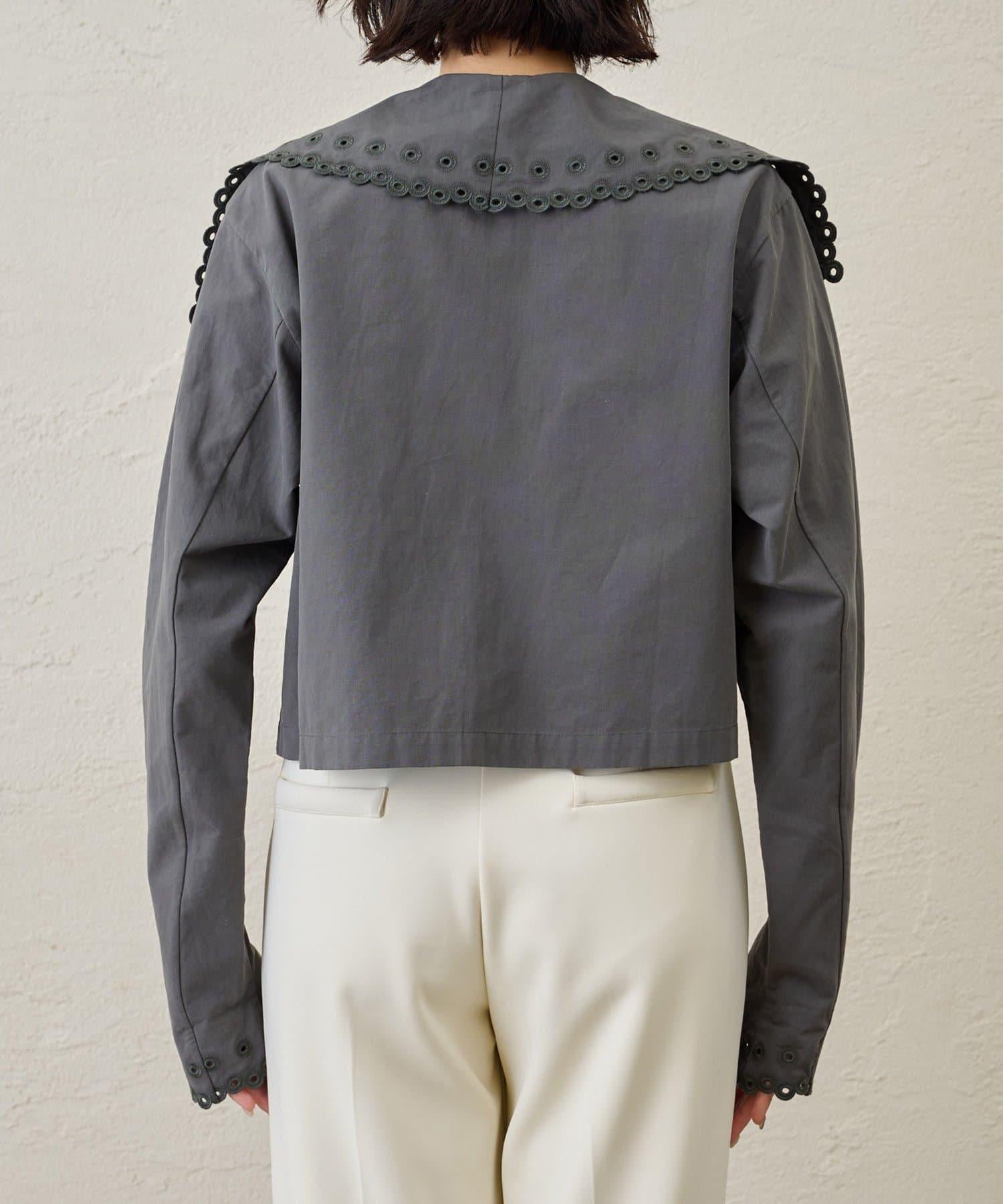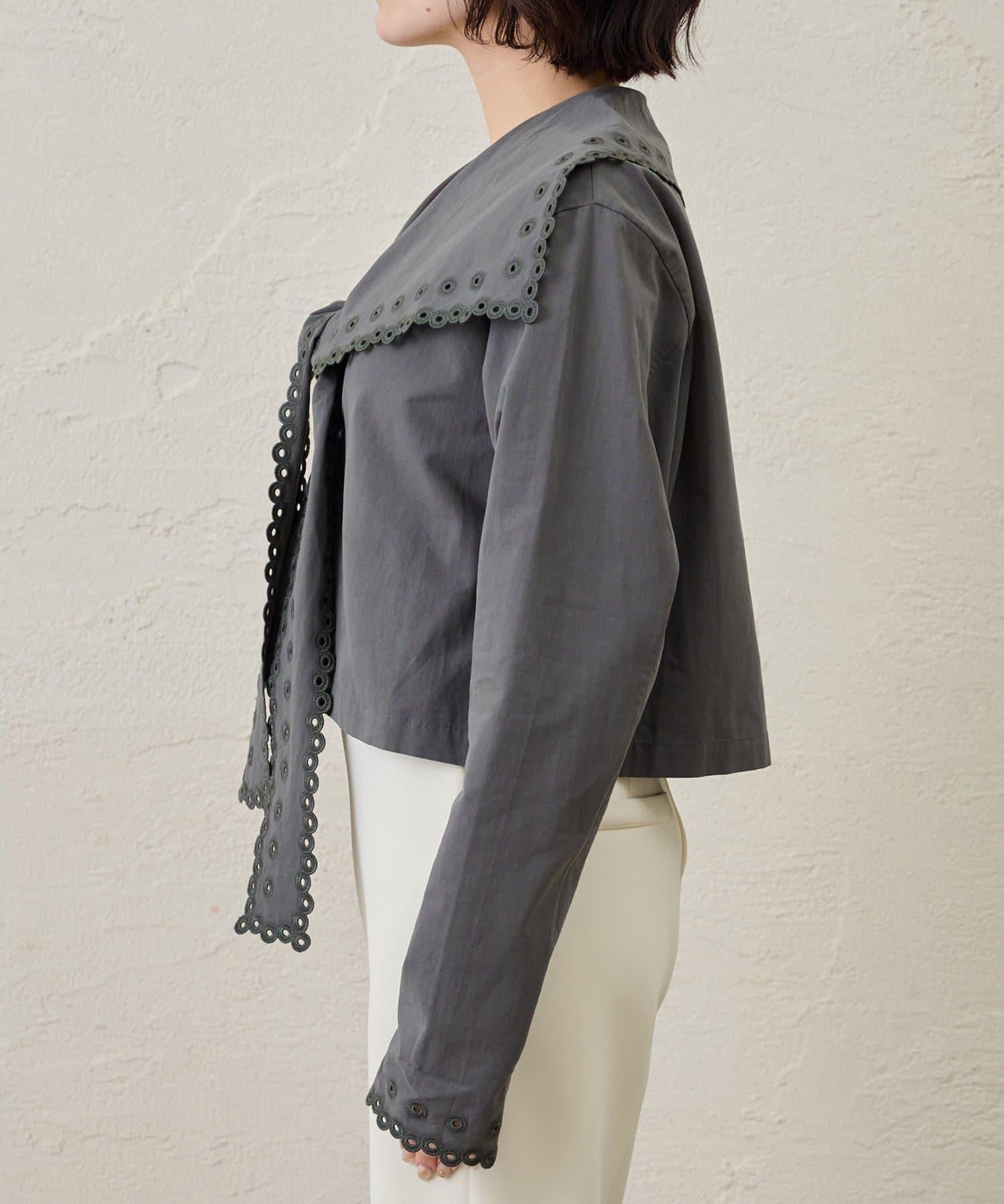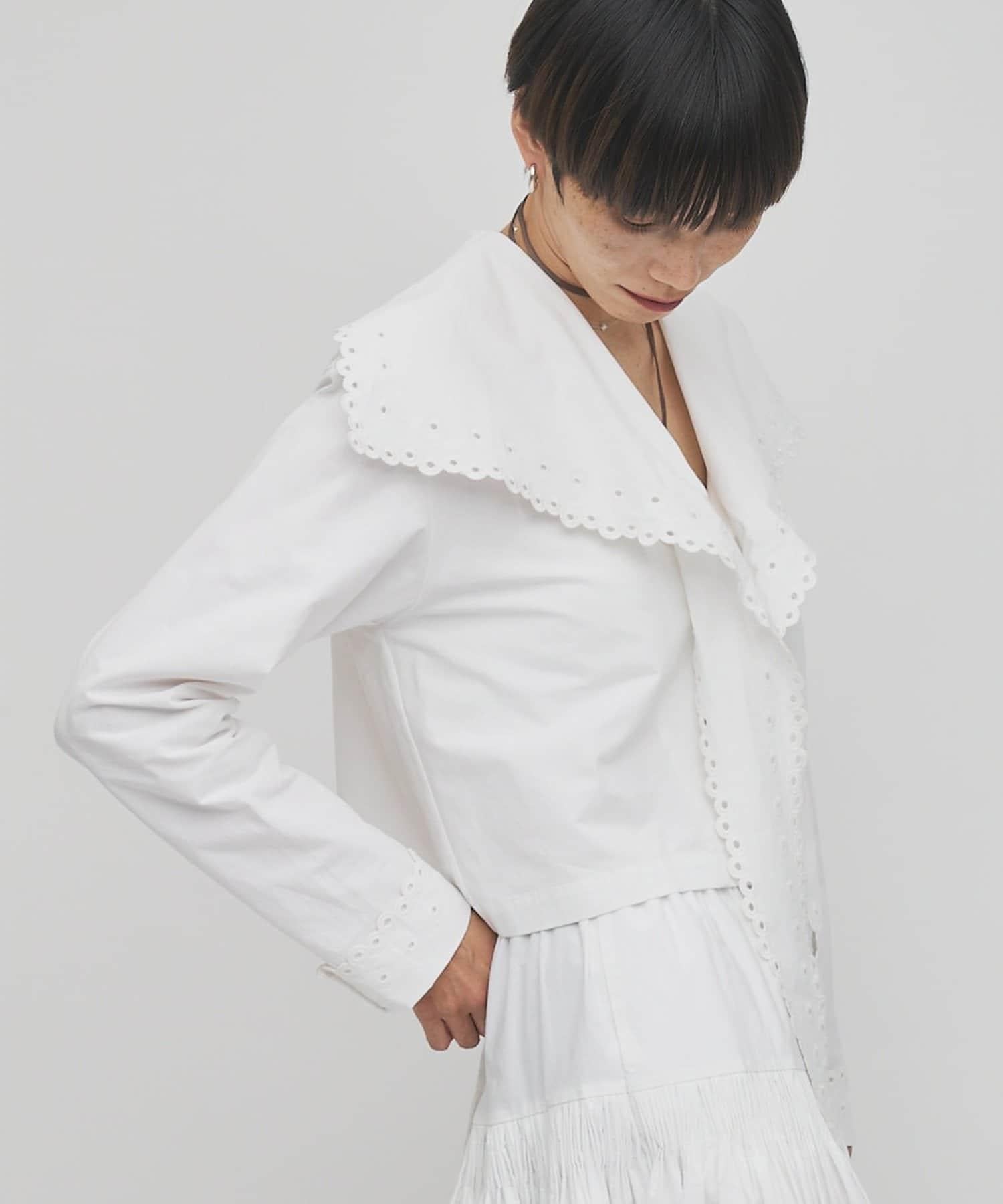 大領和領帶的設計共同營造出環繞臉部的迷人效果。