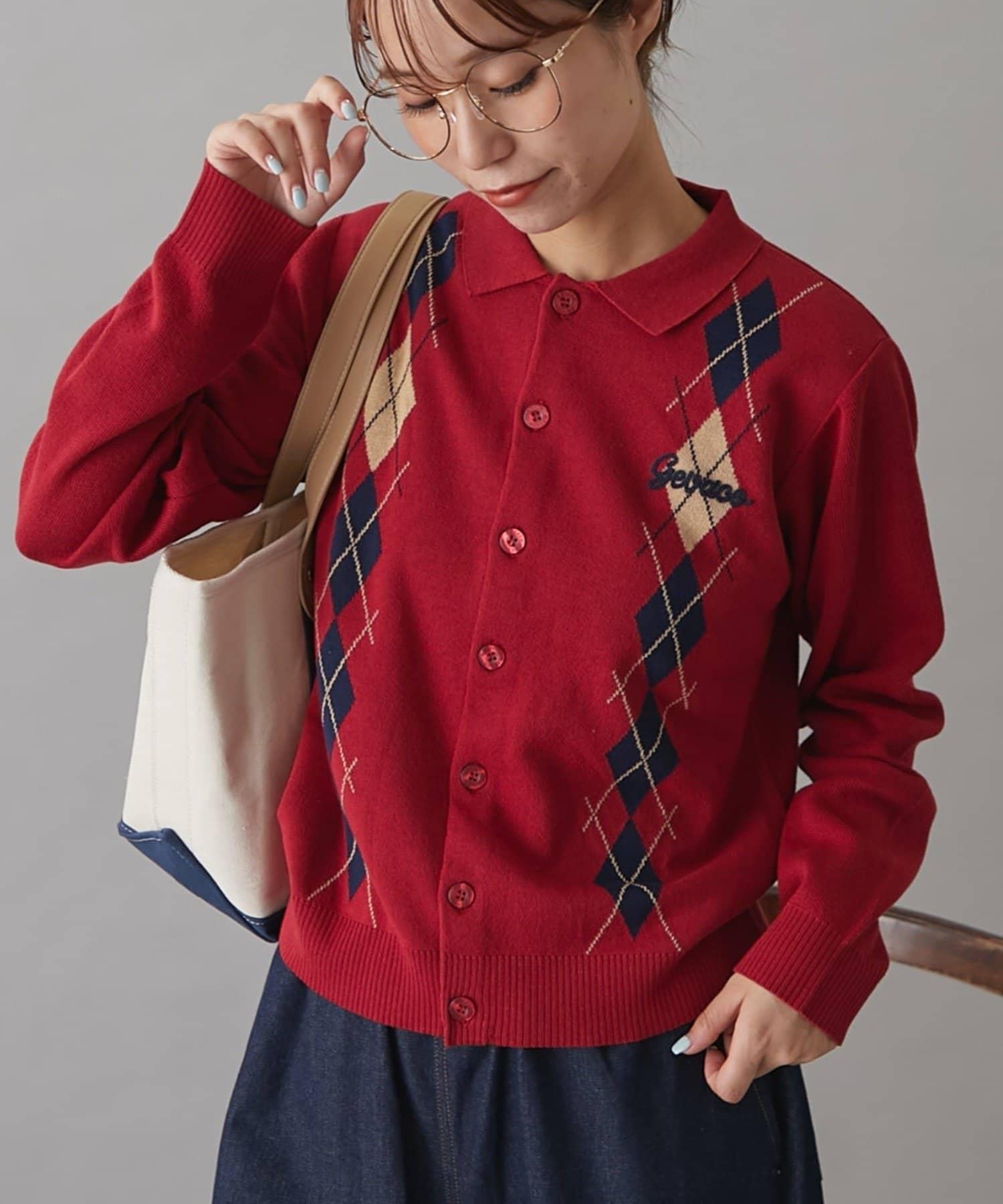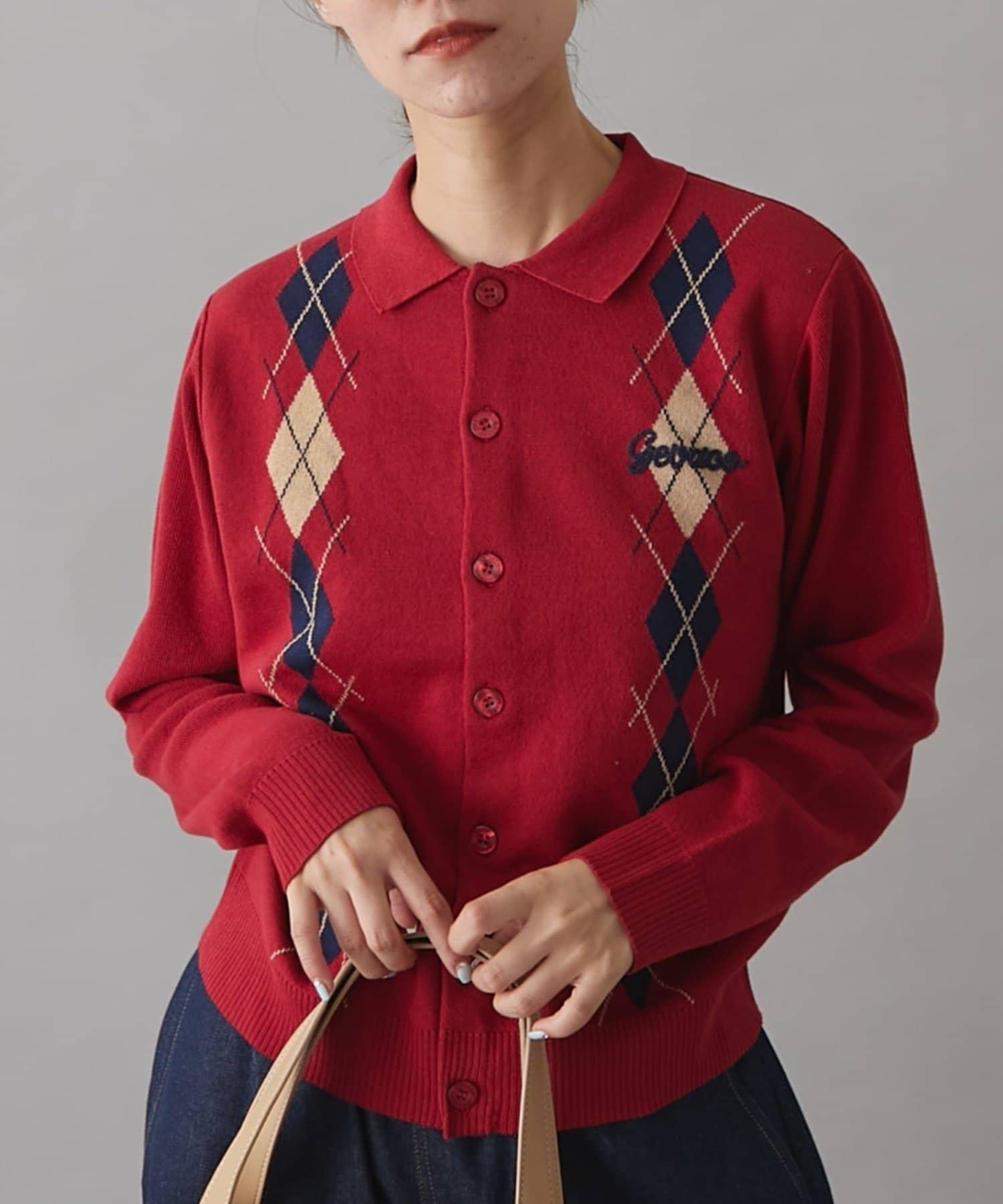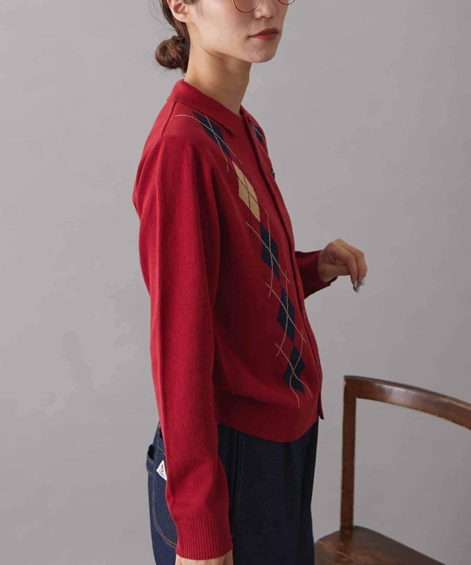 這款針織開衫以醒目的鮮紅色為基調,配以菱格紋圖案。