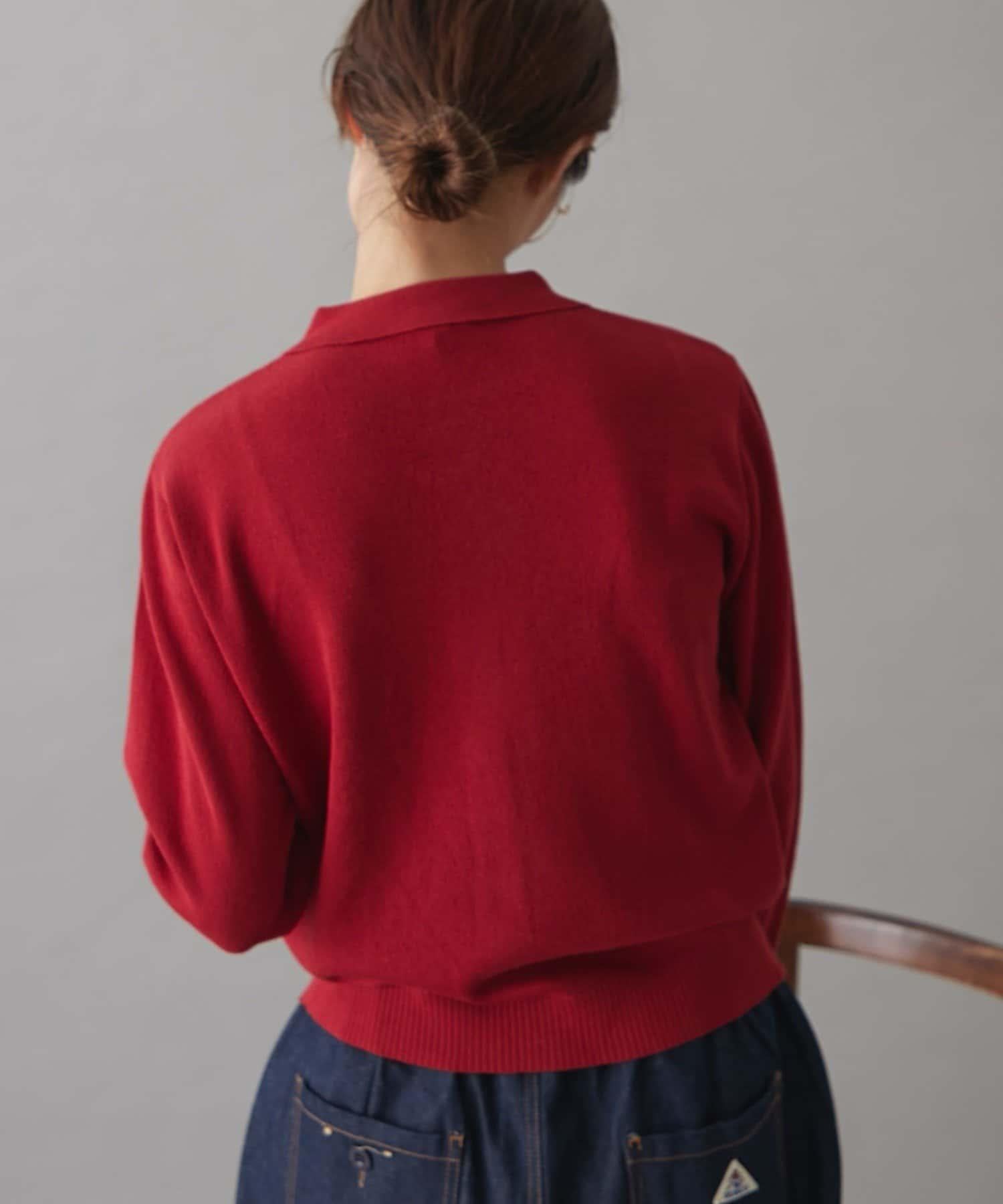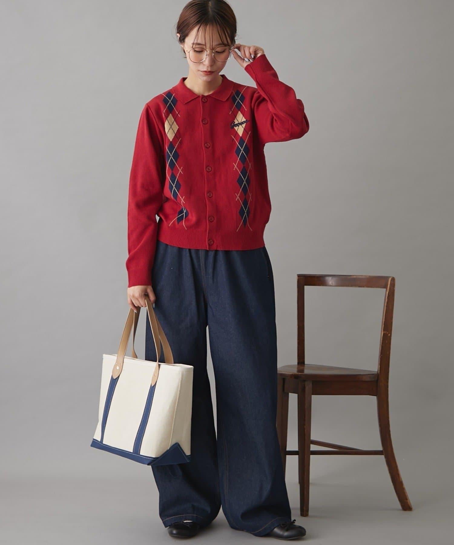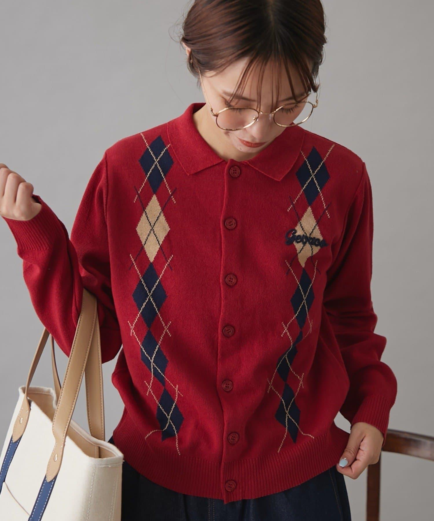 這款針織開衫以醒目的鮮紅色為基調,配以菱格紋圖案。