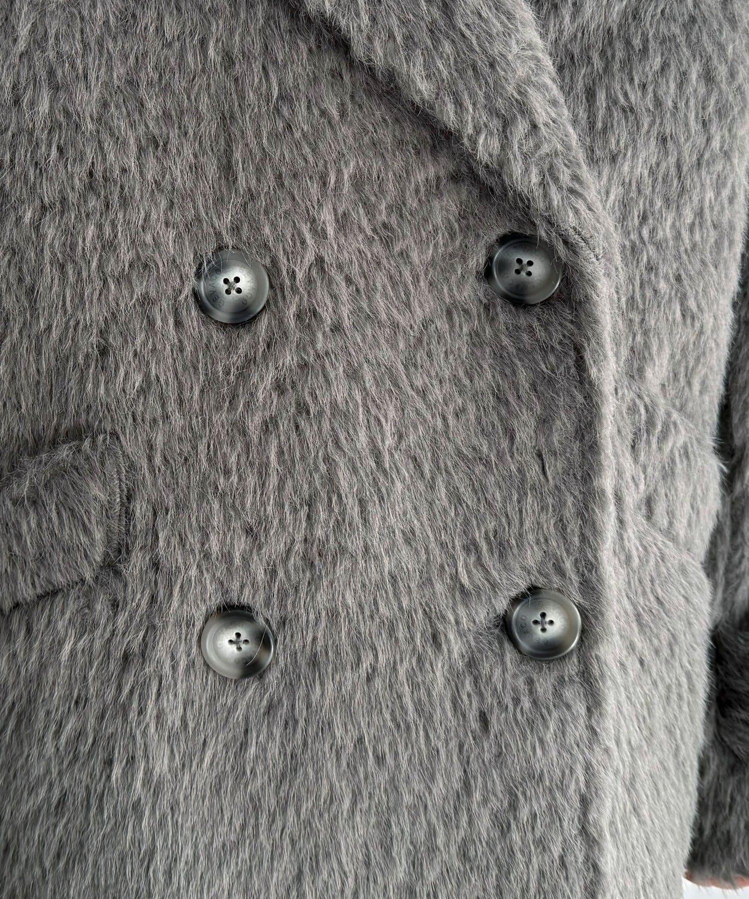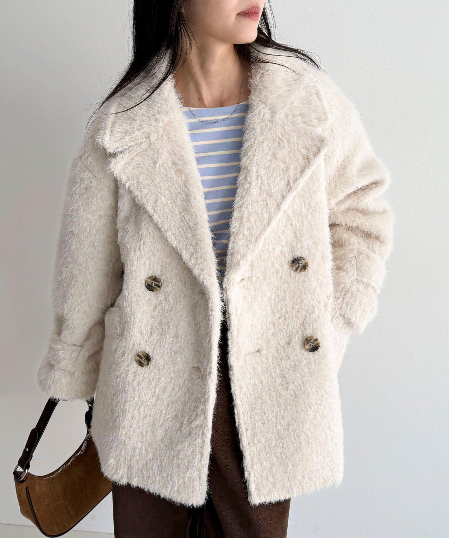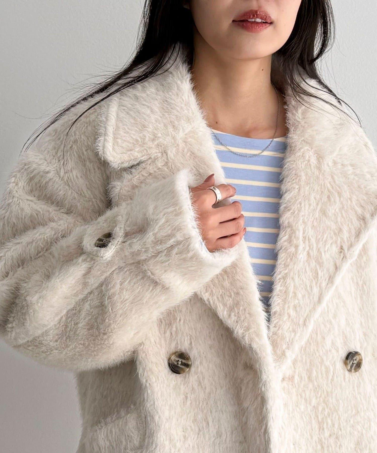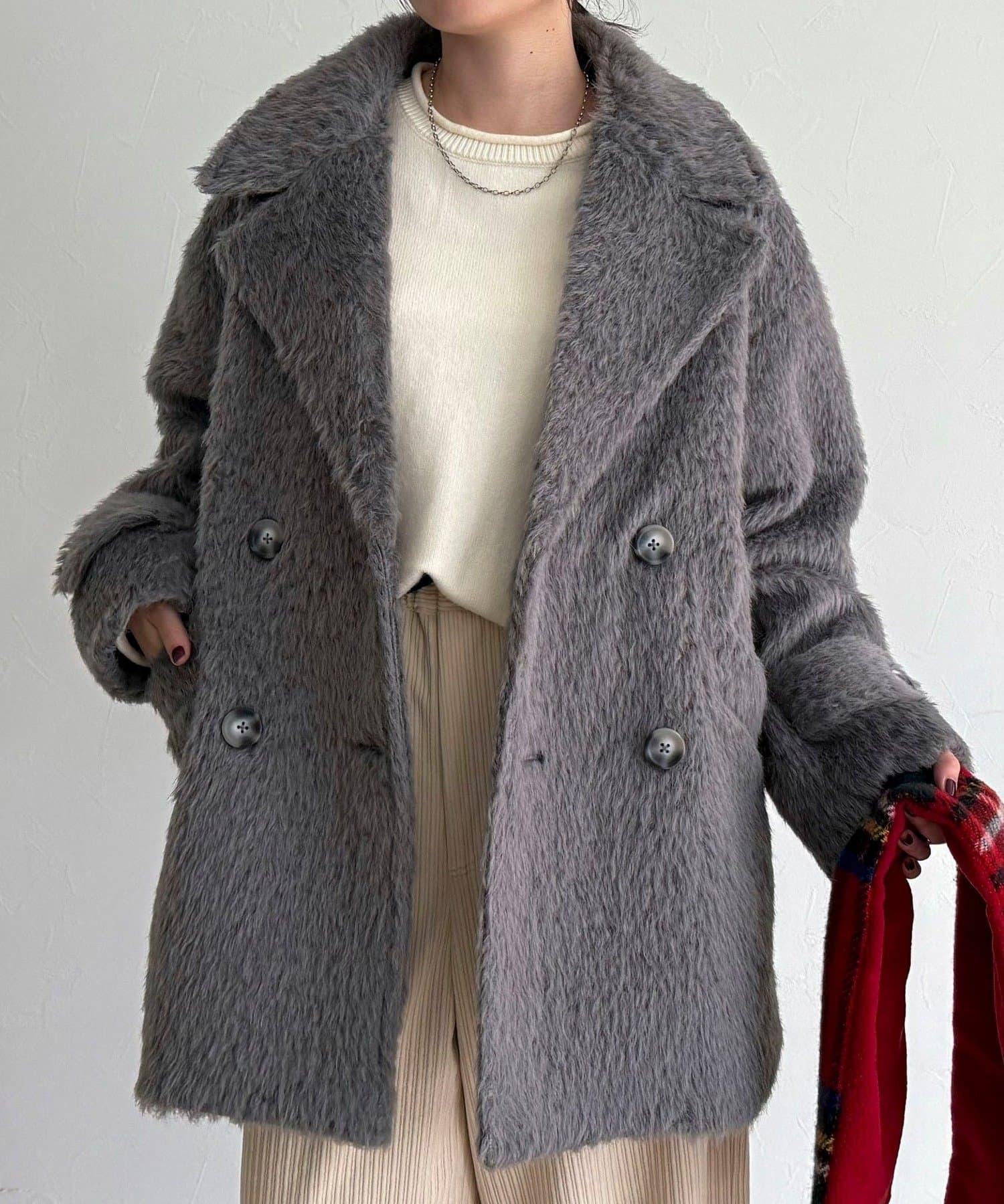 這款 P 形大衣採用蓬鬆的絨毛面料,增強了季節感。