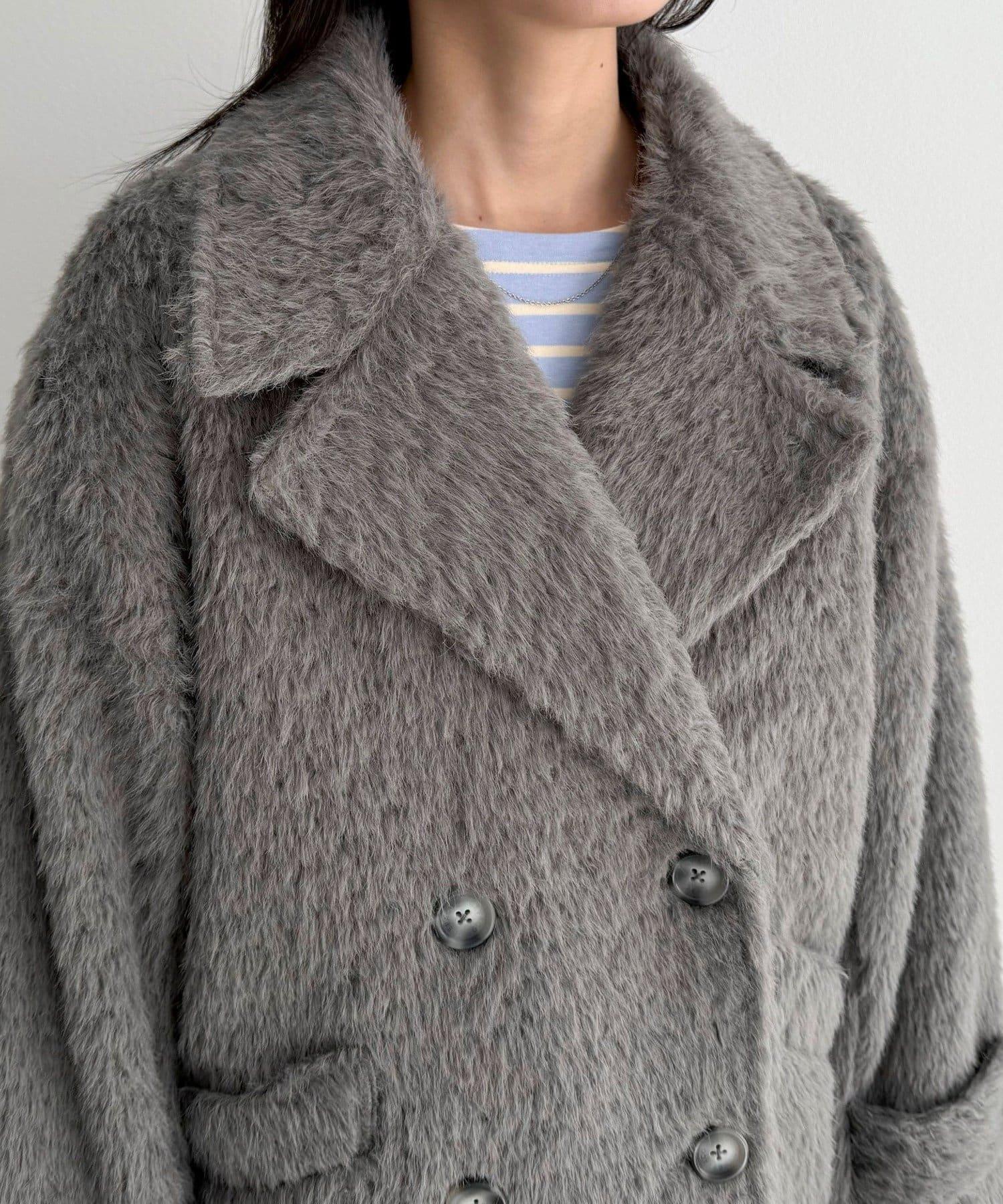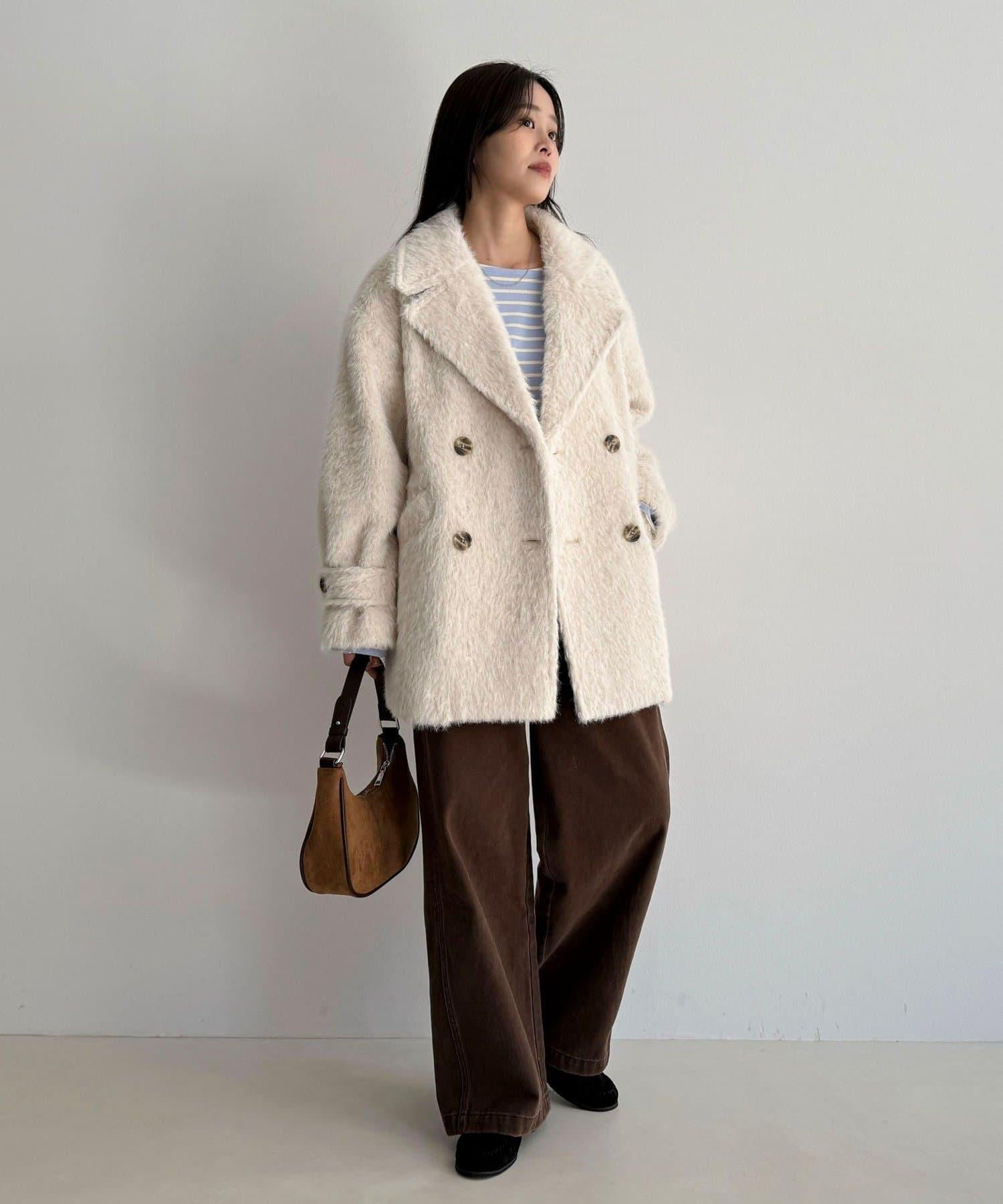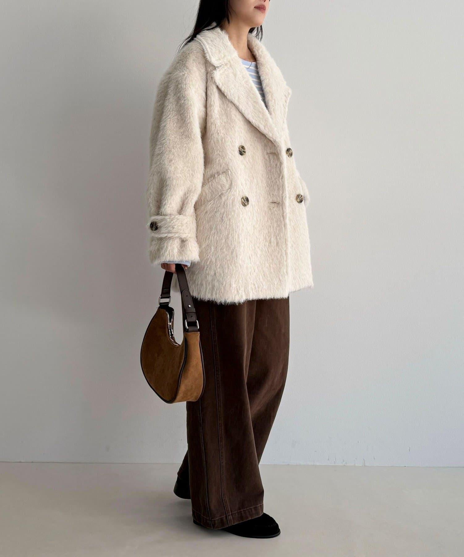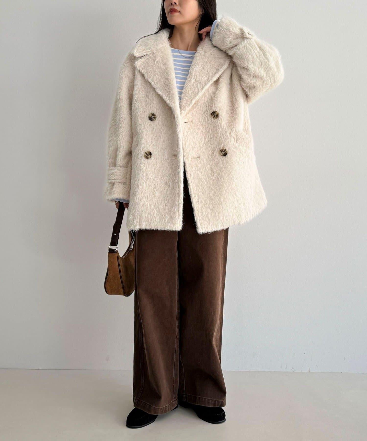 這款 P 形大衣採用蓬鬆的絨毛面料,增強了季節感。