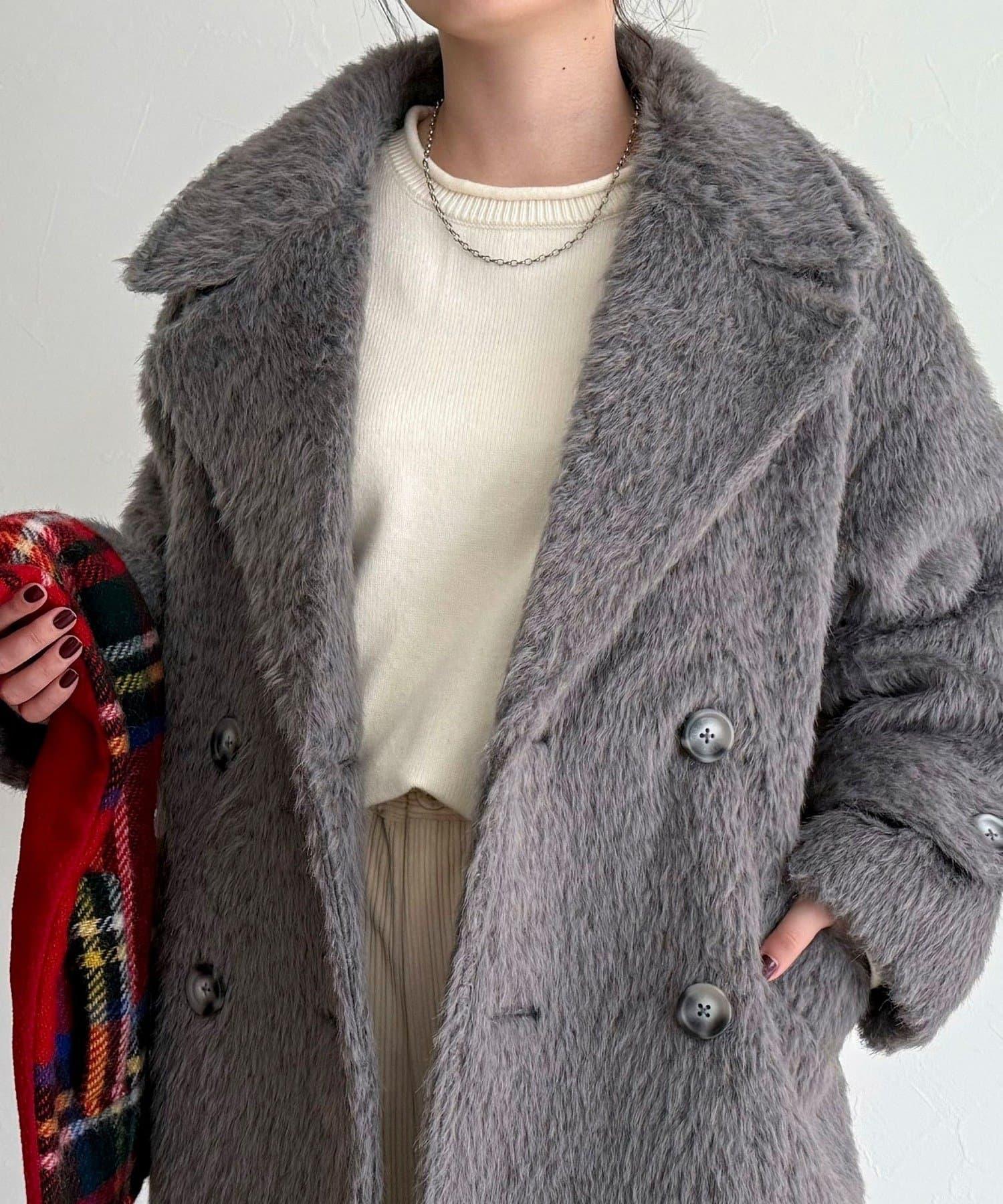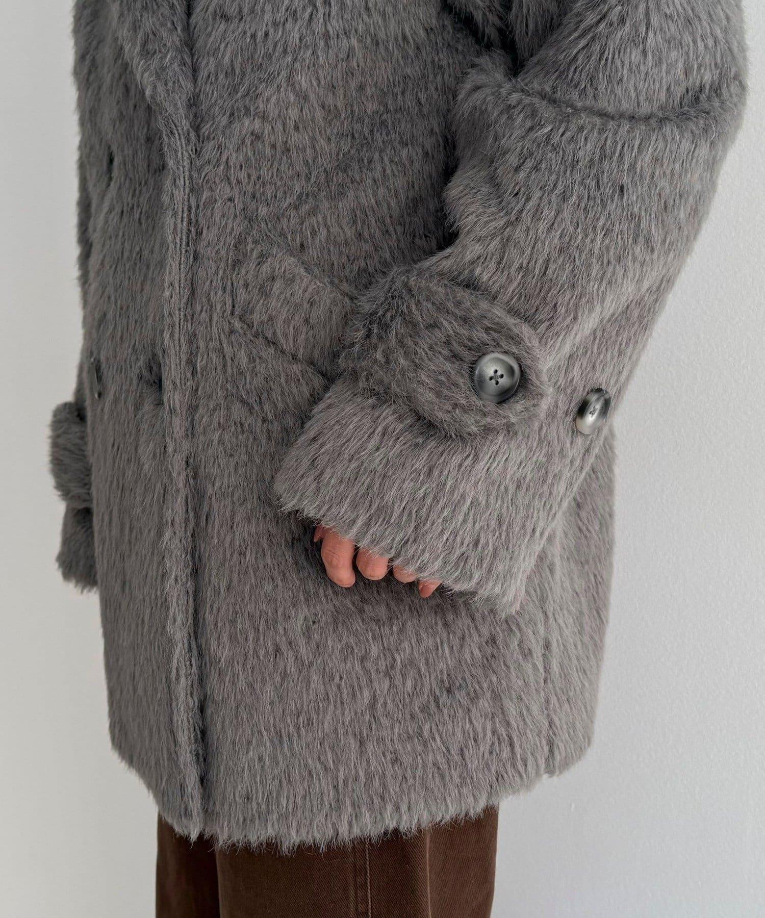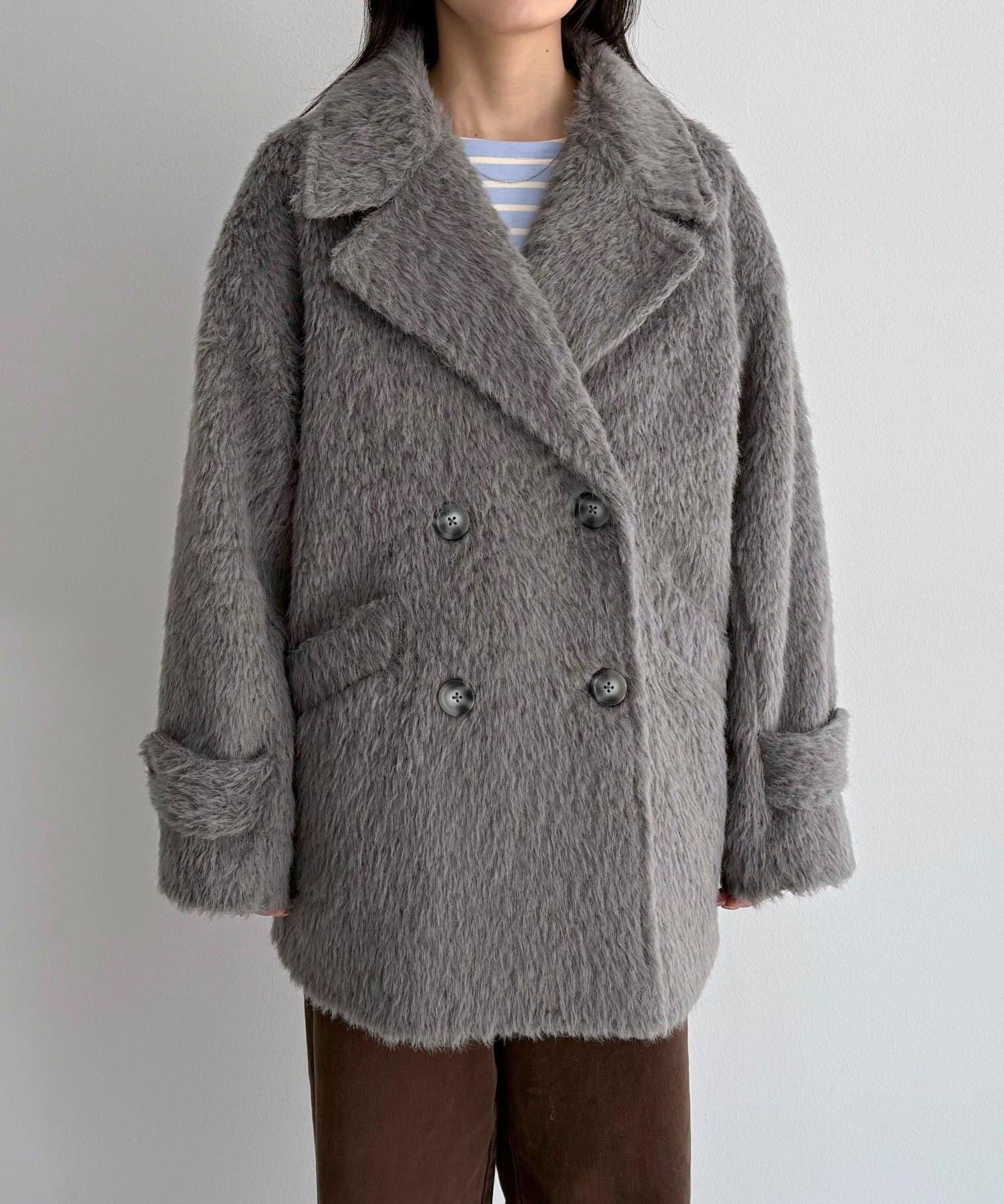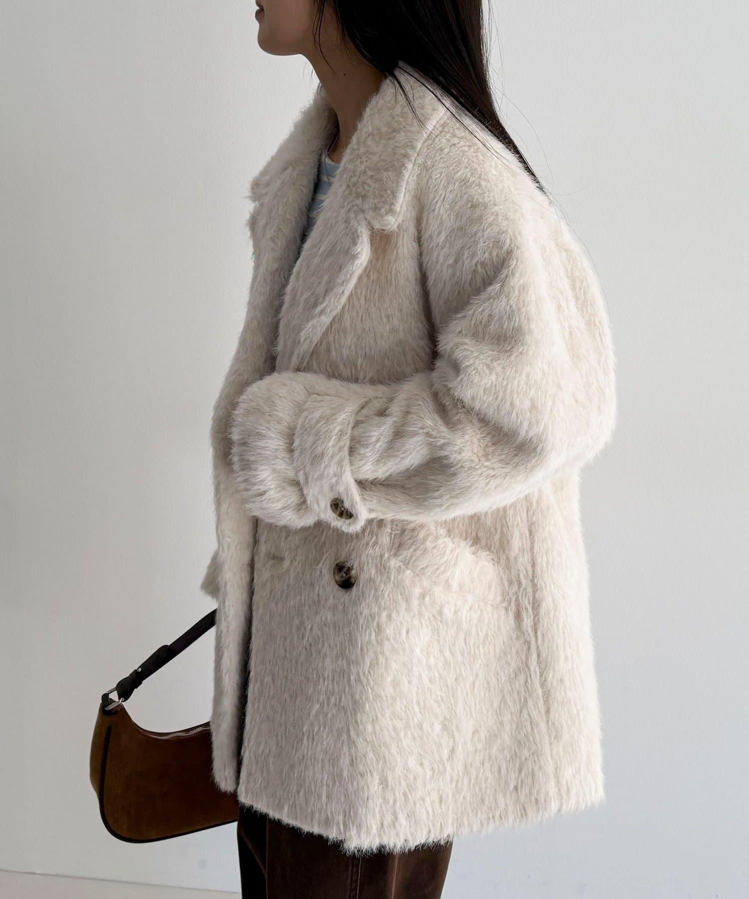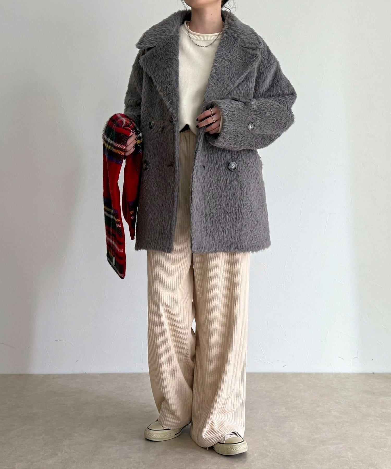 這款 P 形大衣採用蓬鬆的絨毛面料,增強了季節感。