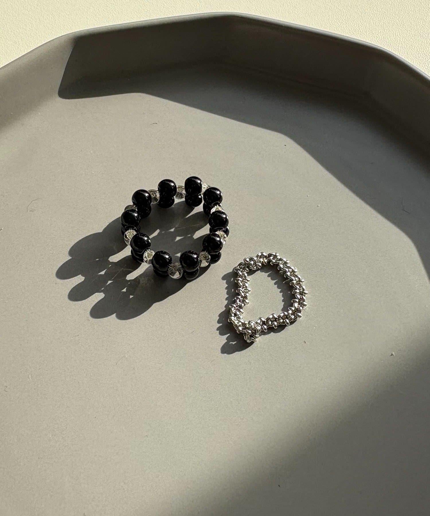 一套兩枚戒指:一枚配色可愛的成人珠子戒指和一枚金屬鏈戒指。