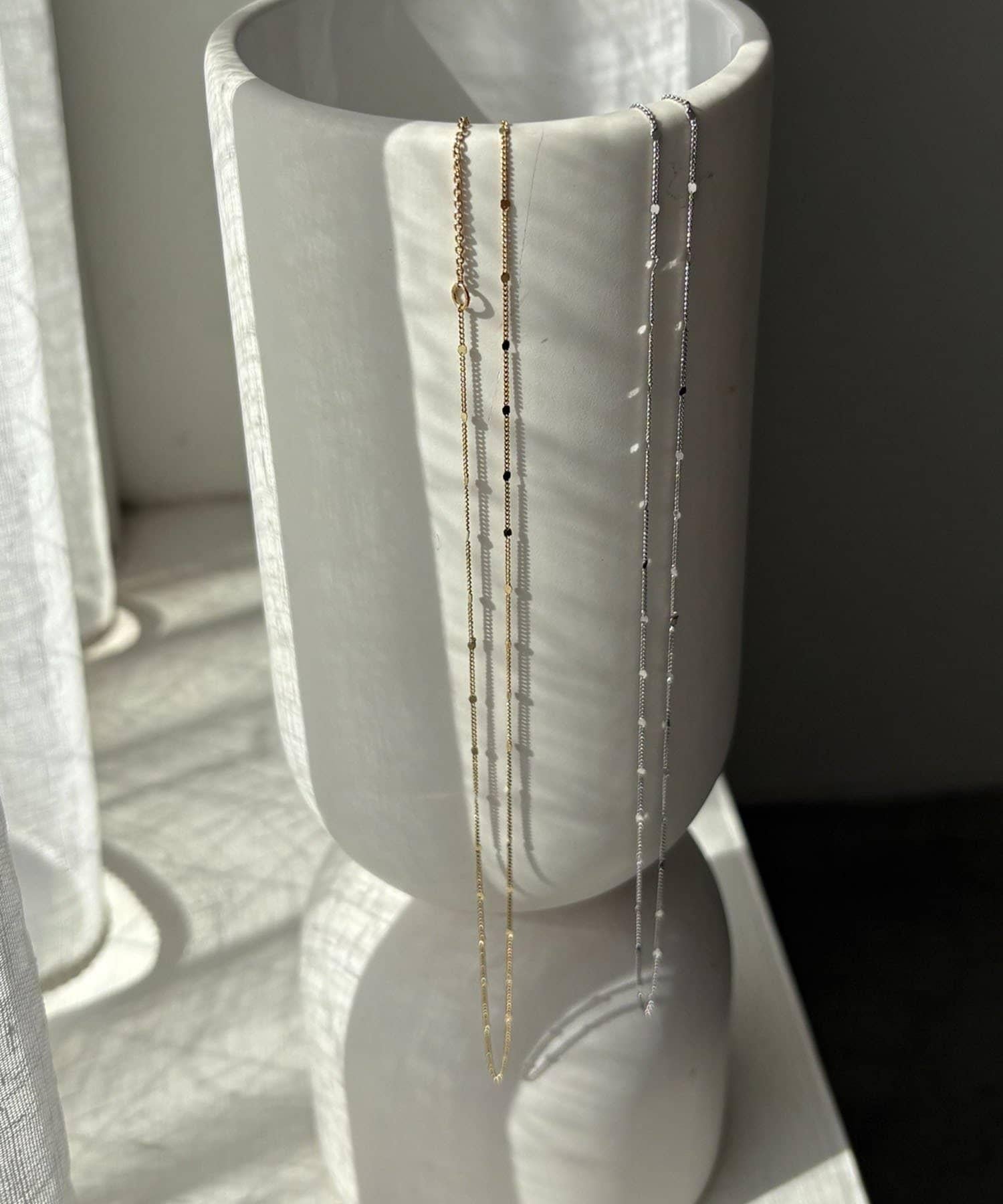 精緻的鏈條項鍊在燈光下熠熠生輝。