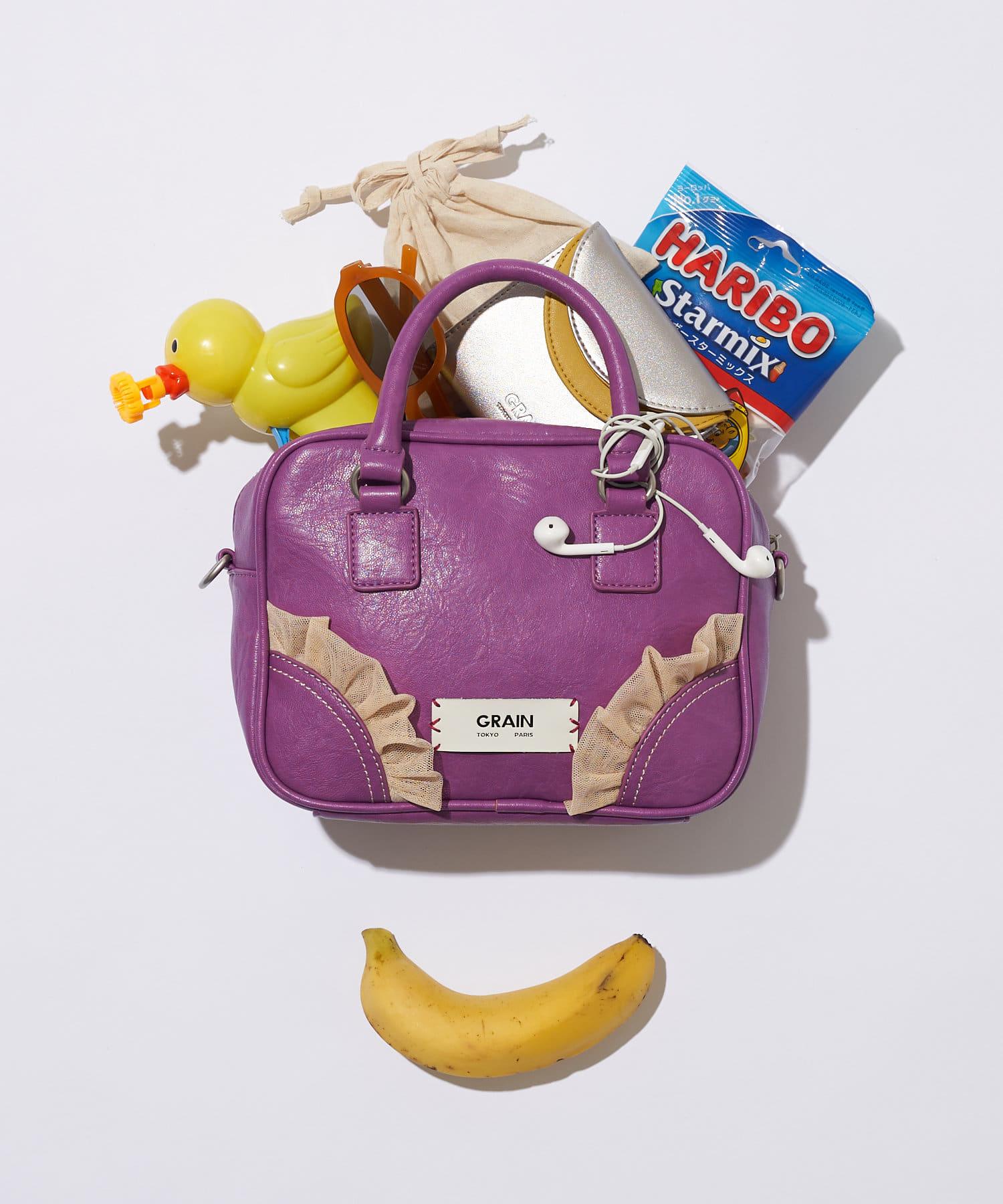 這款迷你波士頓包採用經典的合成皮革製成,薄紗褶邊增添了幾分俏皮。