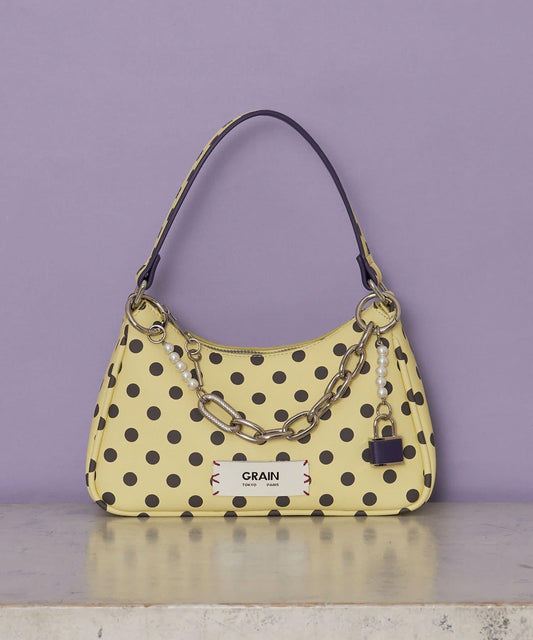 一款帶有可愛圓點圖案和掛鎖吊飾的手提包。