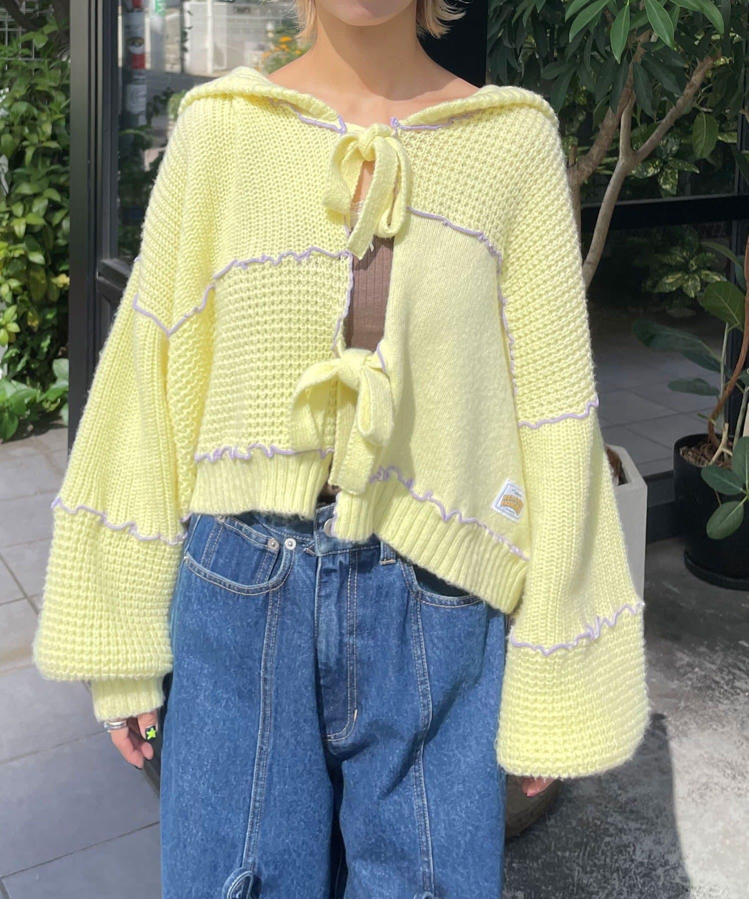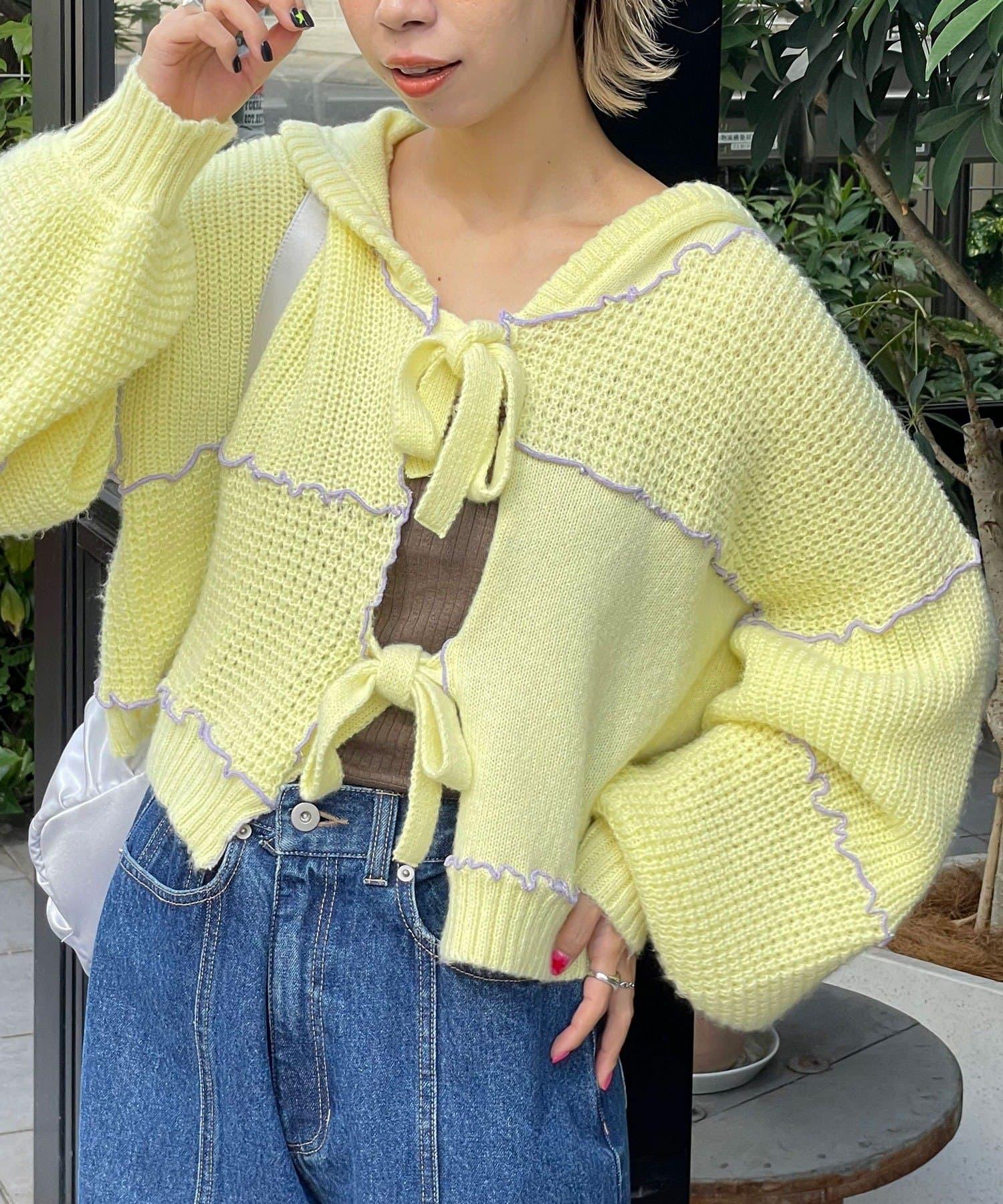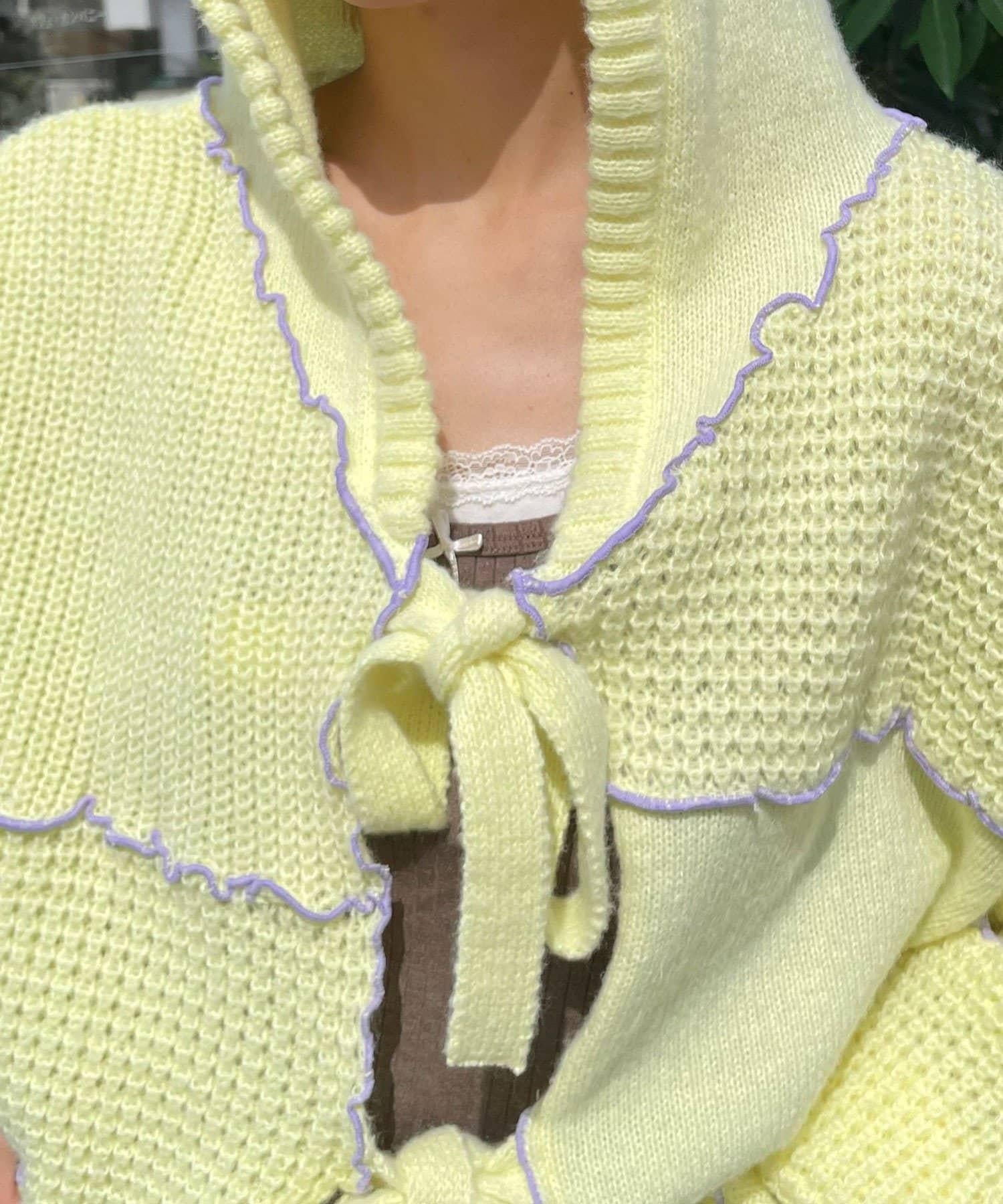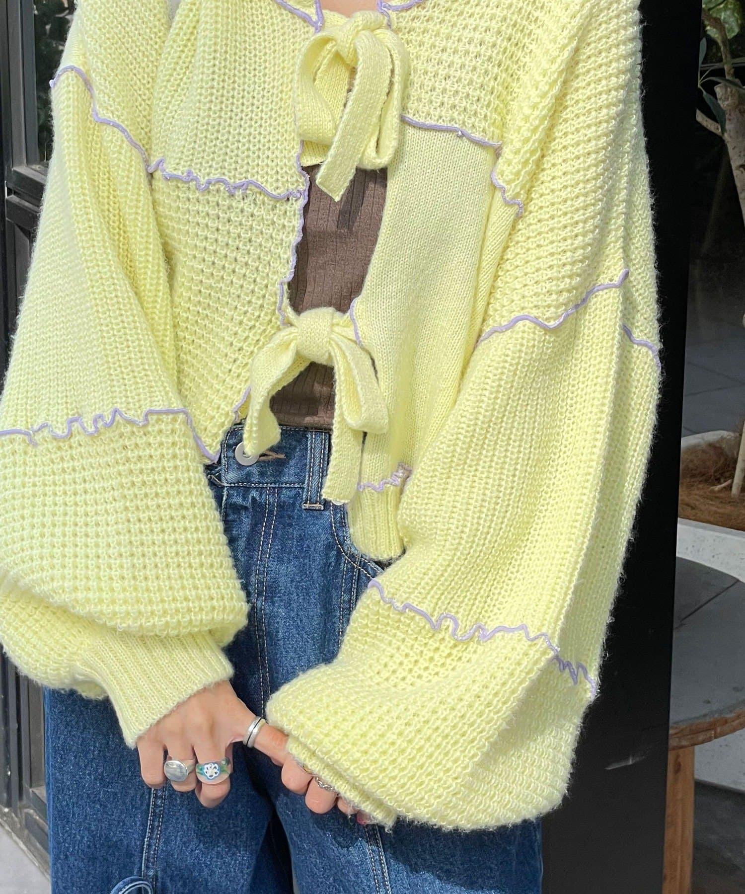 結合不同針織面料的立體設計和微妙的絲帶結為這款開衫增添了少女氣息。