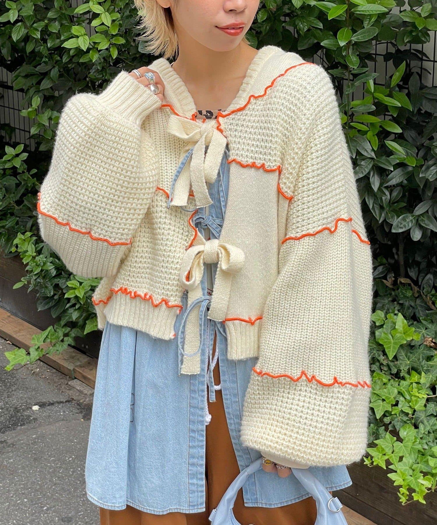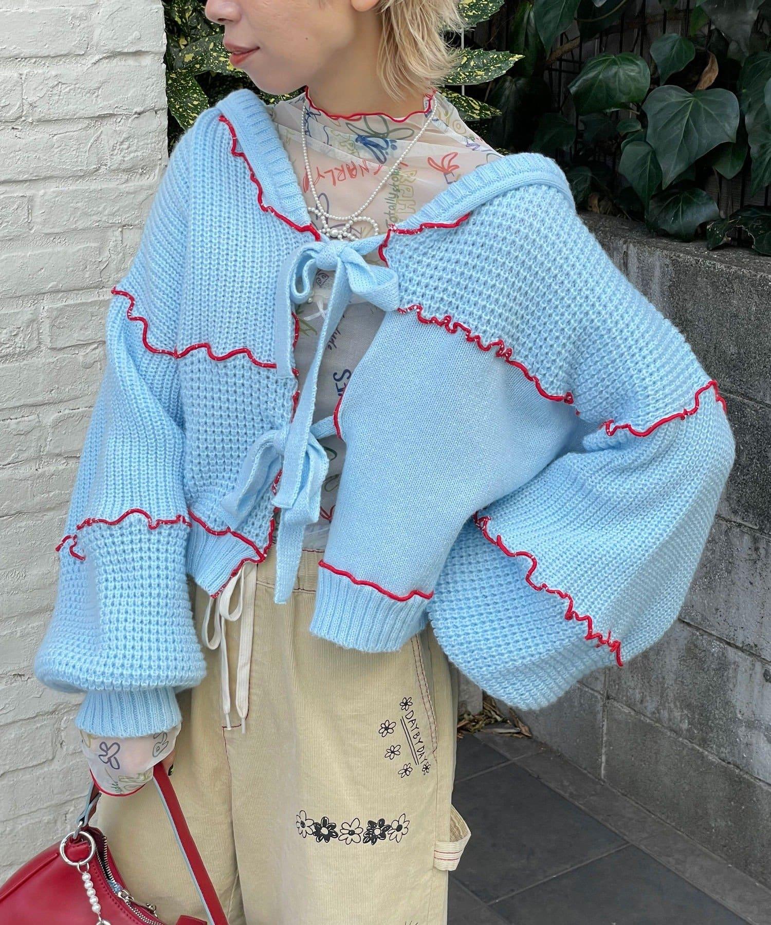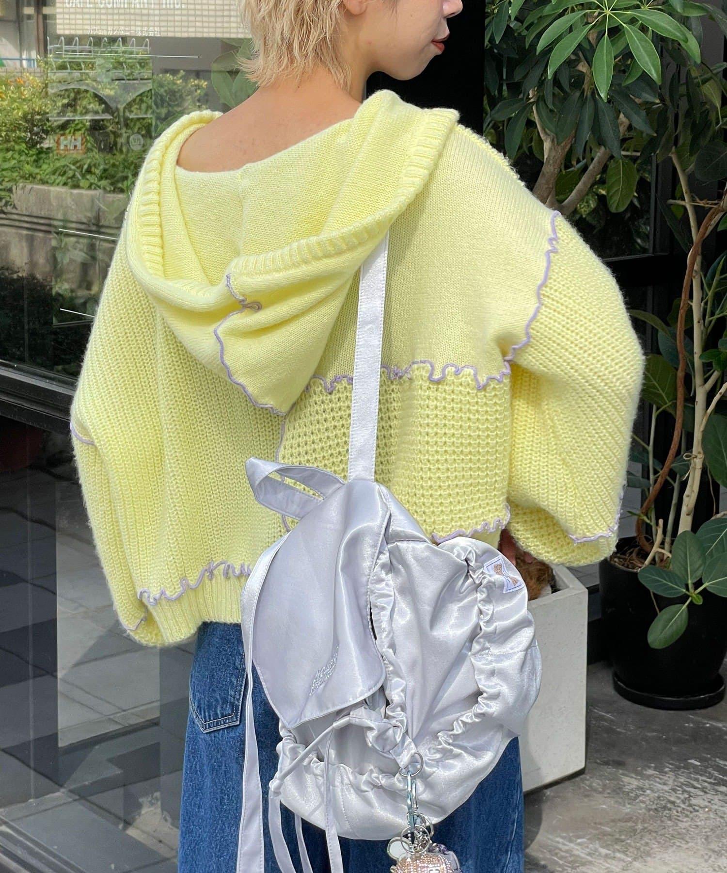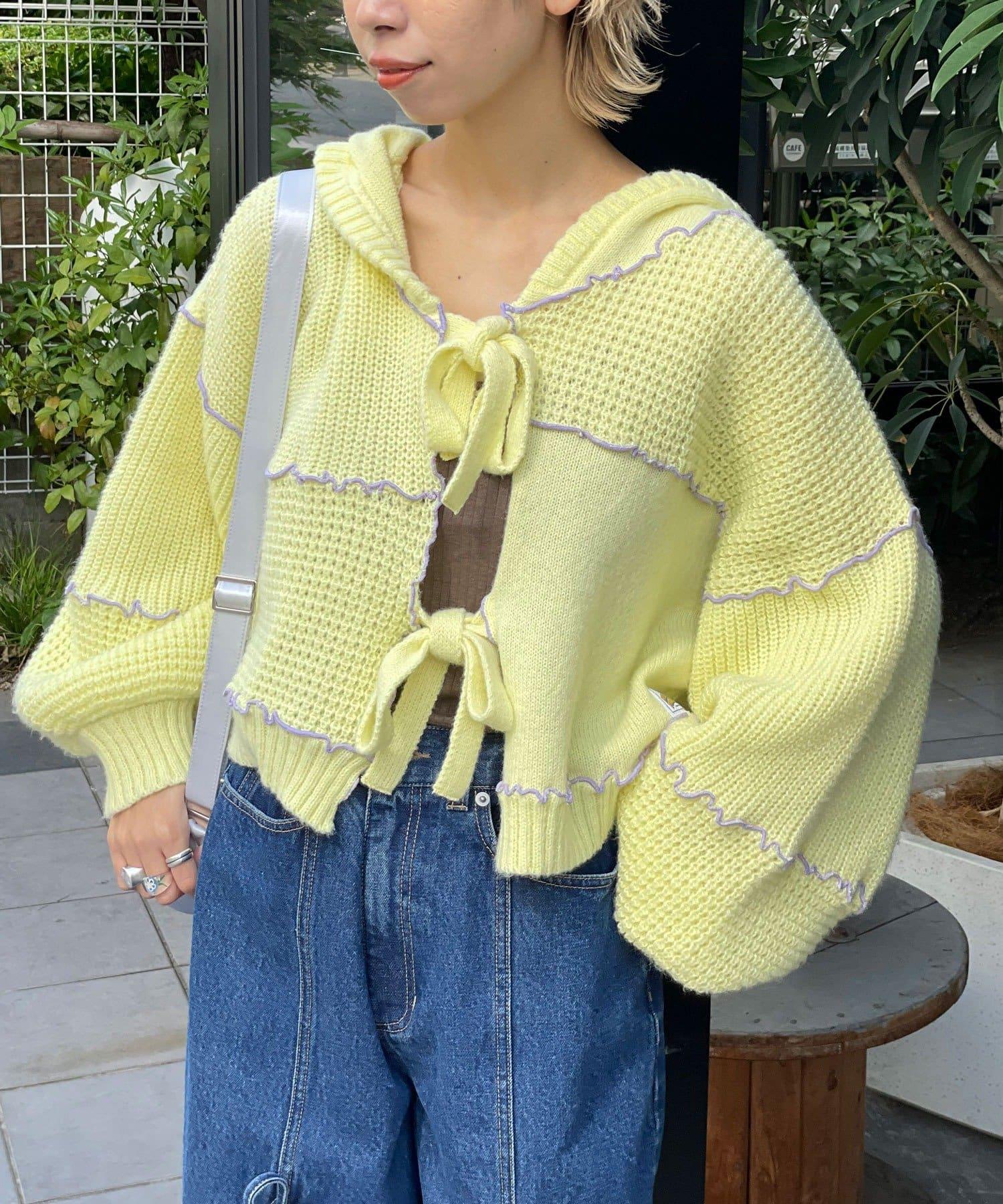 結合不同針織面料的立體設計和微妙的絲帶結為這款開衫增添了少女氣息。