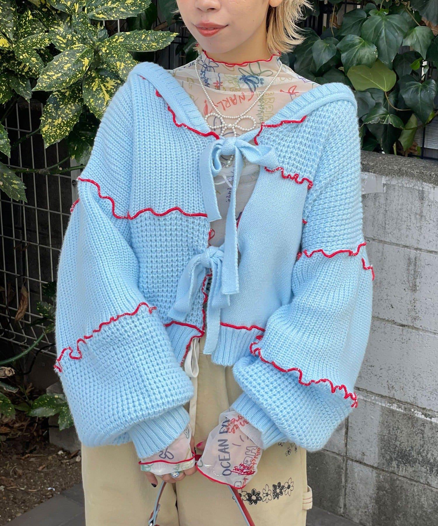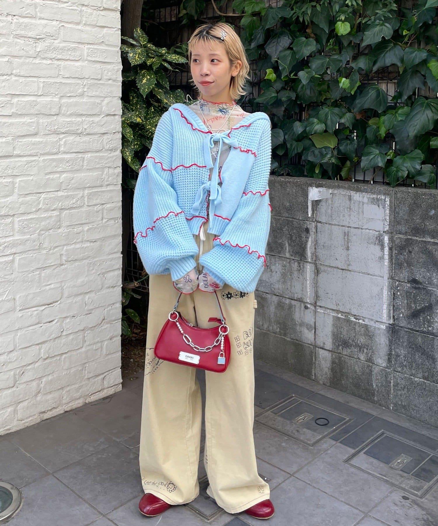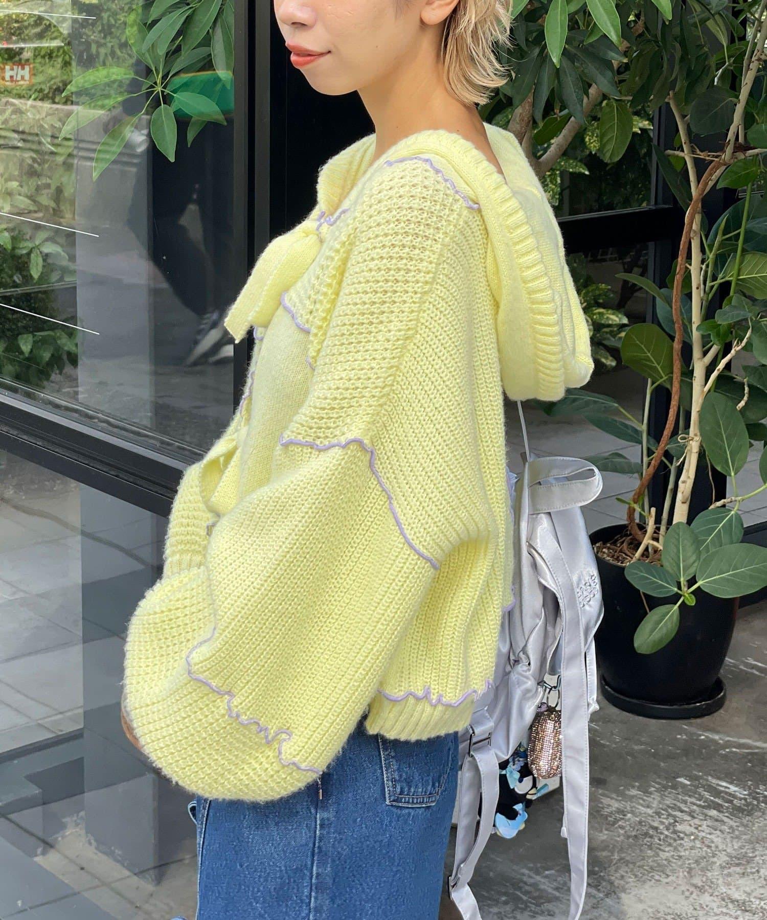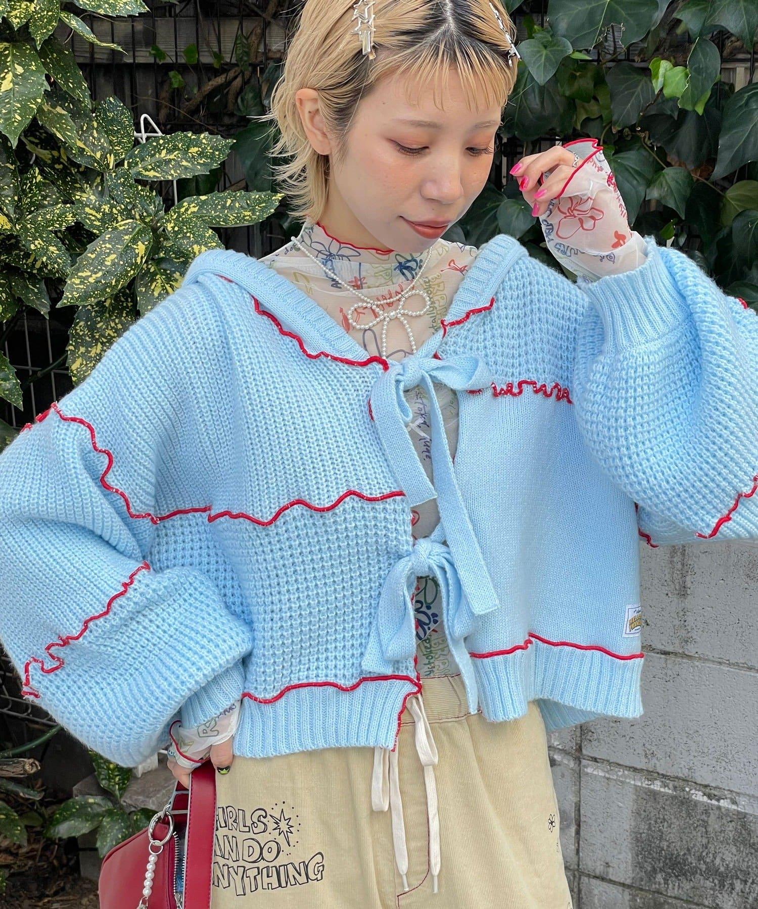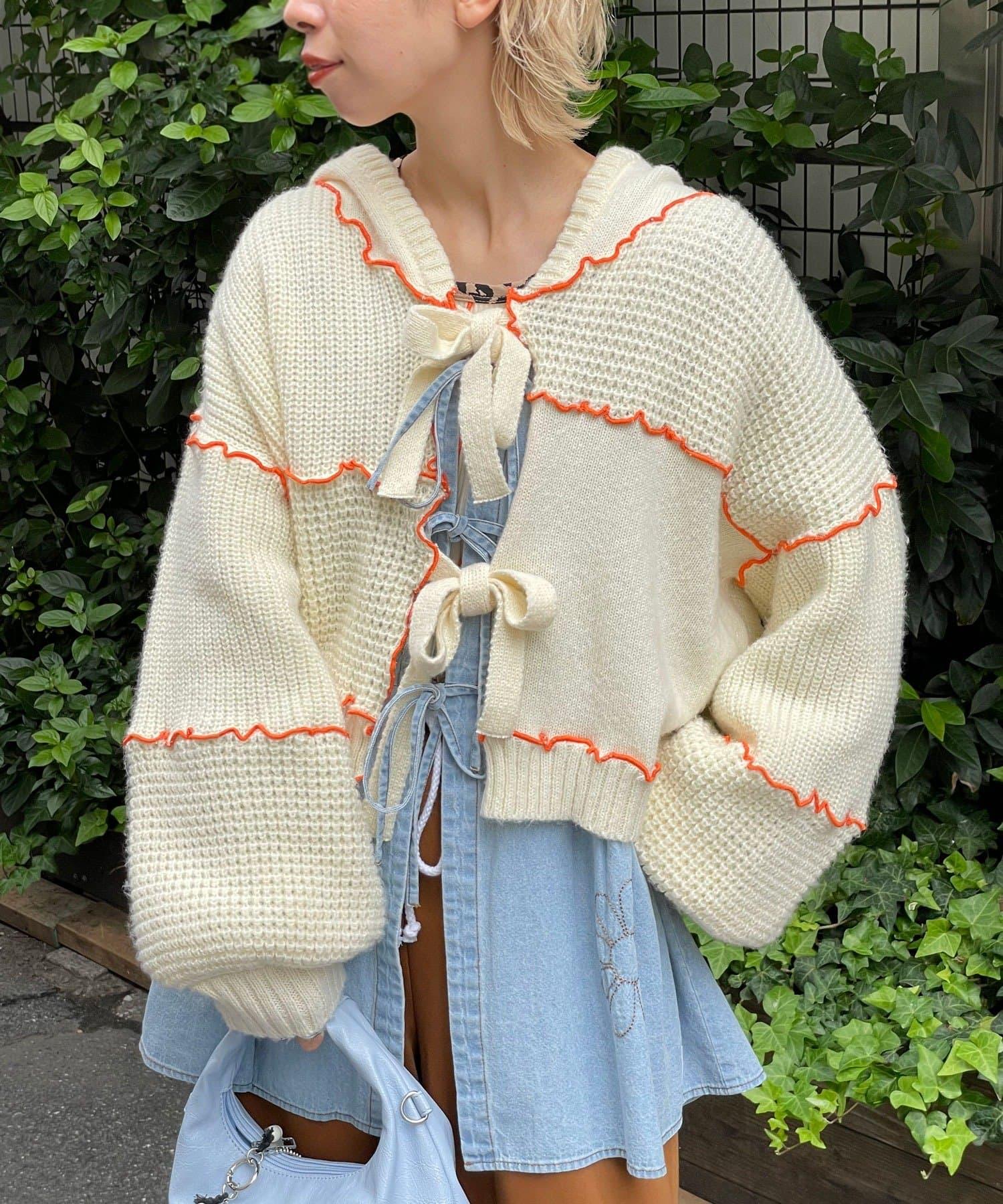 結合不同針織面料的立體設計和微妙的絲帶結為這款開衫增添了少女氣息。
