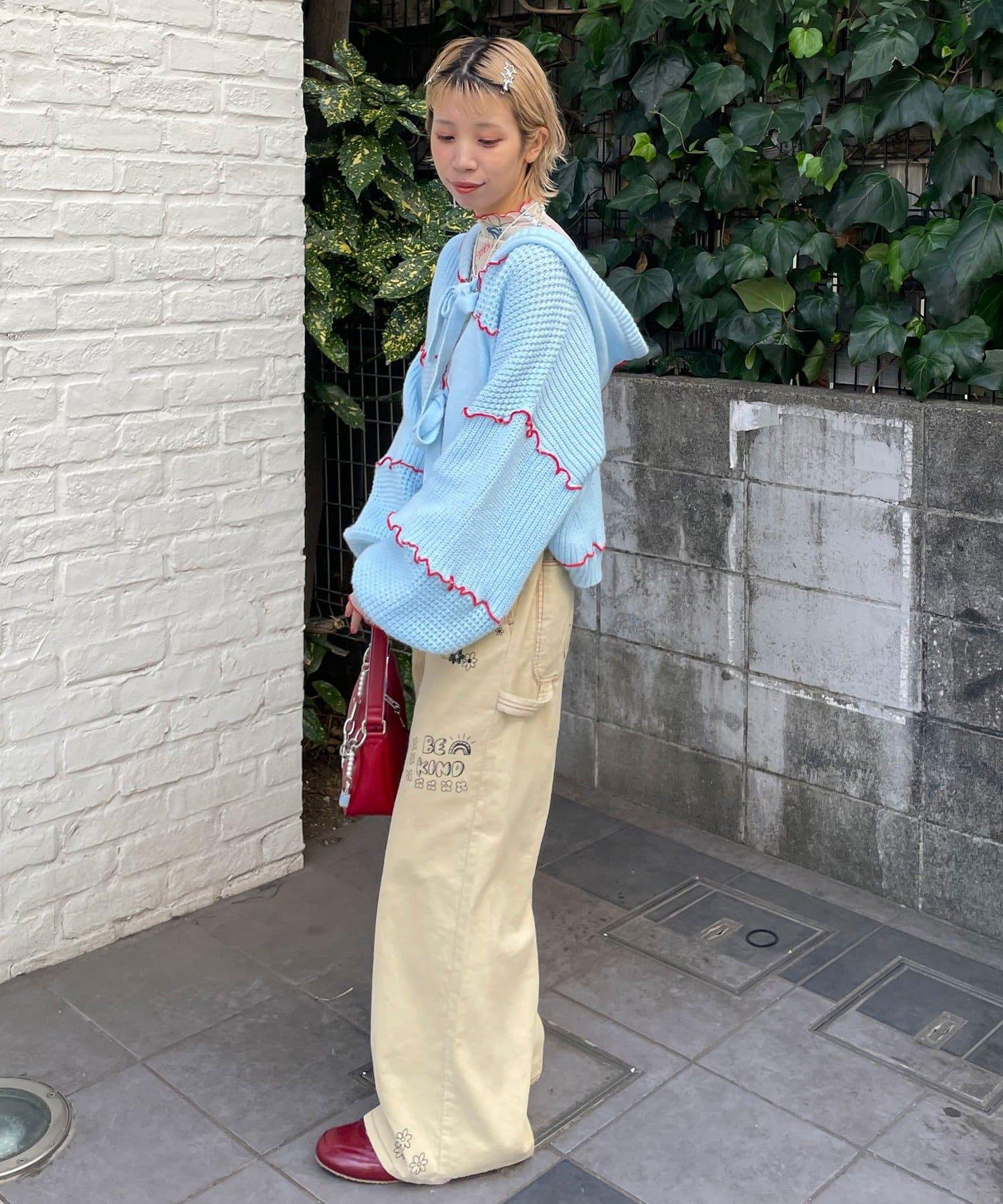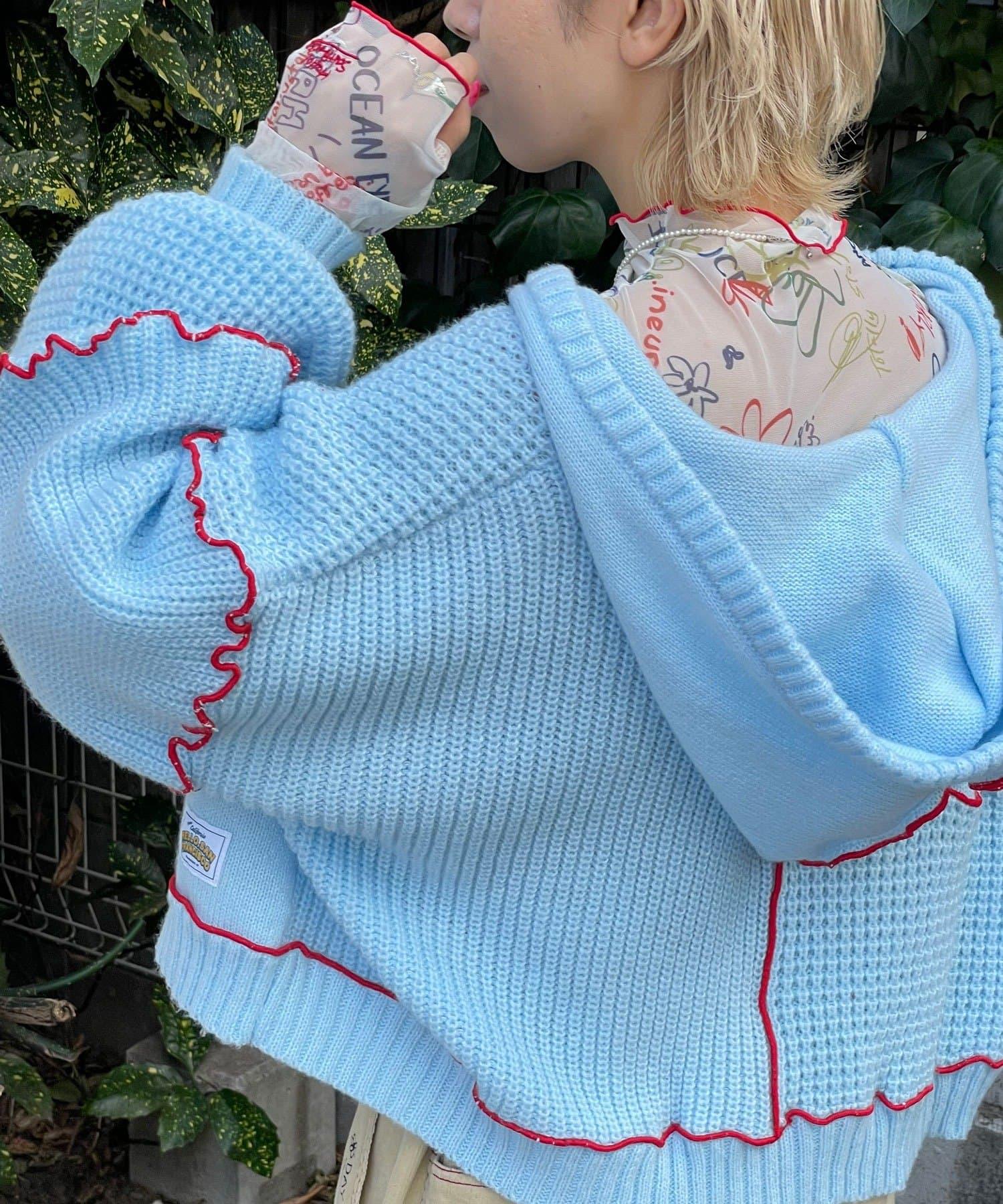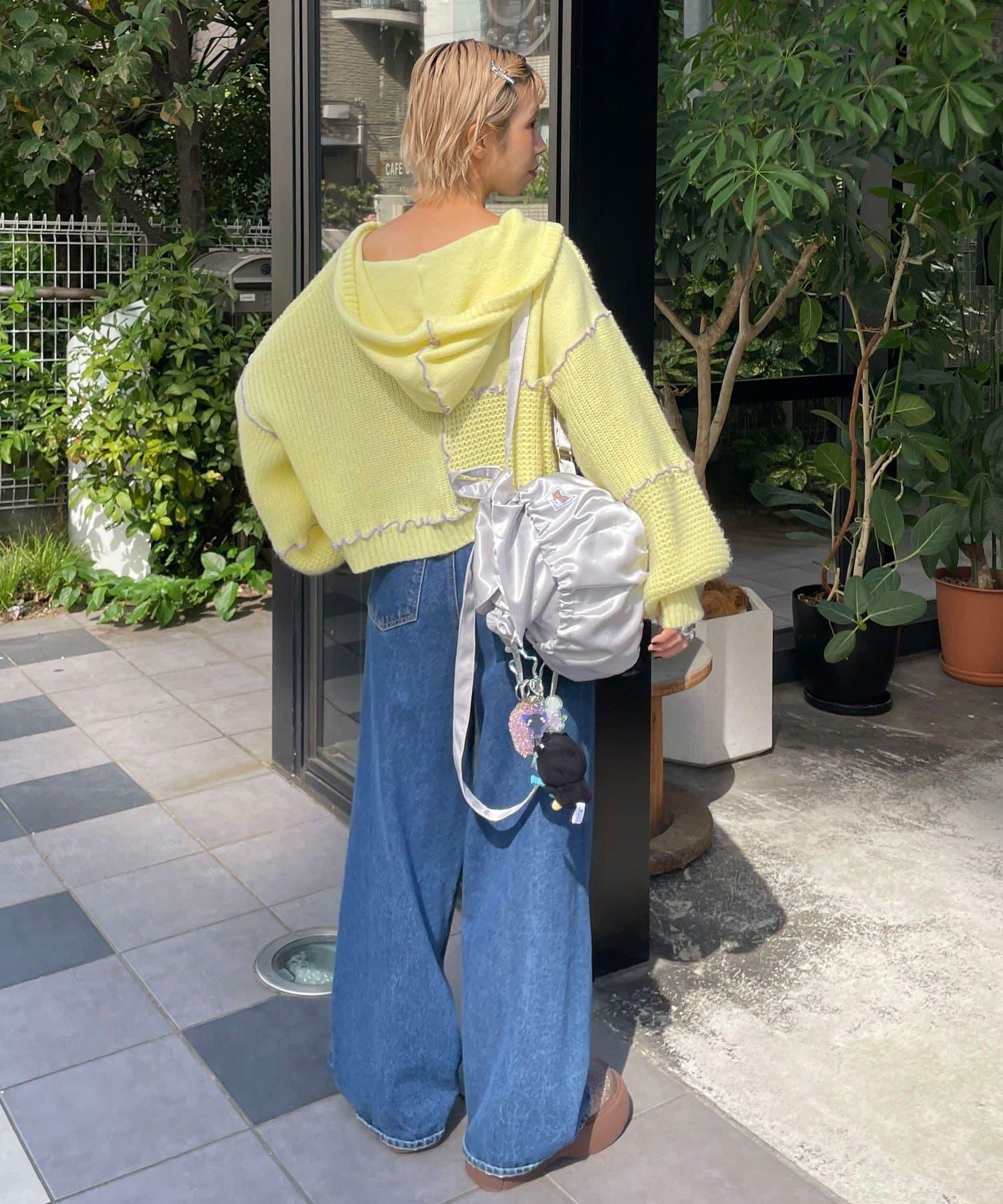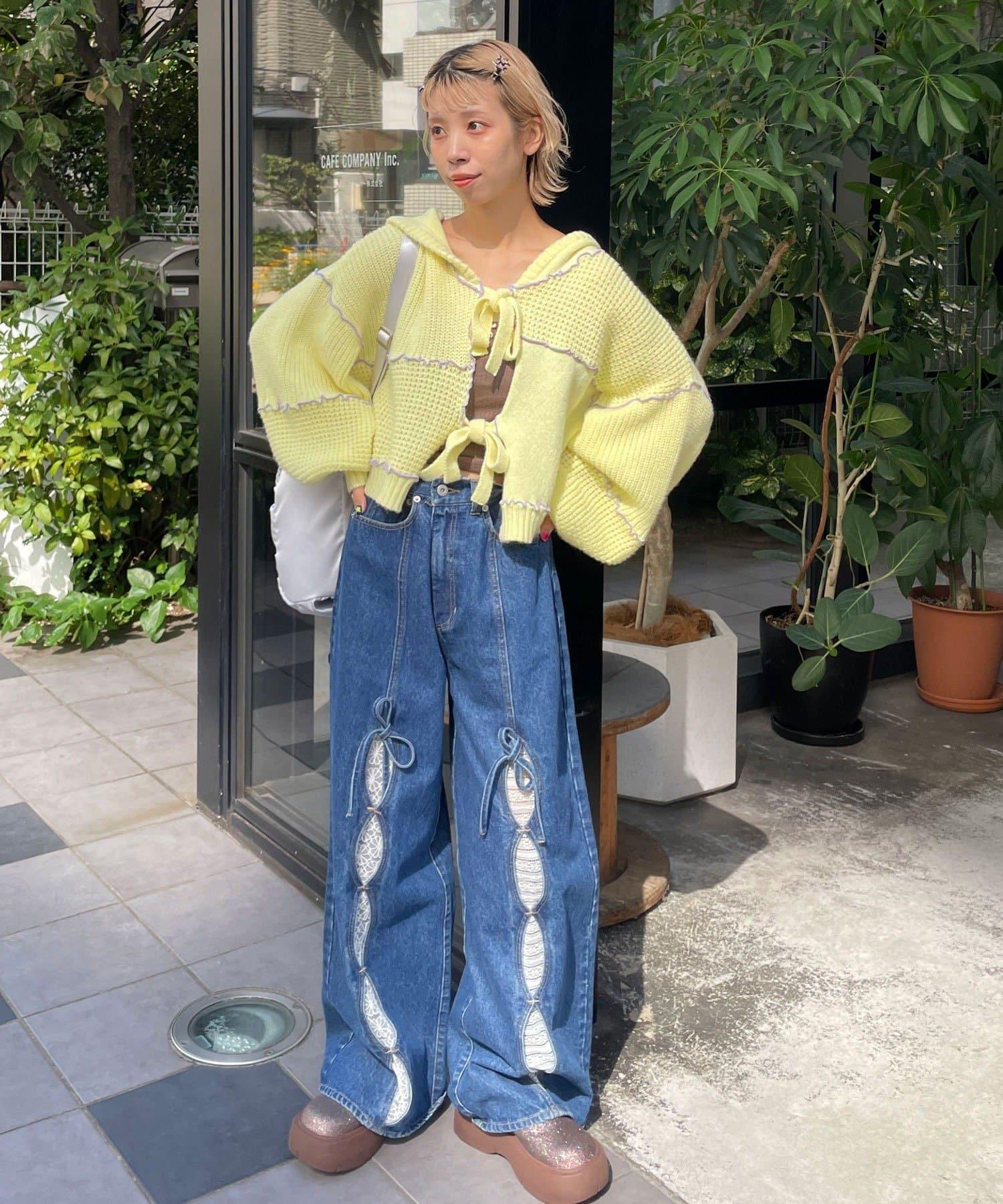 結合不同針織面料的立體設計和微妙的絲帶結為這款開衫增添了少女氣息。