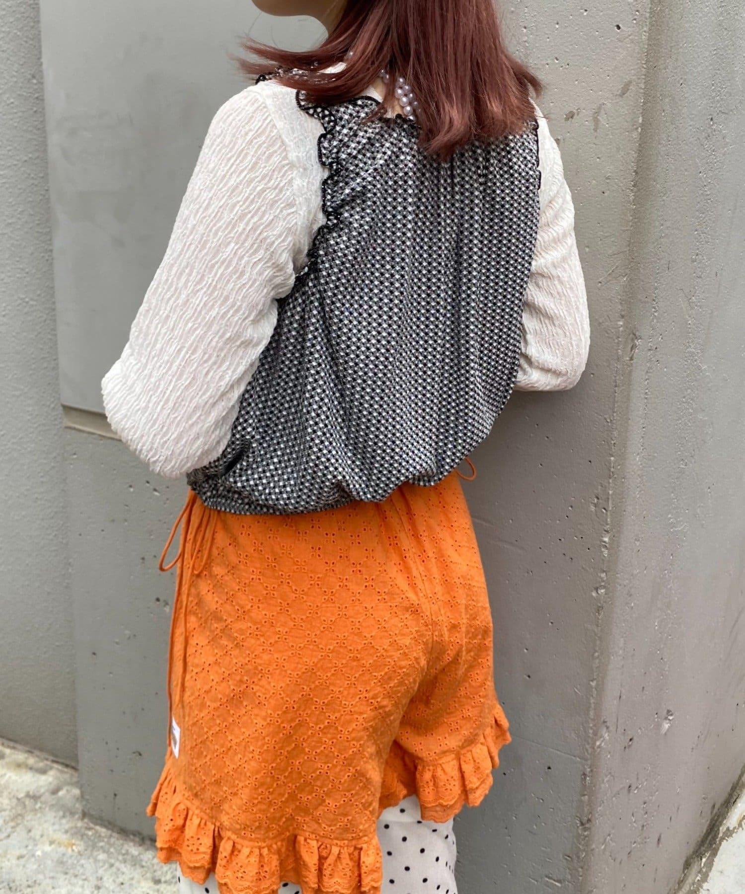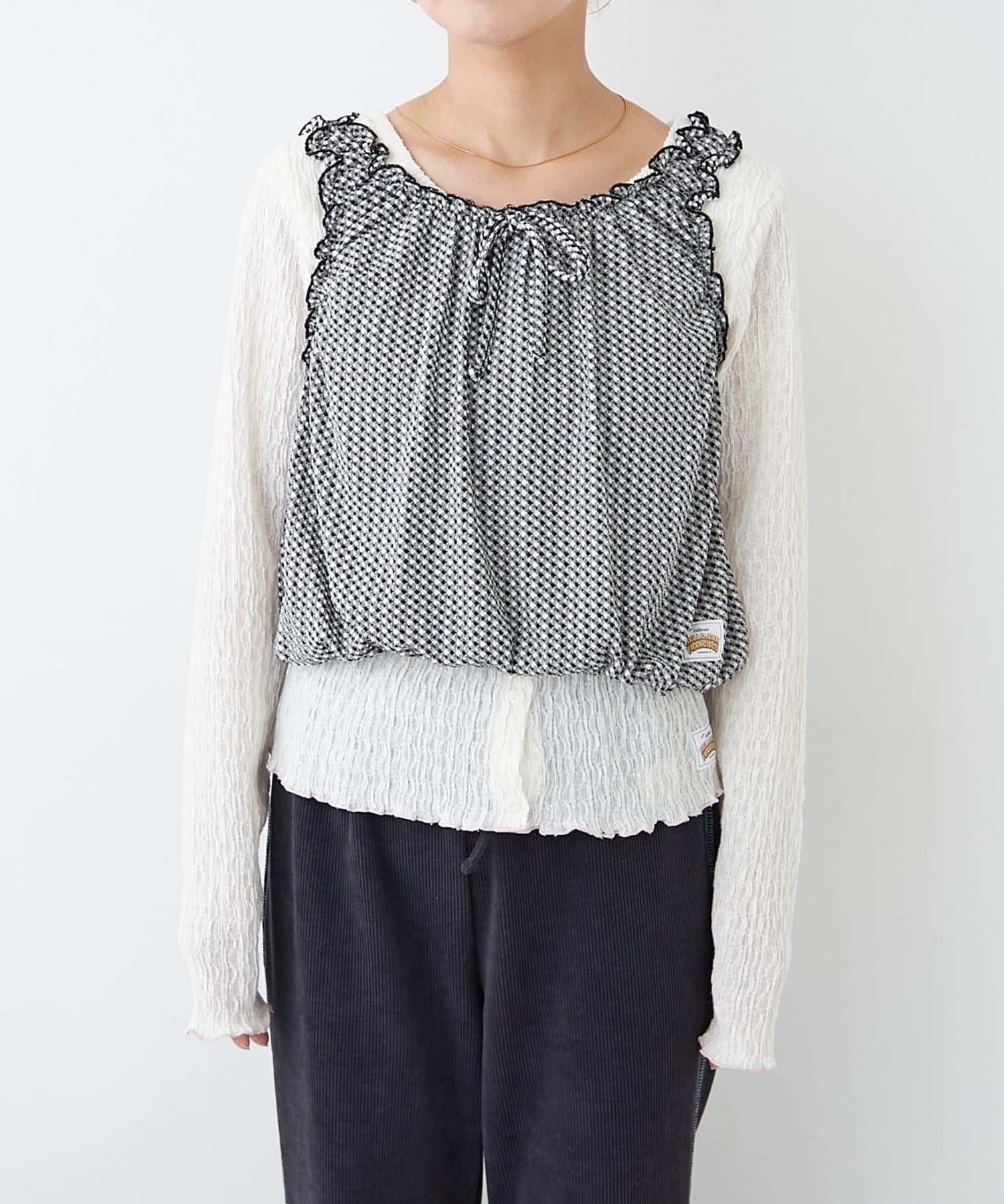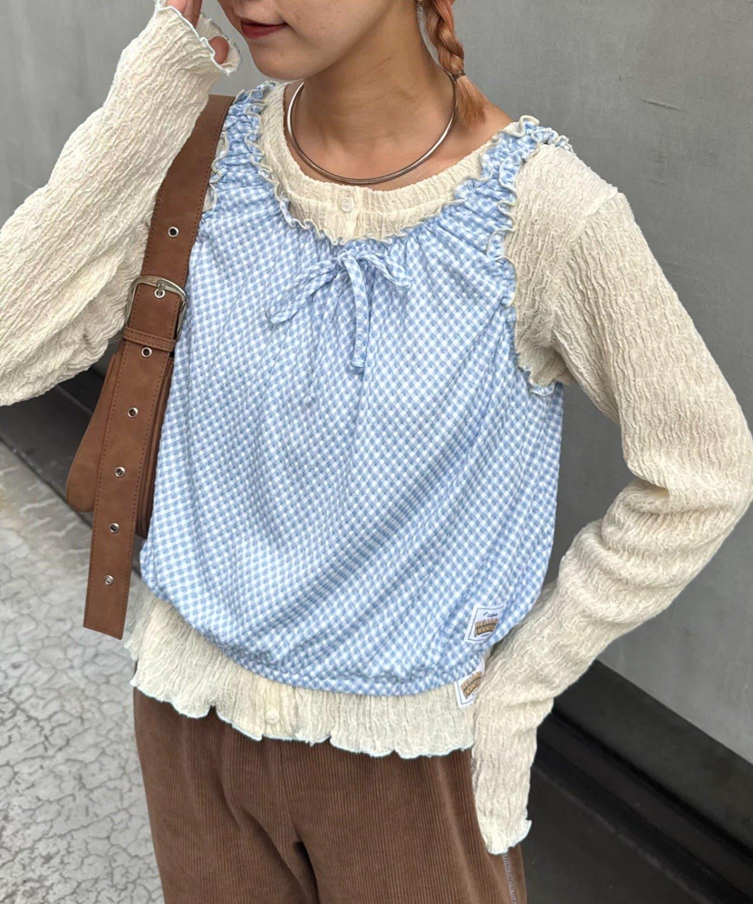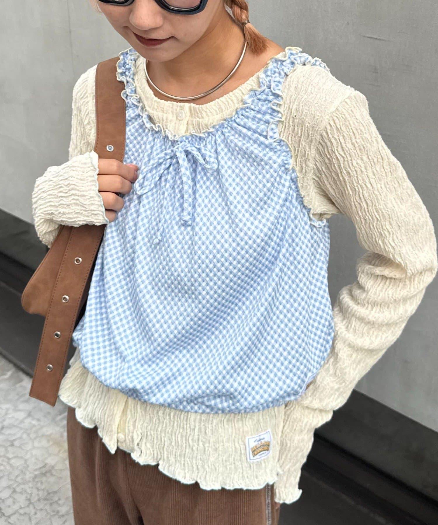 略帶透明感的白色剪裁縫製套裝搭配格紋格子氣球上衣,只需一件單品就能完成造型。