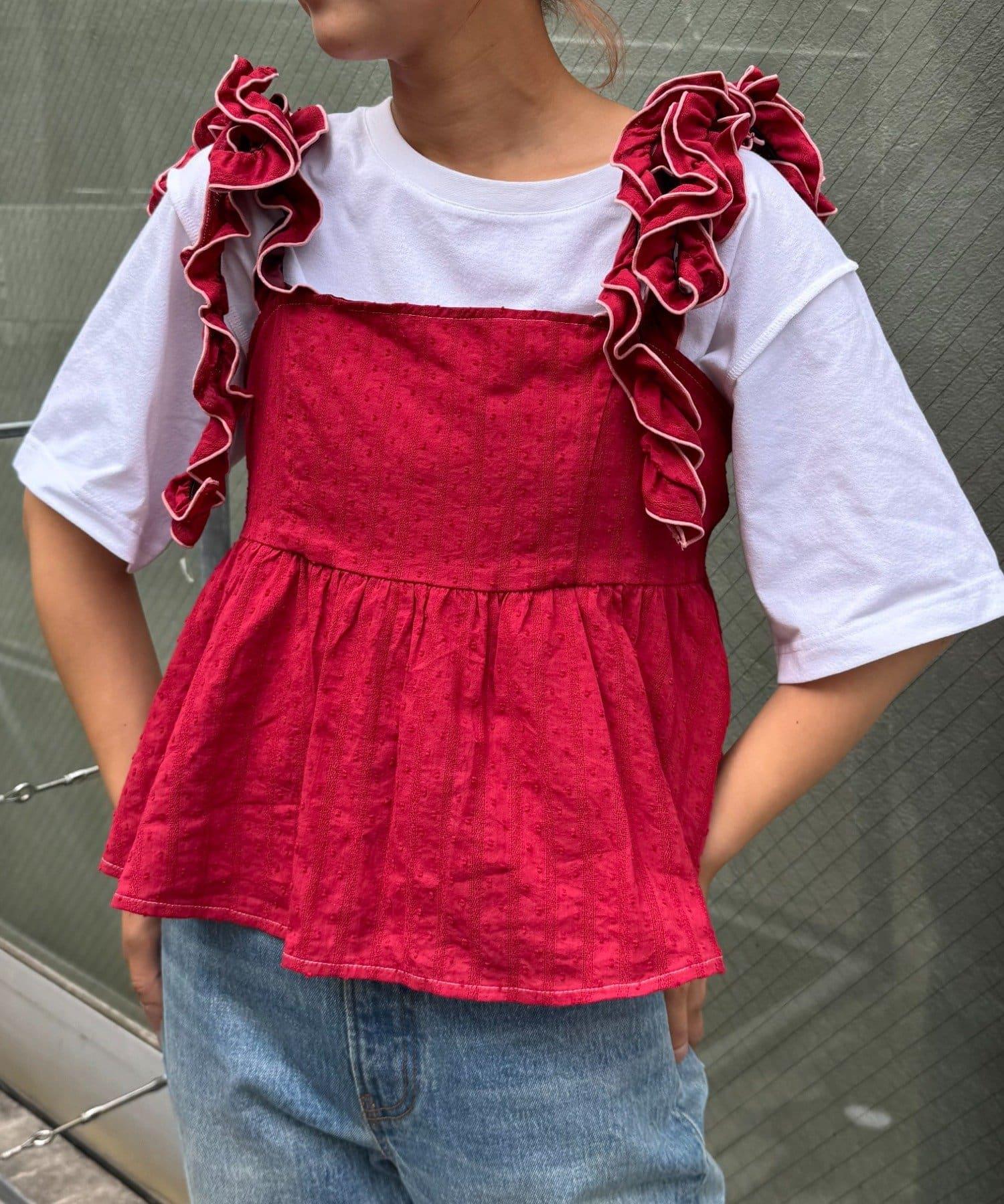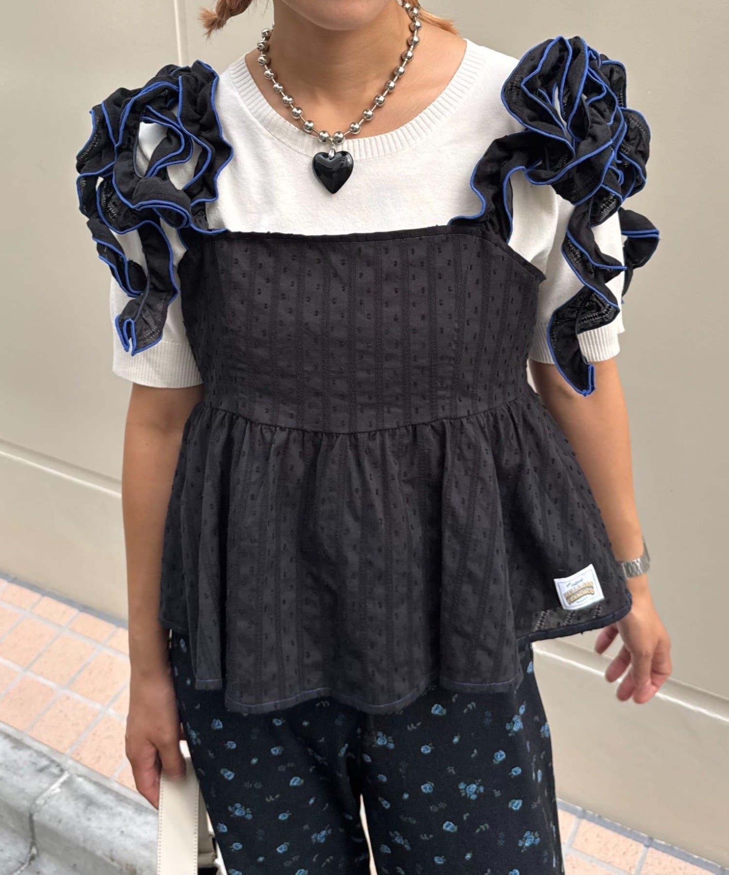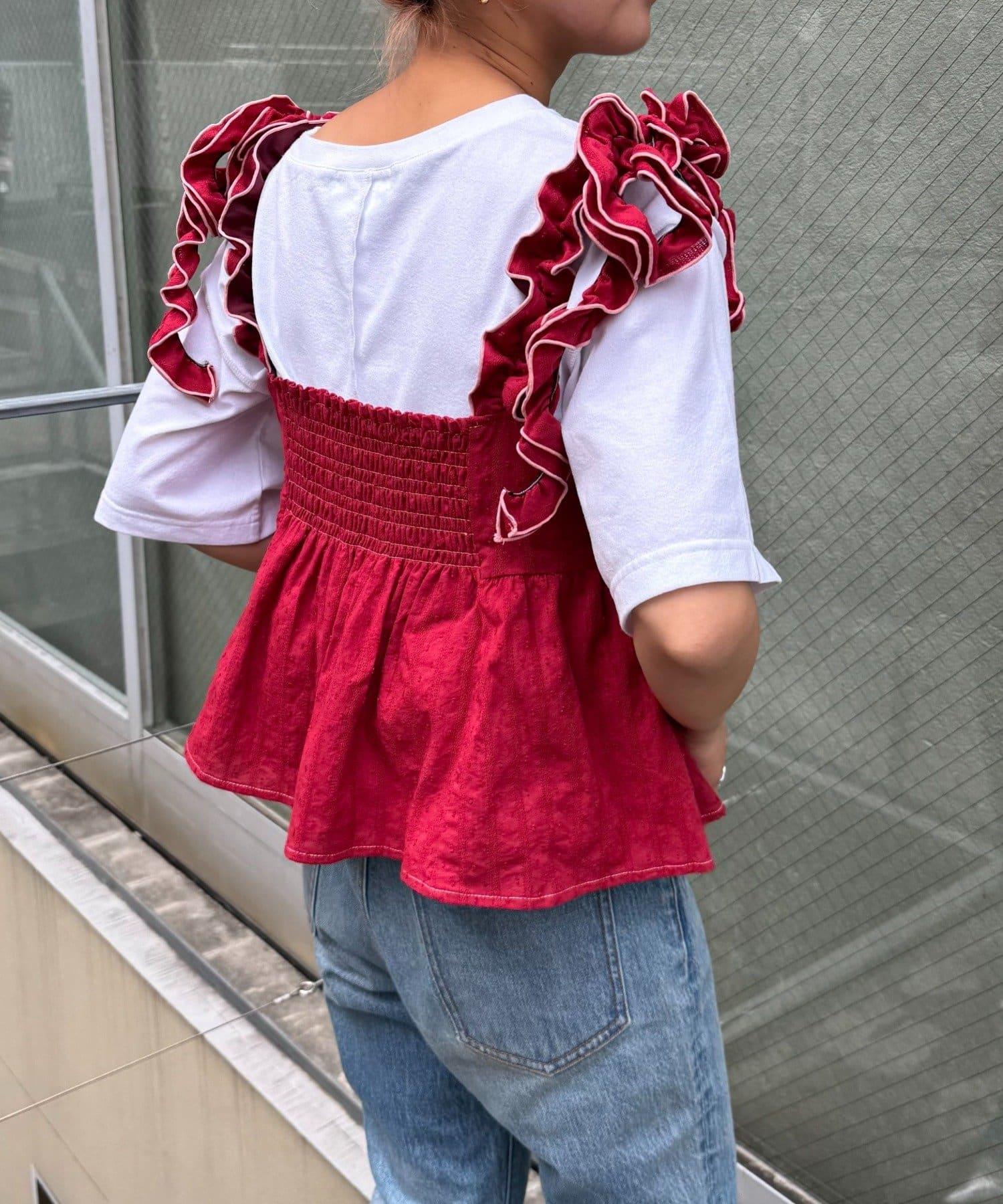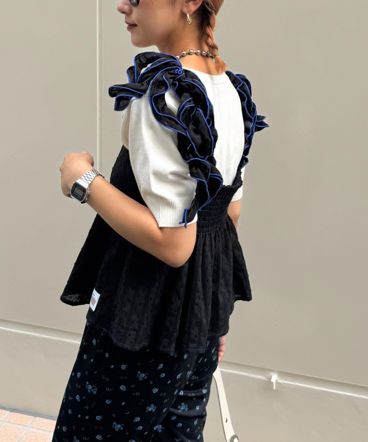 荷葉邊肩帶採用雙色滾邊,使設計更加突出。