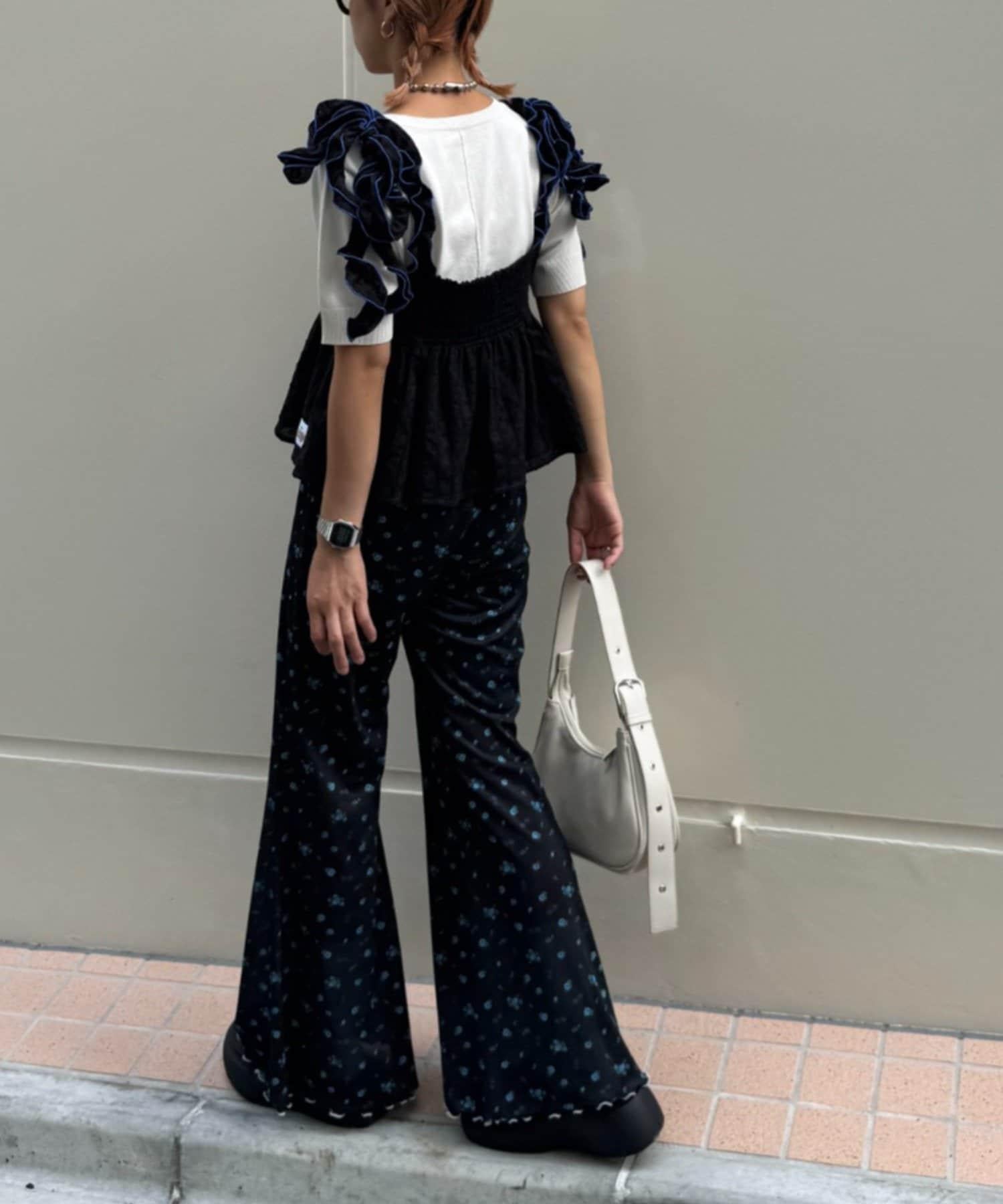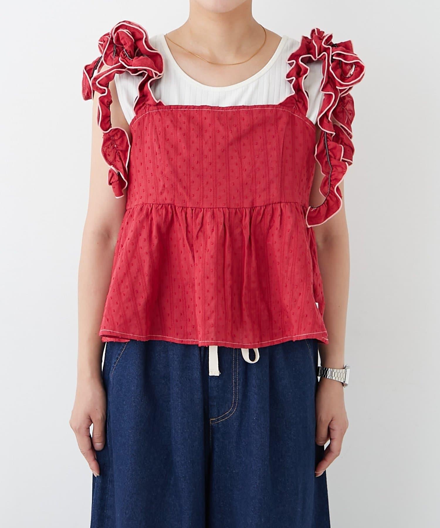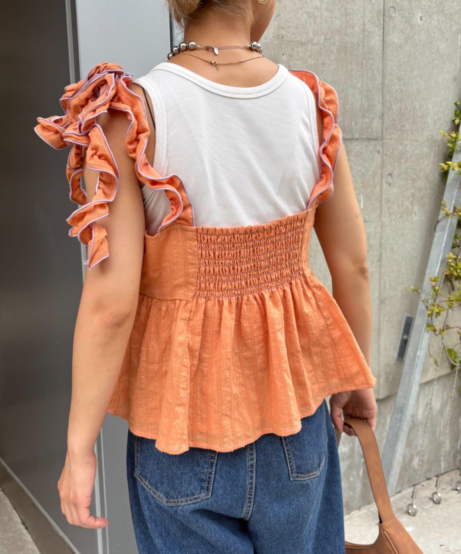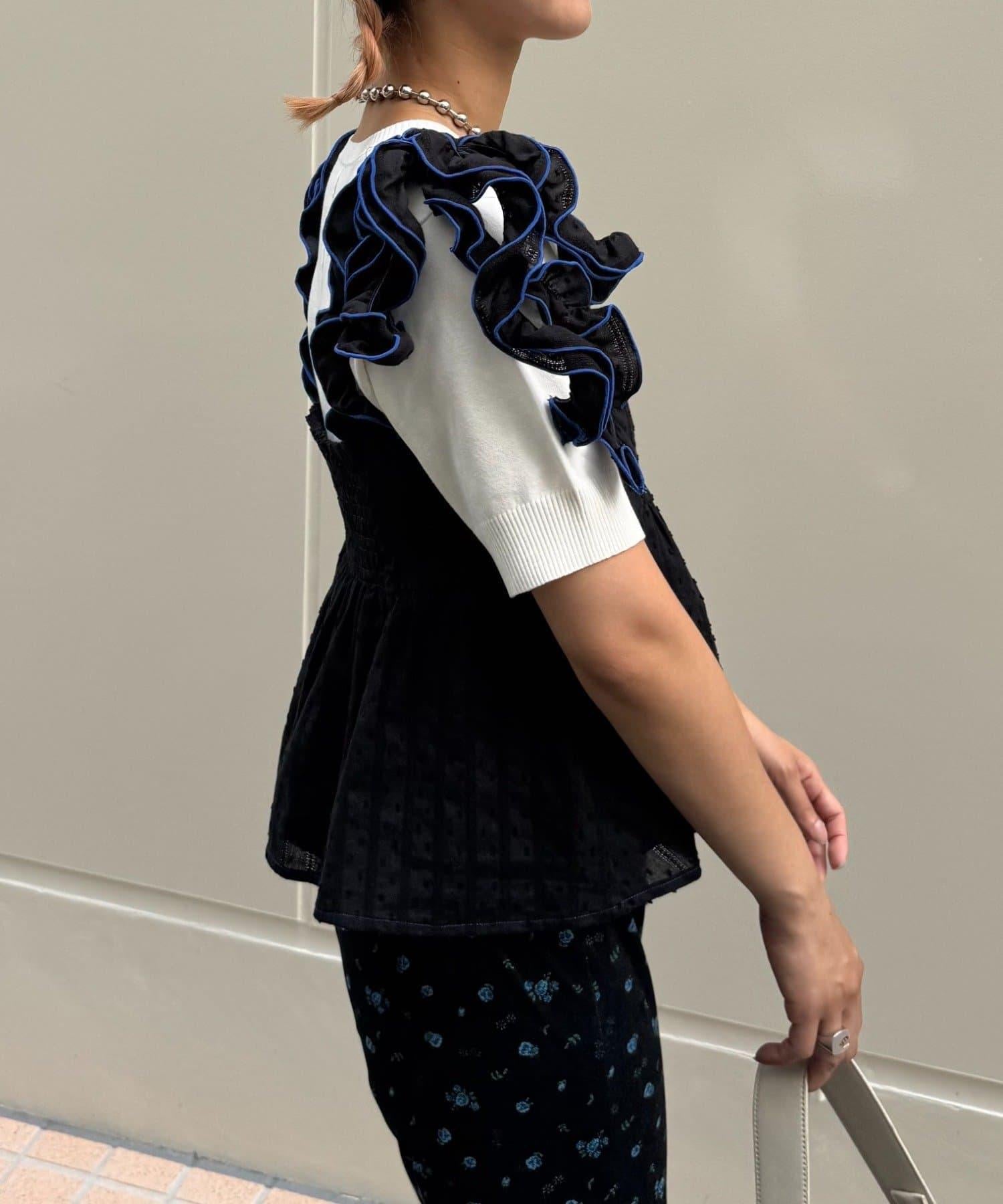 荷葉邊肩帶採用雙色滾邊,使設計更加突出。