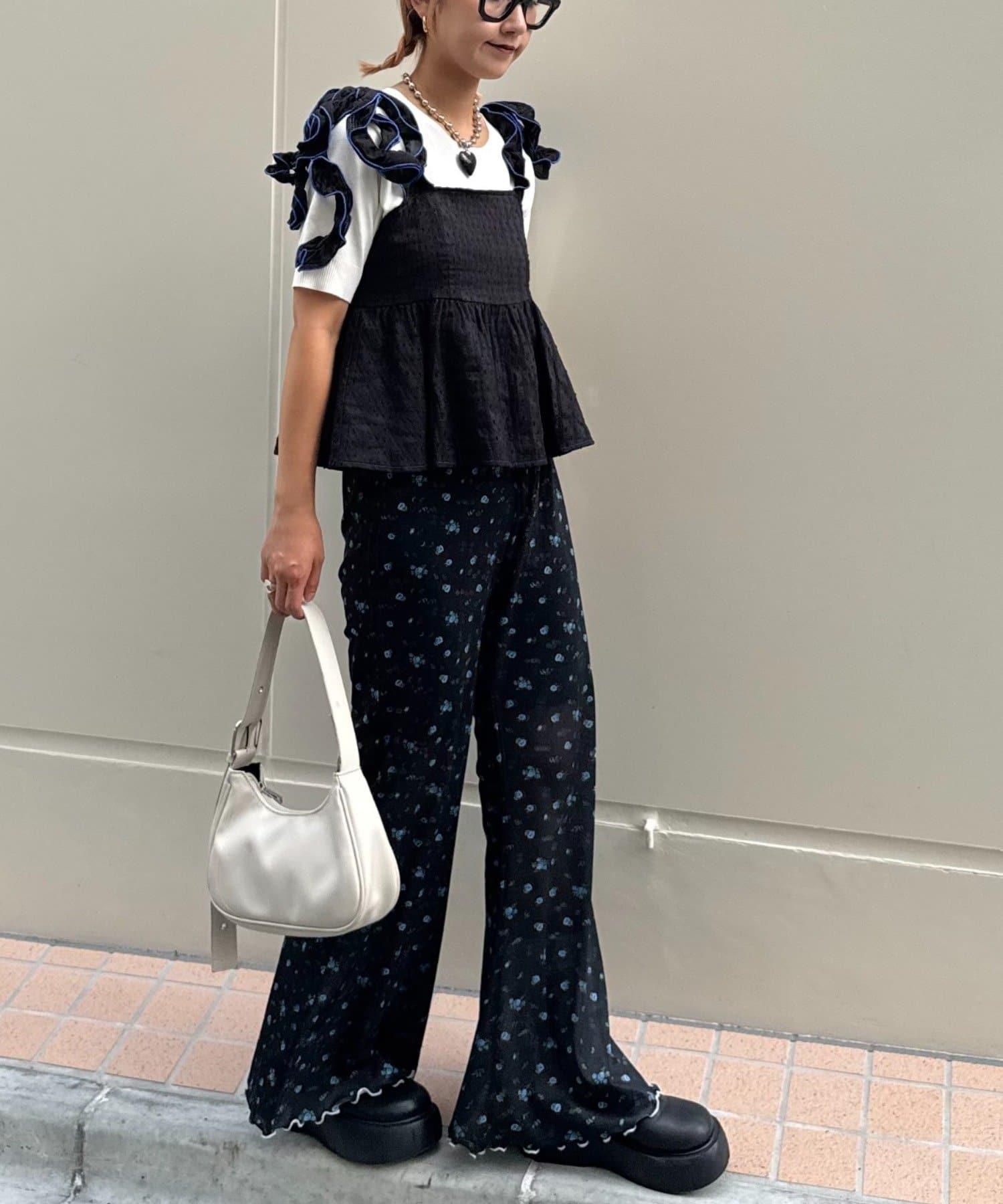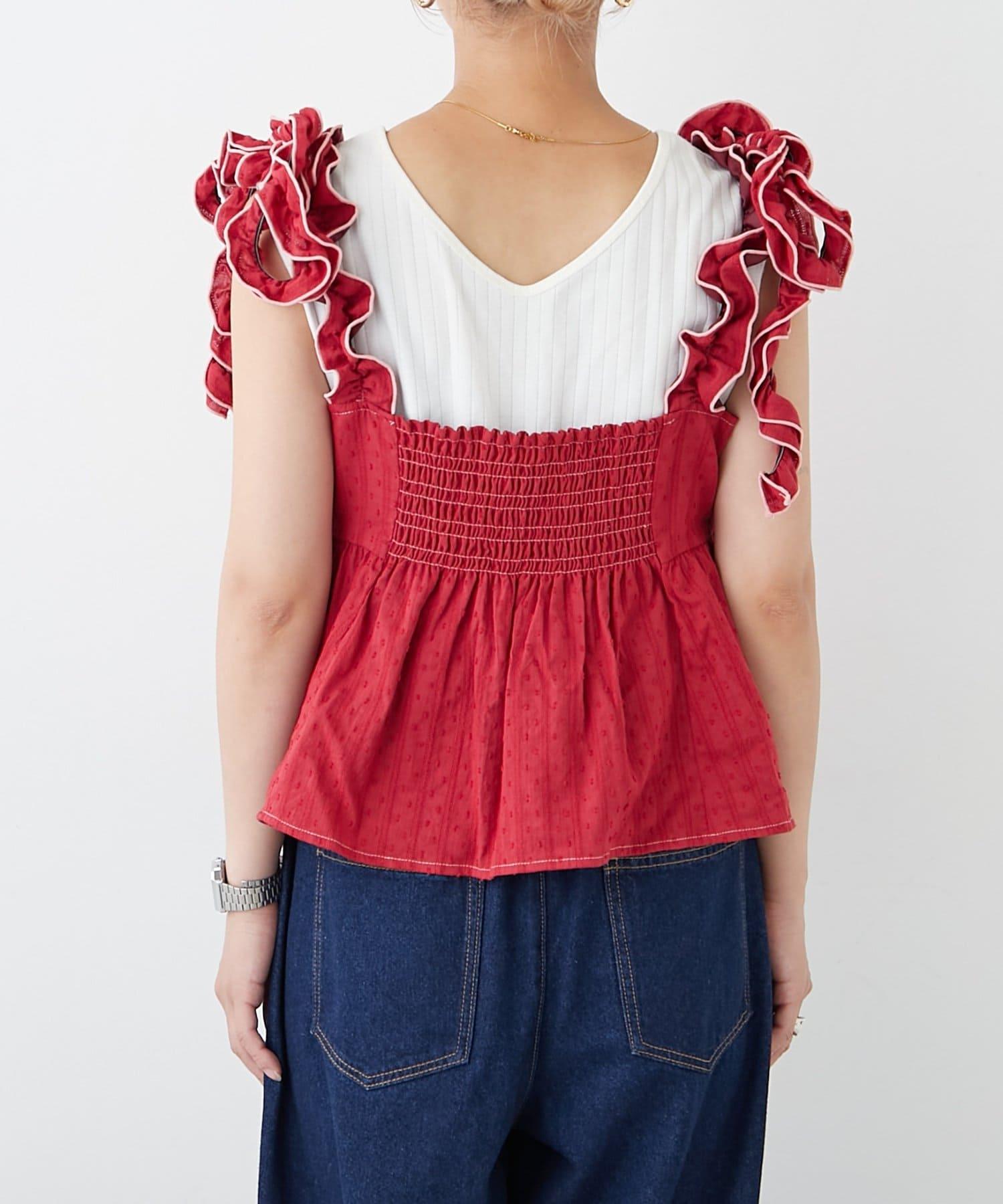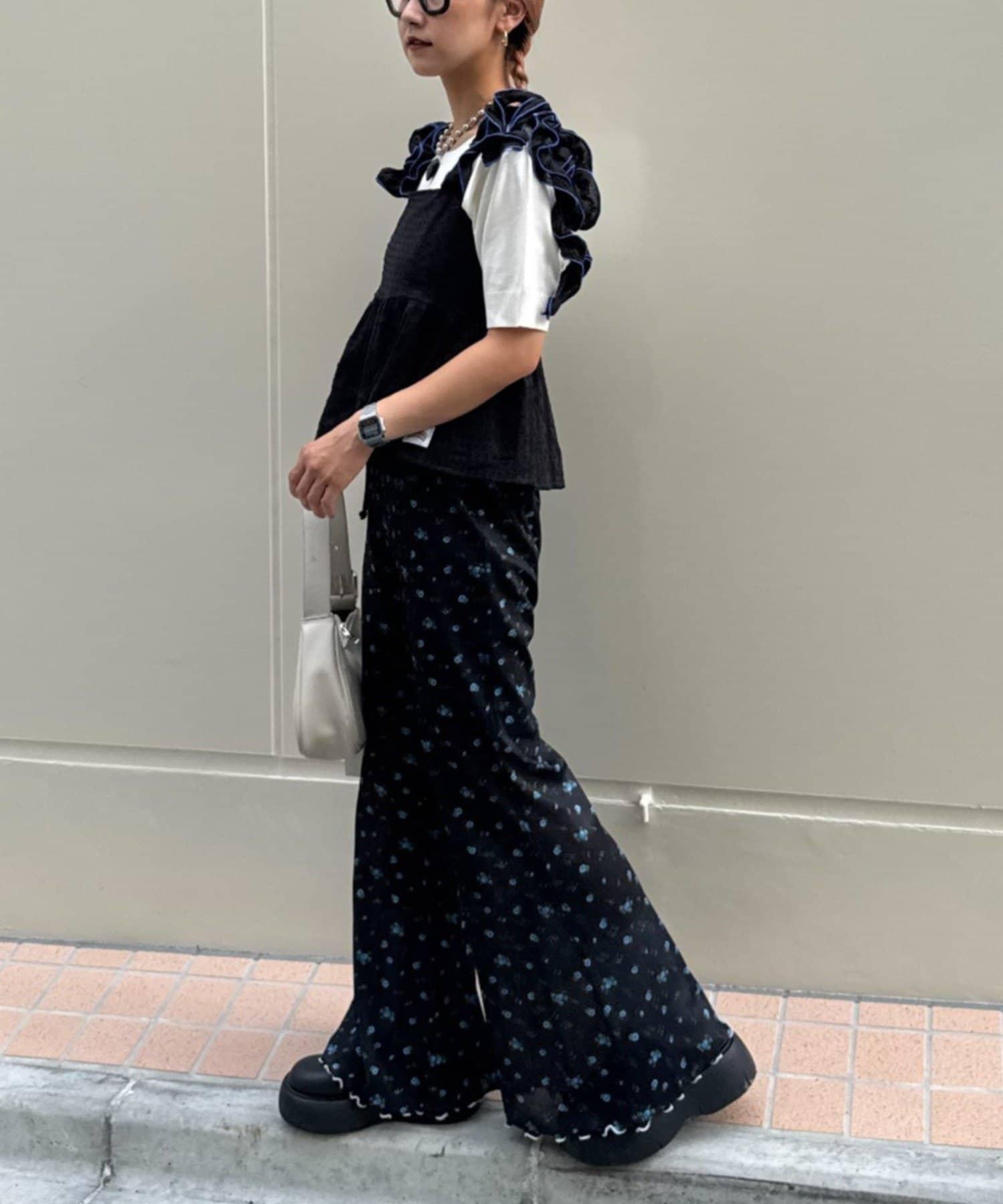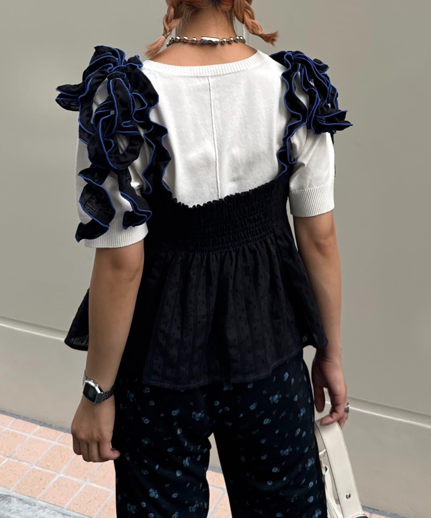 荷葉邊肩帶採用雙色滾邊,使設計更加突出。