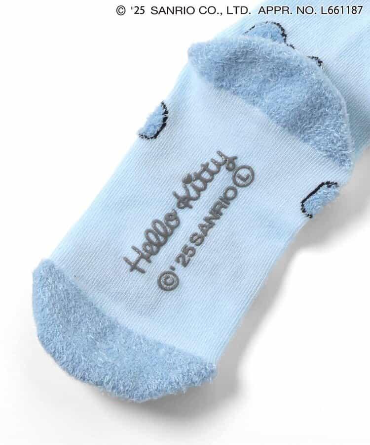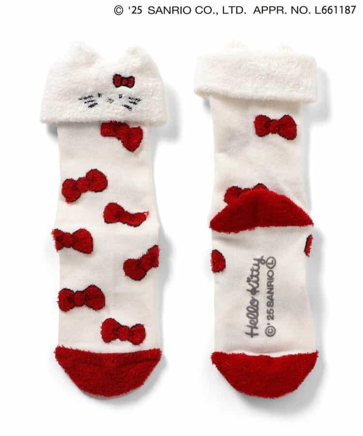 立體感十足的可愛襪子,摺疊部分有 Kitty 的絲帶圖案和毛茸茸的紗線。摺疊部分的臉部用刺繡完成,是腳上的可愛設計。