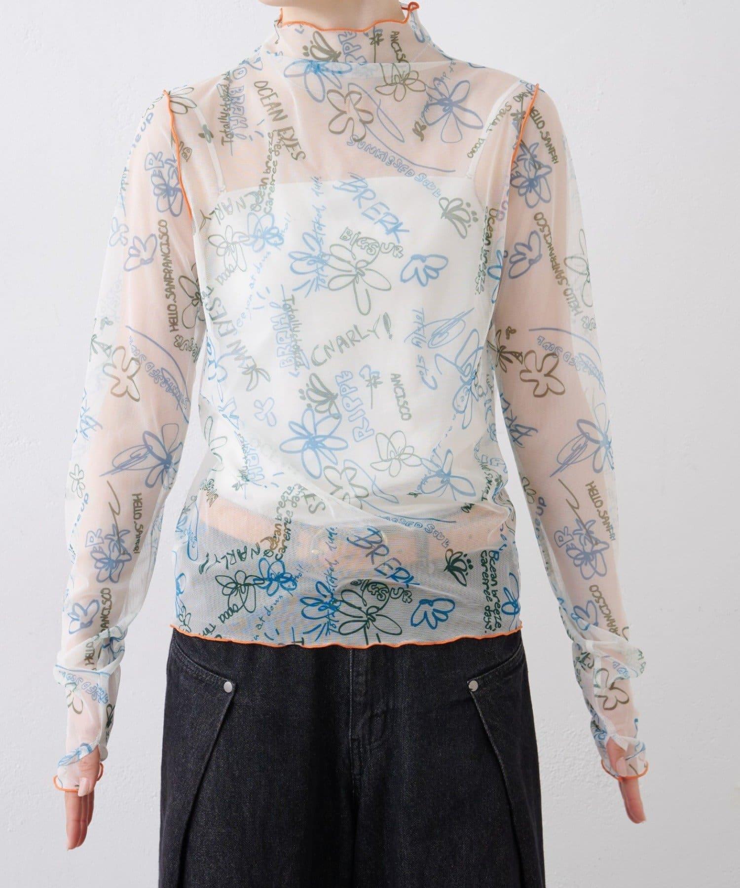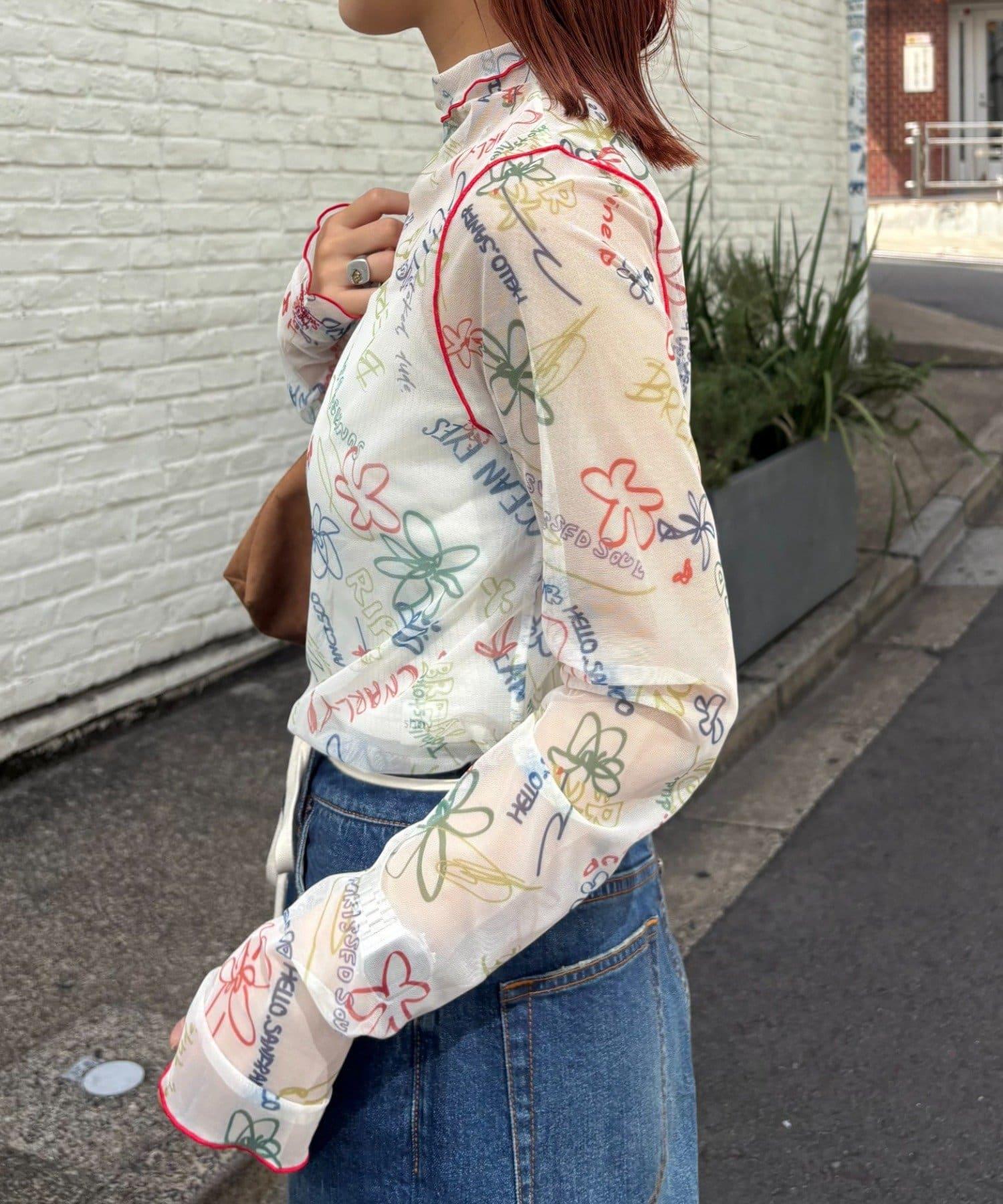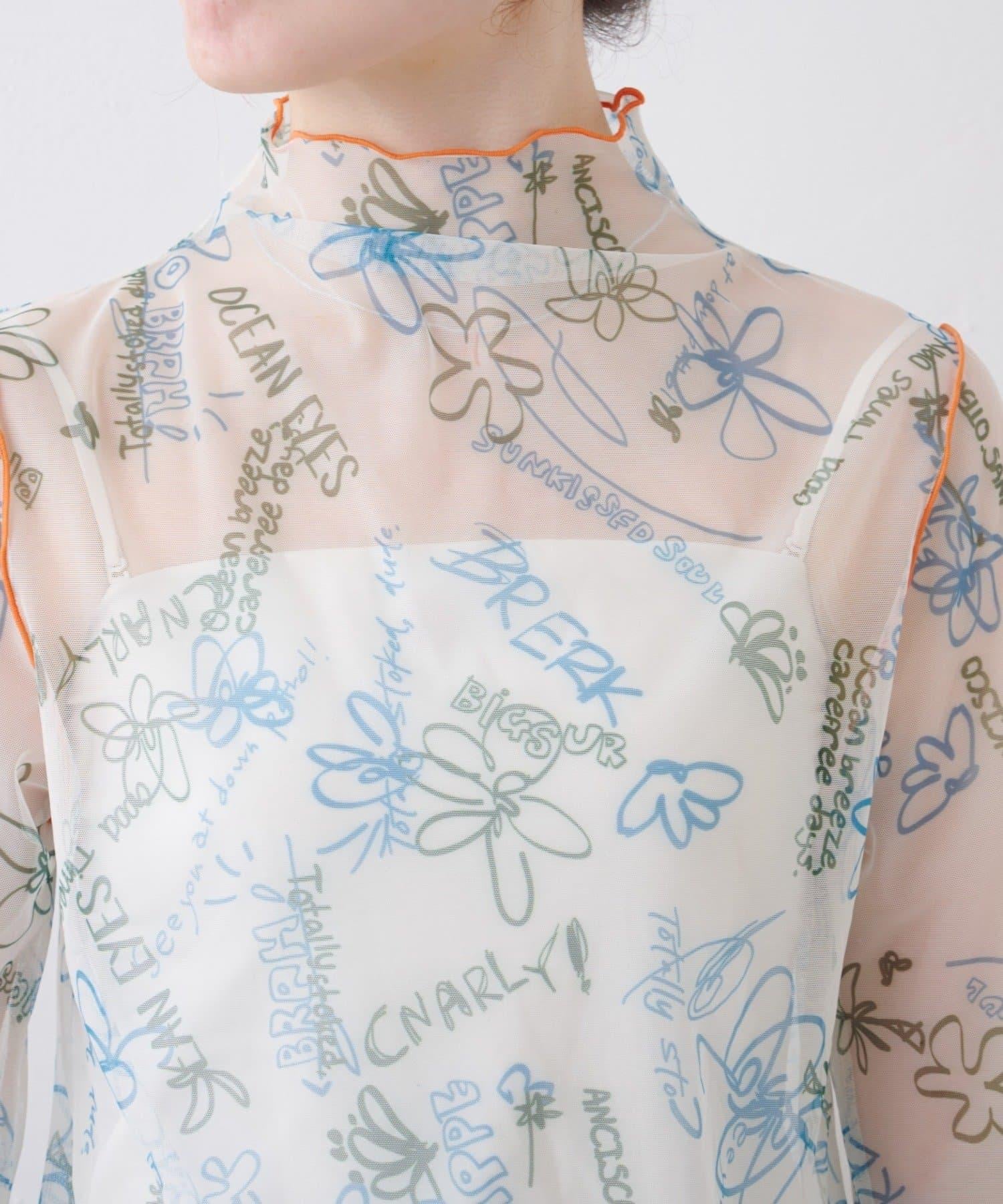 在薄紗材質上印有手寫塗鴉藝術的設計上衣。