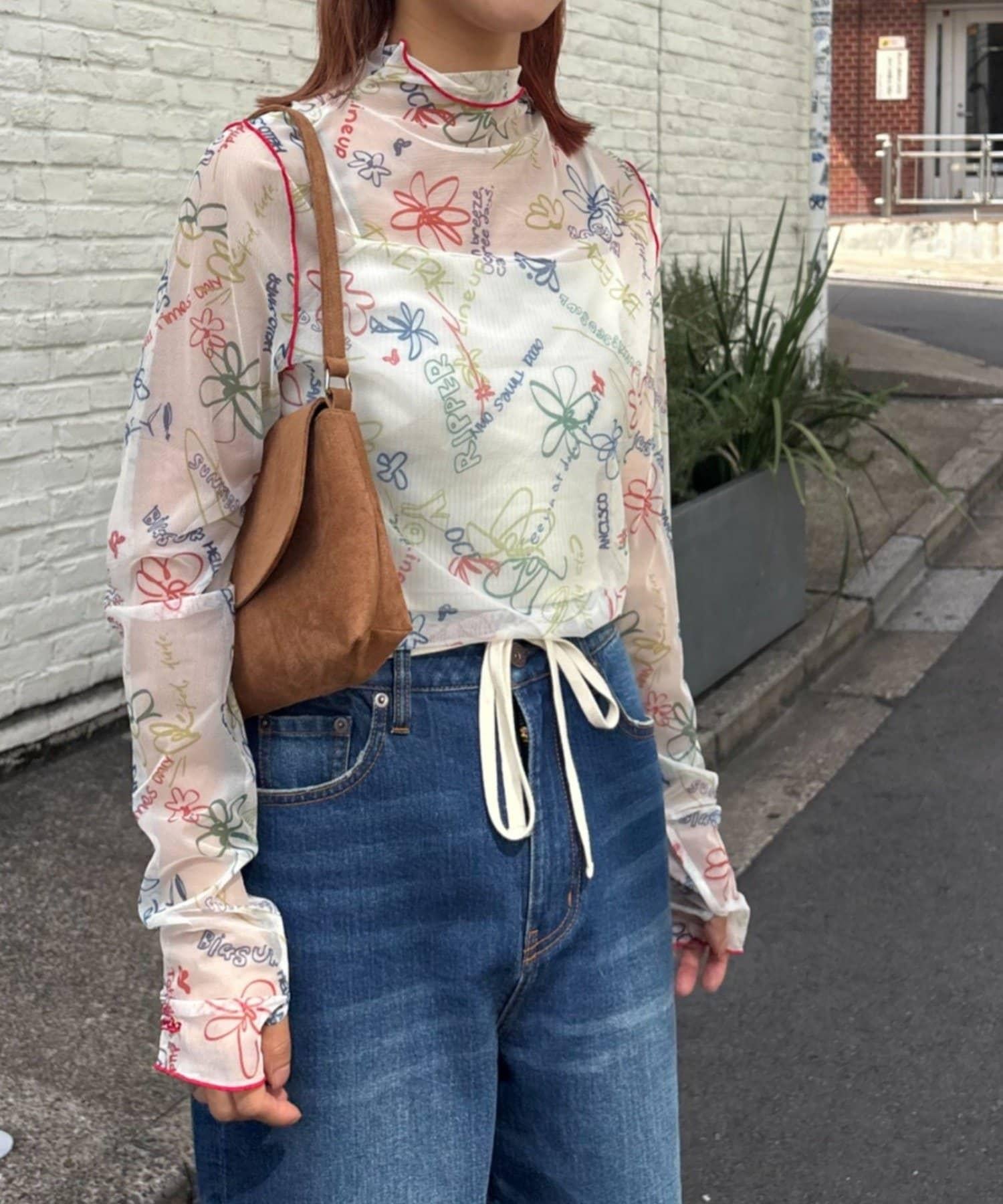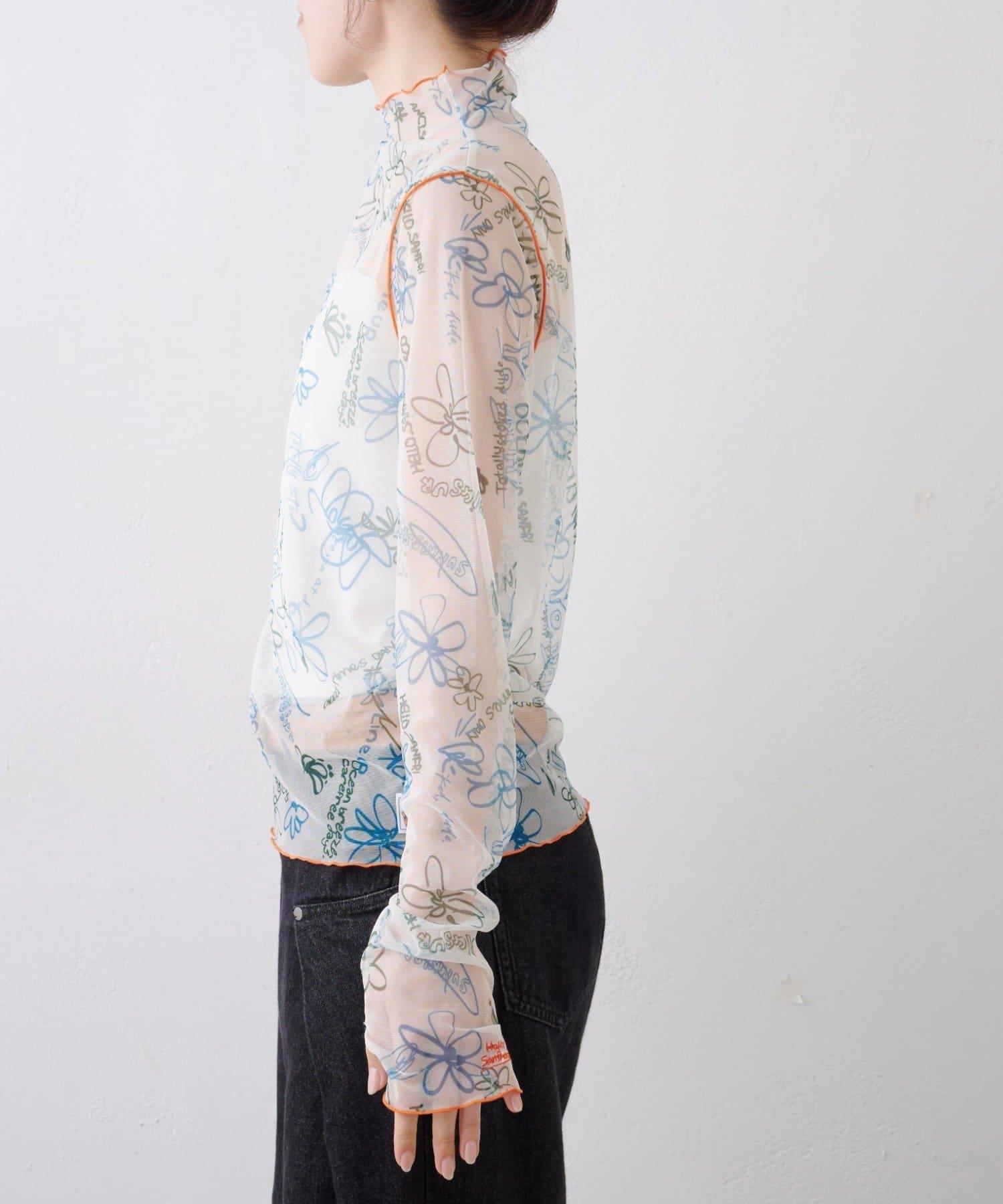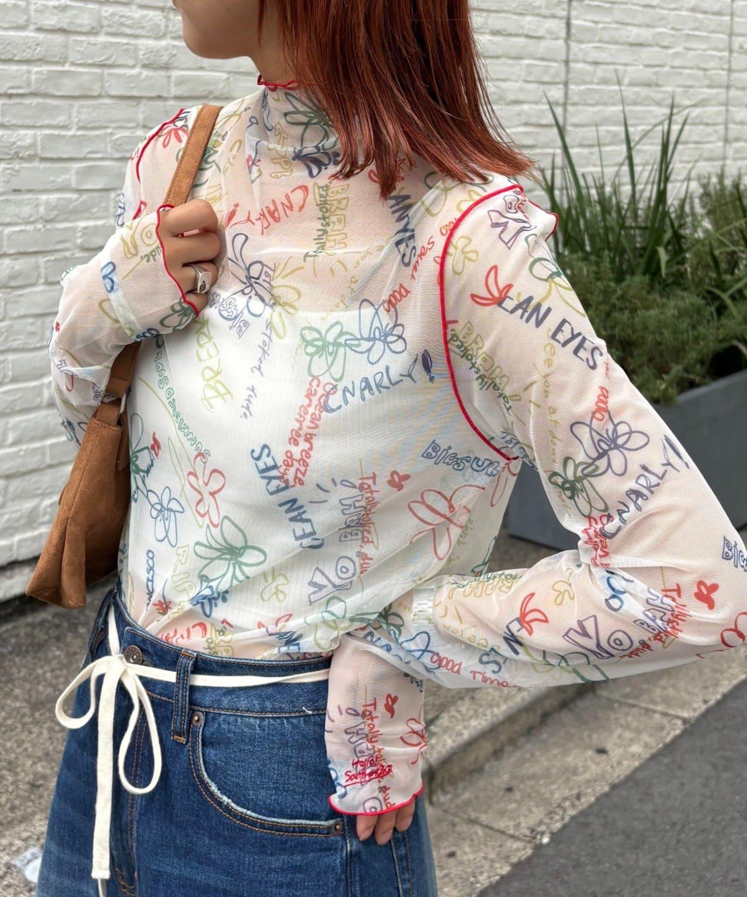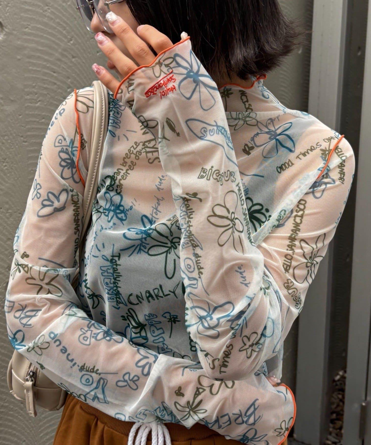 在薄紗材質上印有手寫塗鴉藝術的設計上衣。