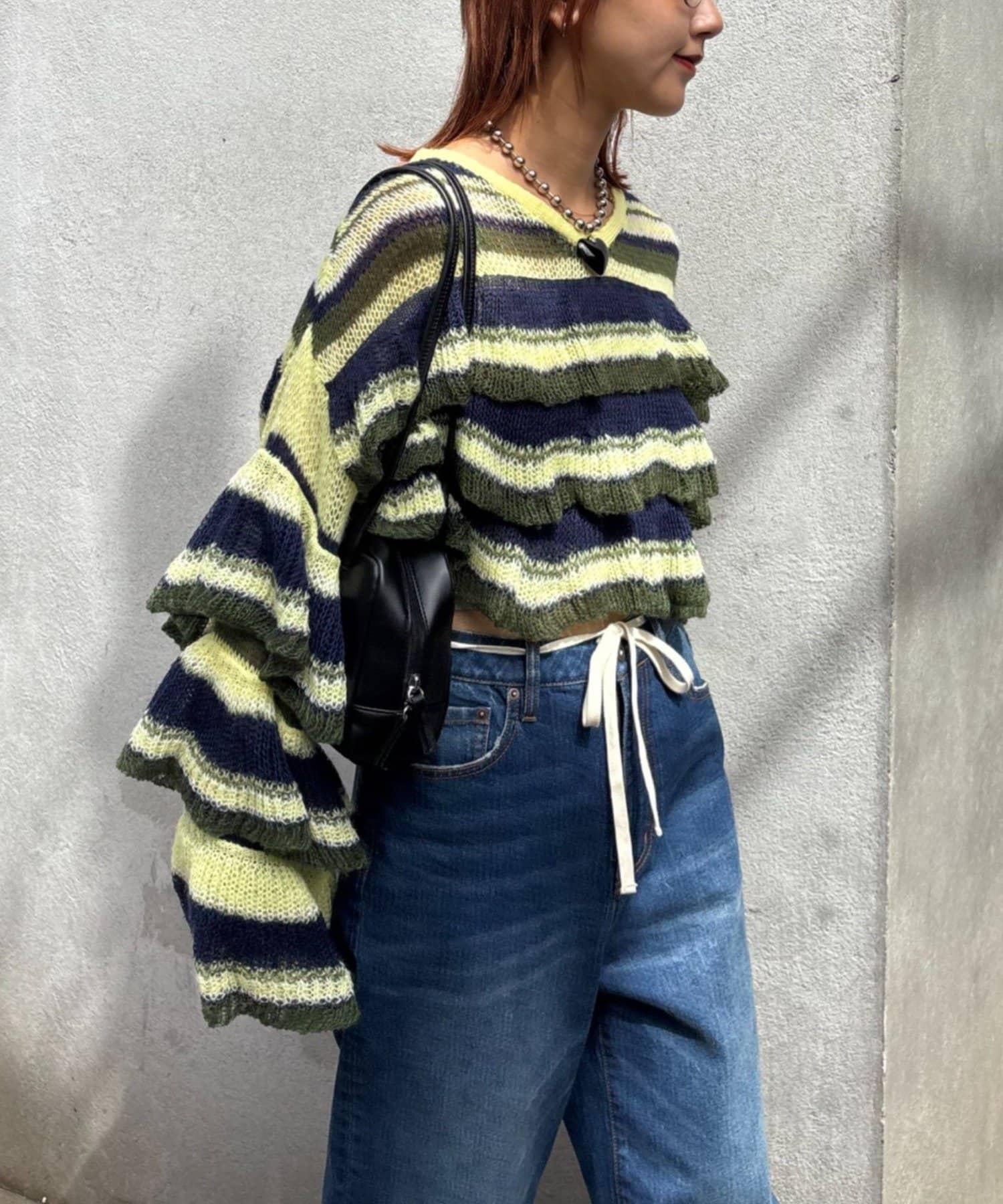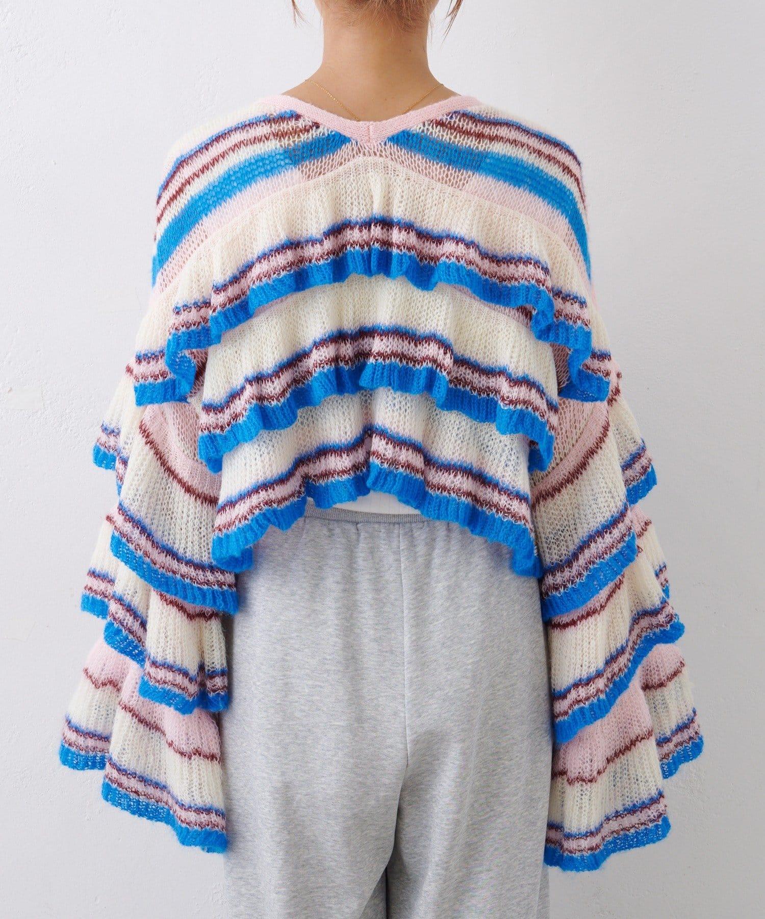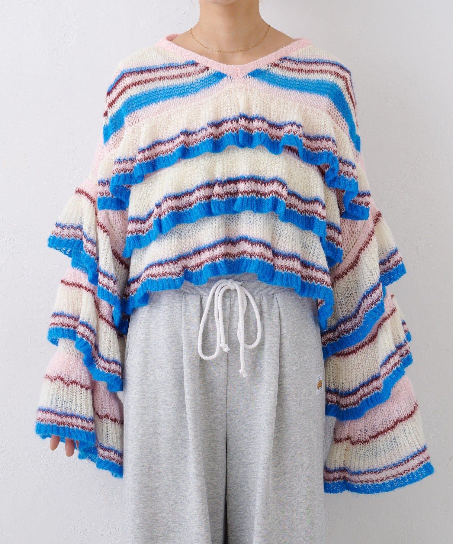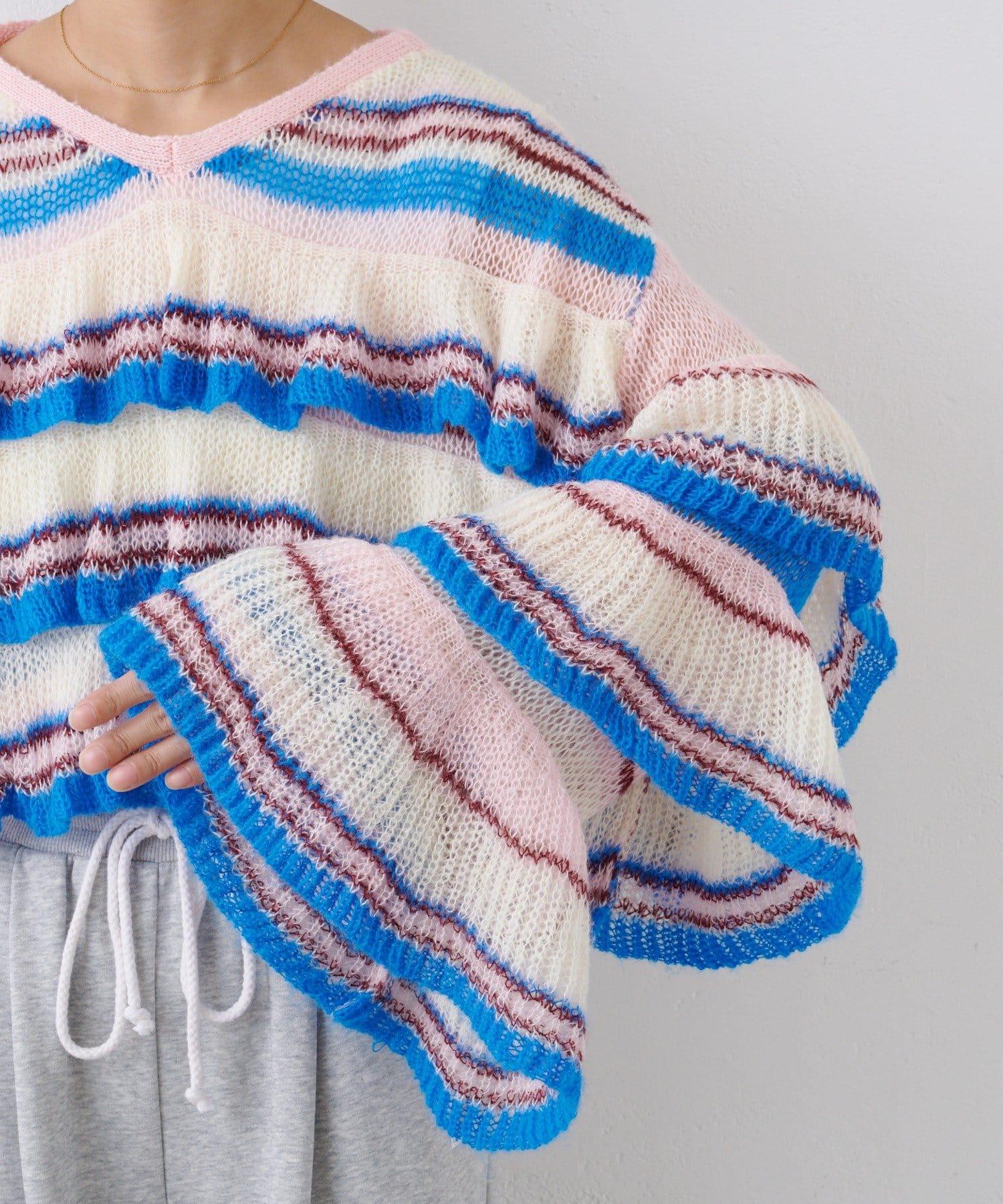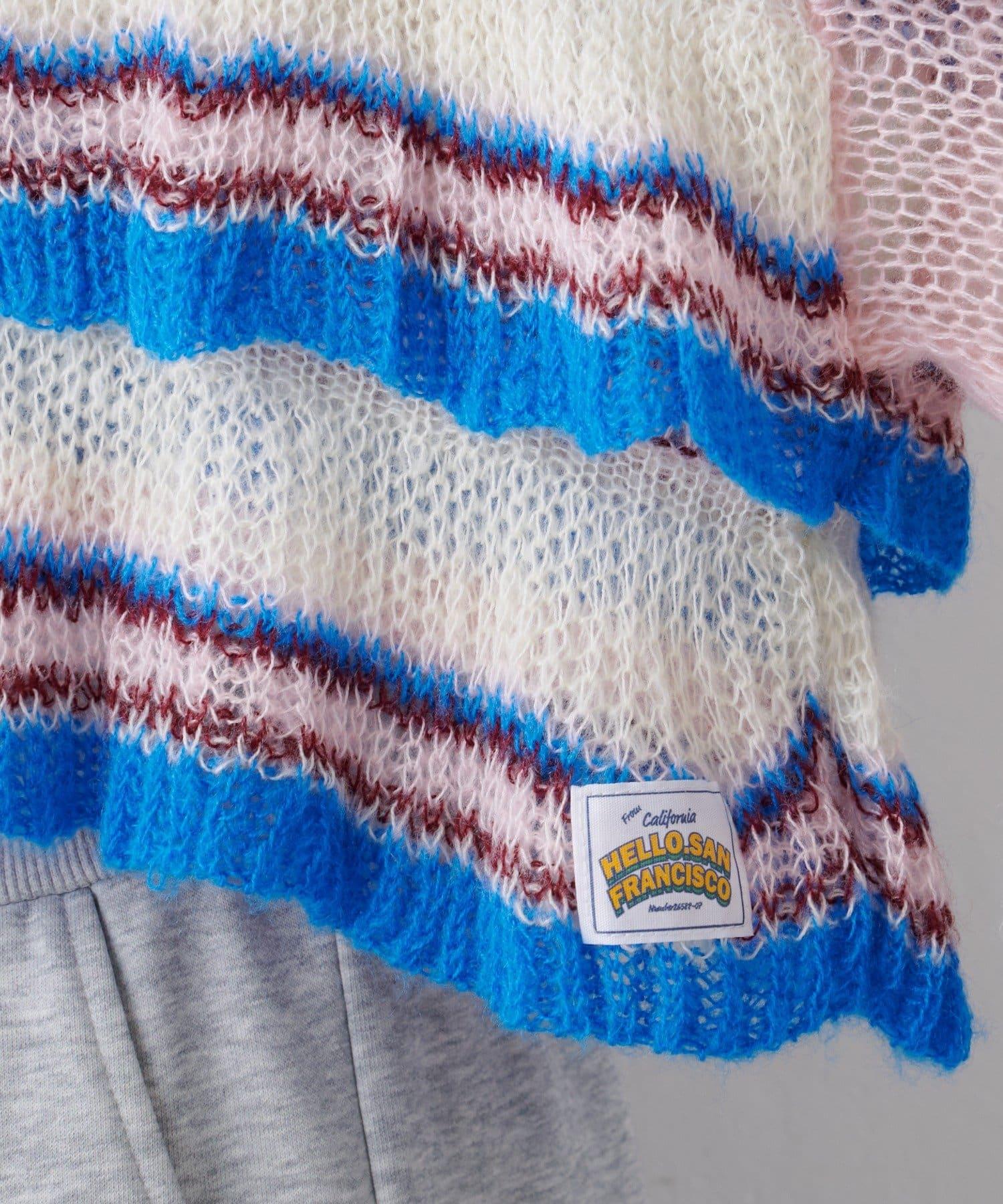 ★【HELLO.SANFRANCISCO/ハローサンフランシスコ】多色條紋透視荷葉邊針織衫