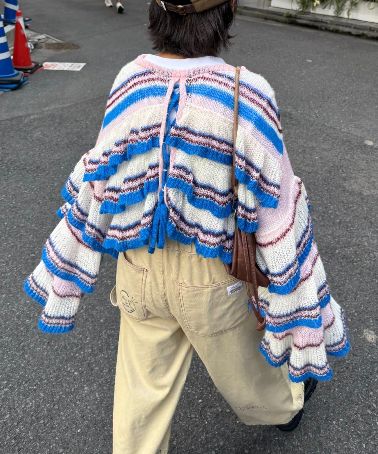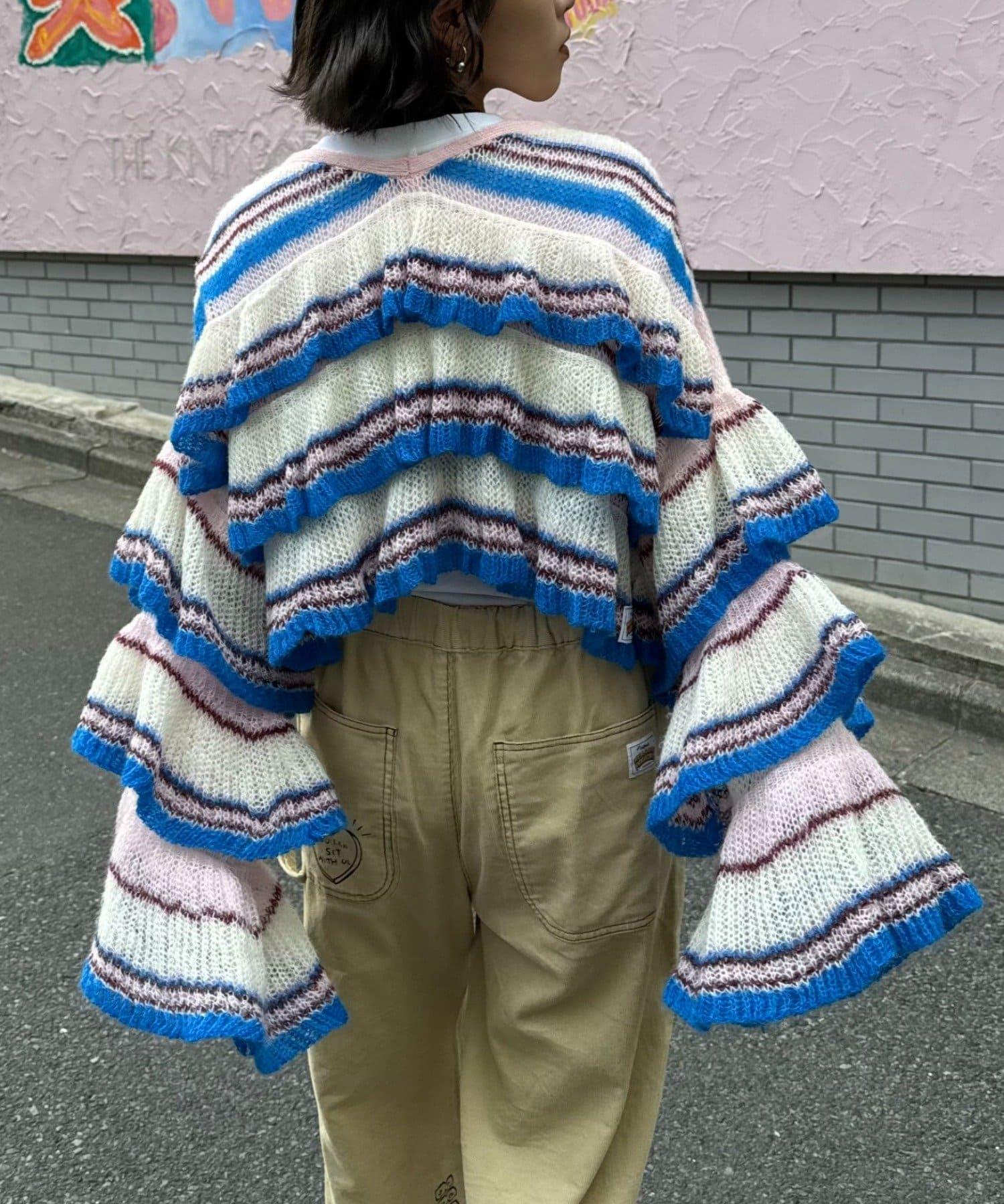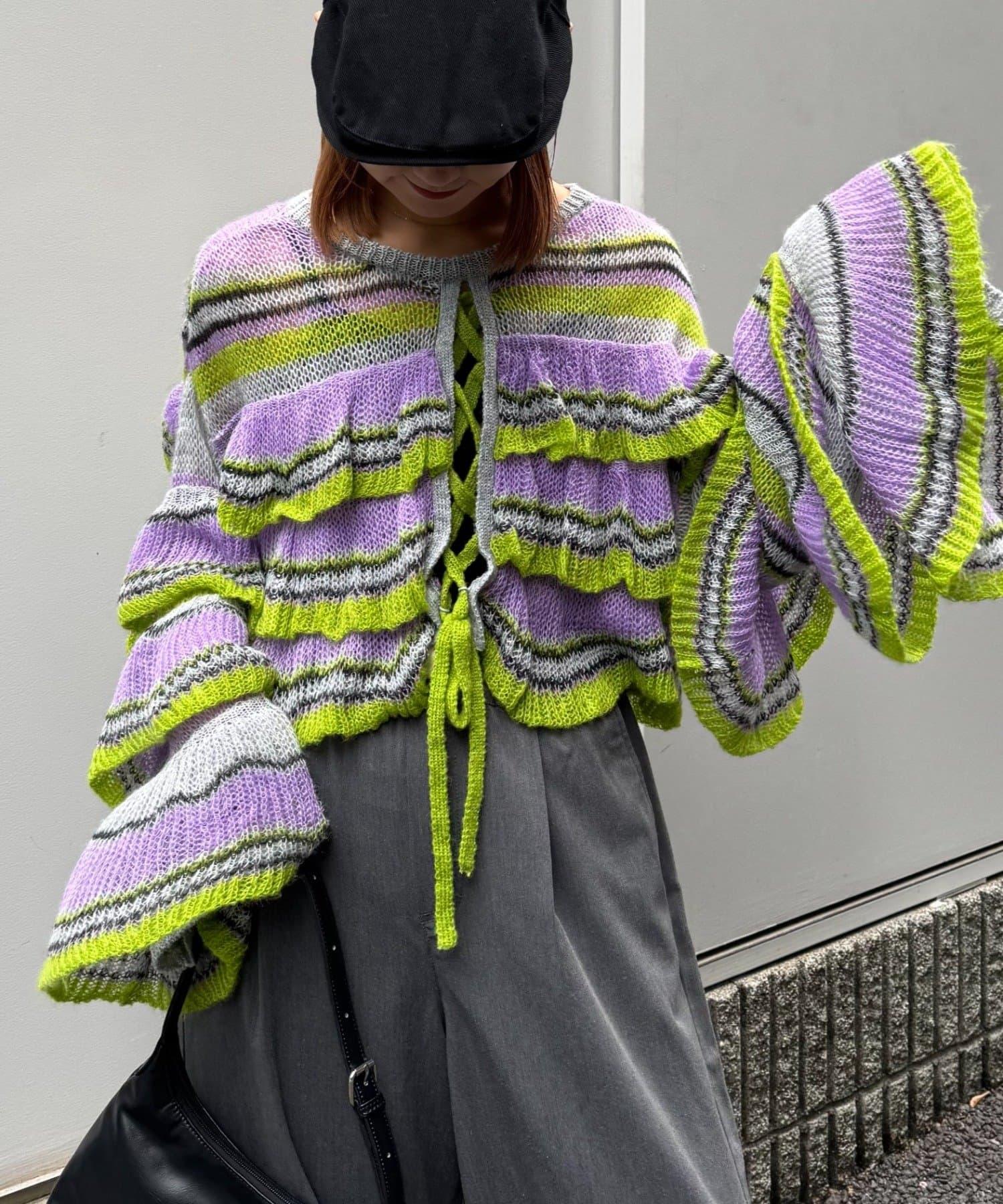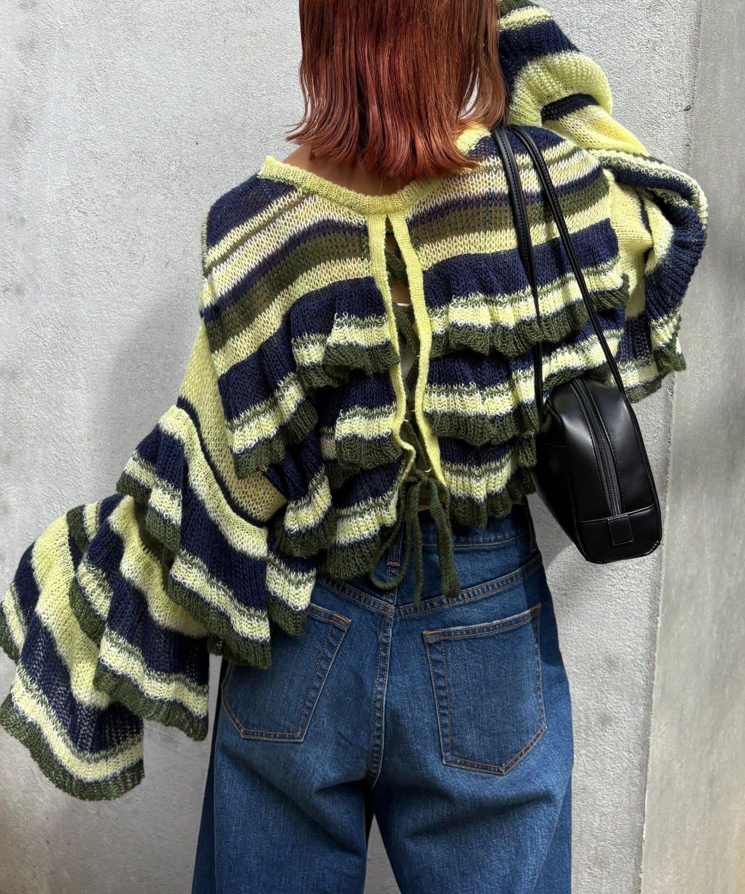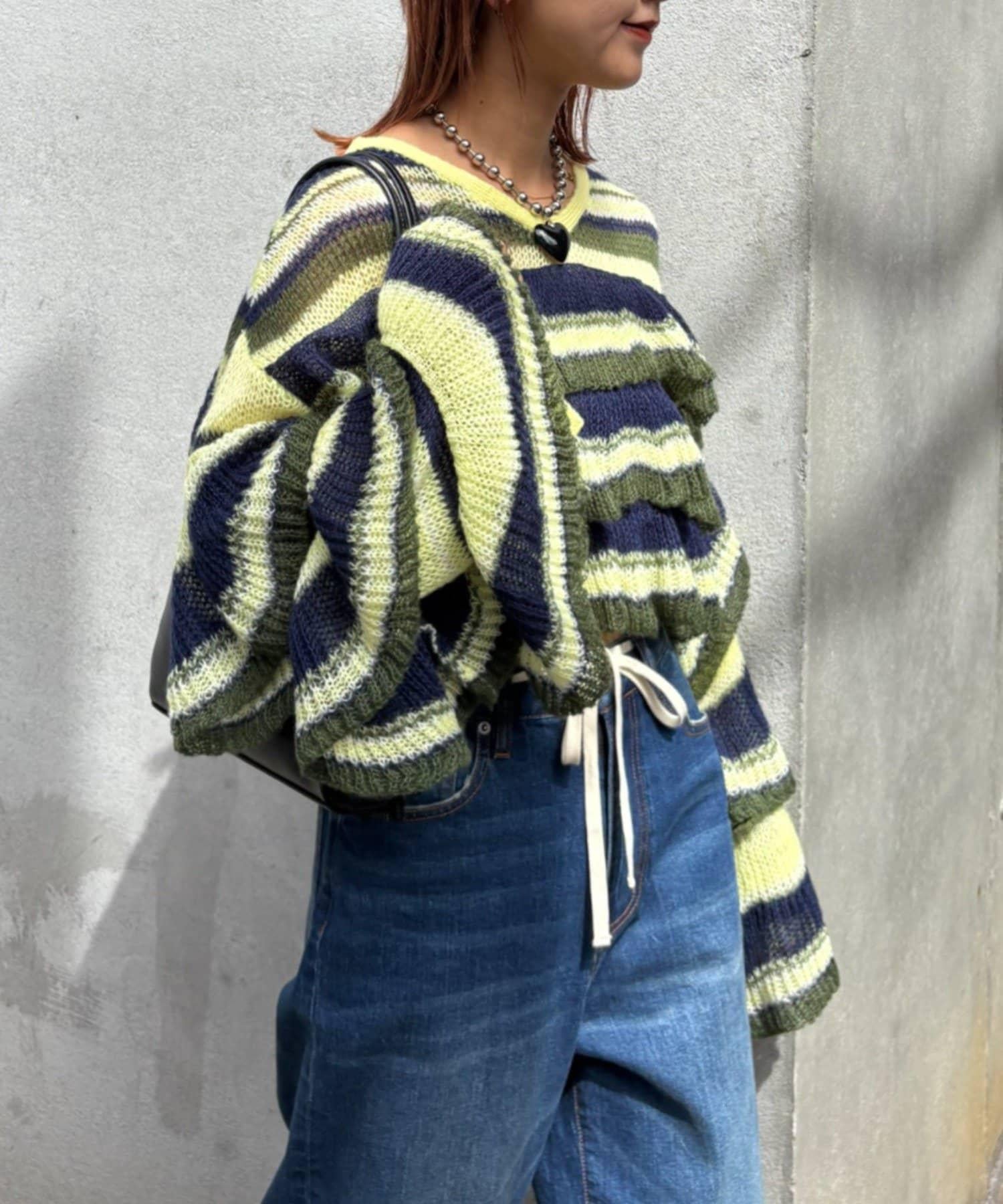 ★【HELLO.SANFRANCISCO/ハローサンフランシスコ】多色條紋透視荷葉邊針織衫