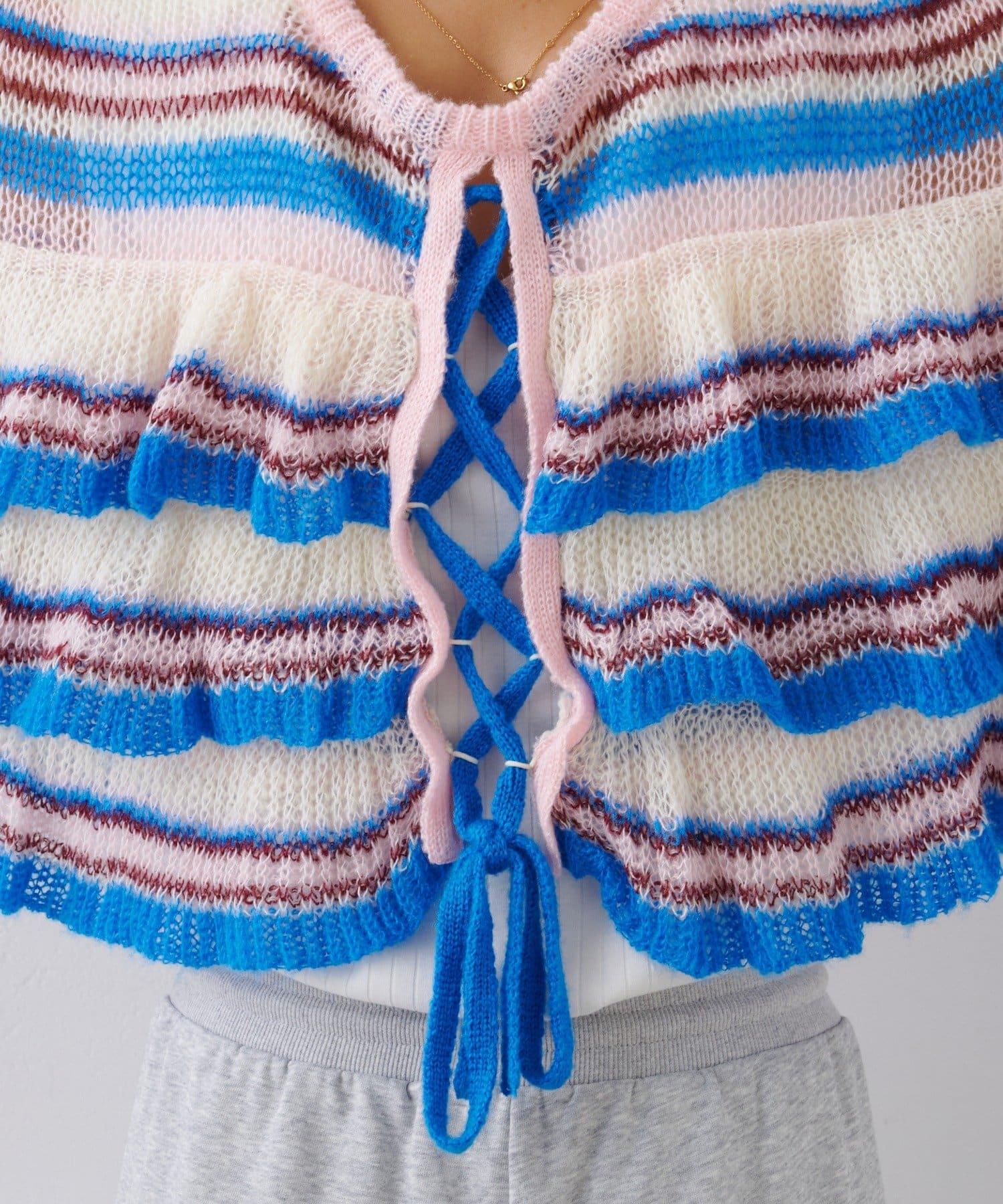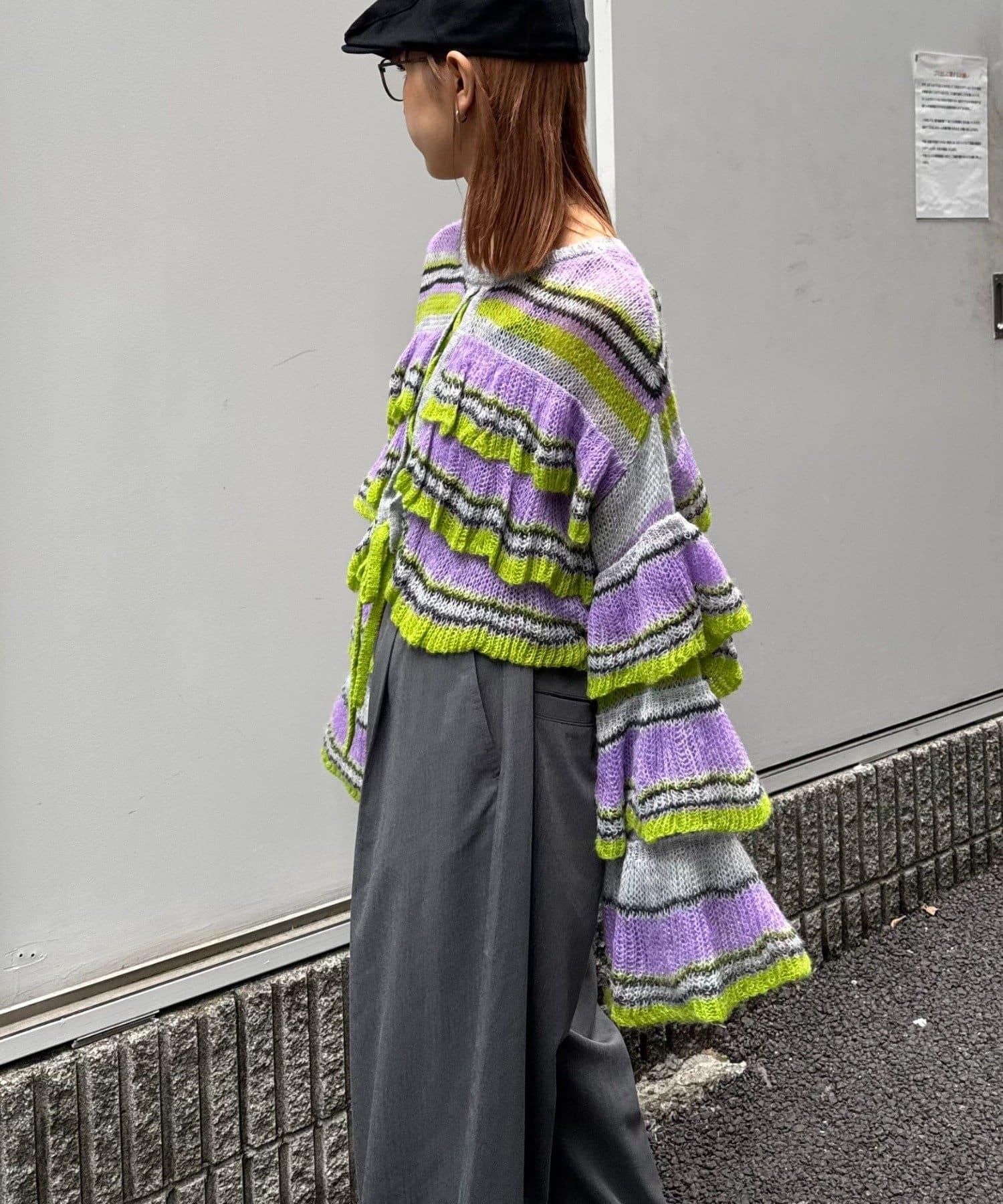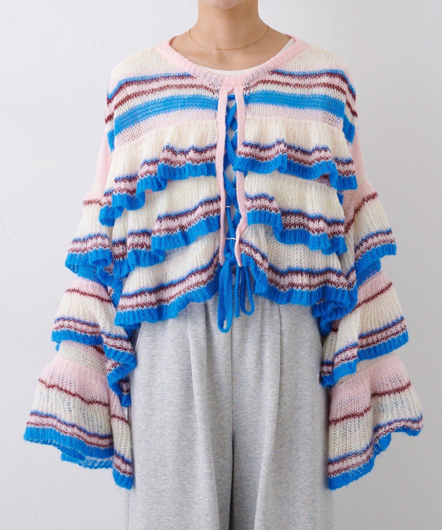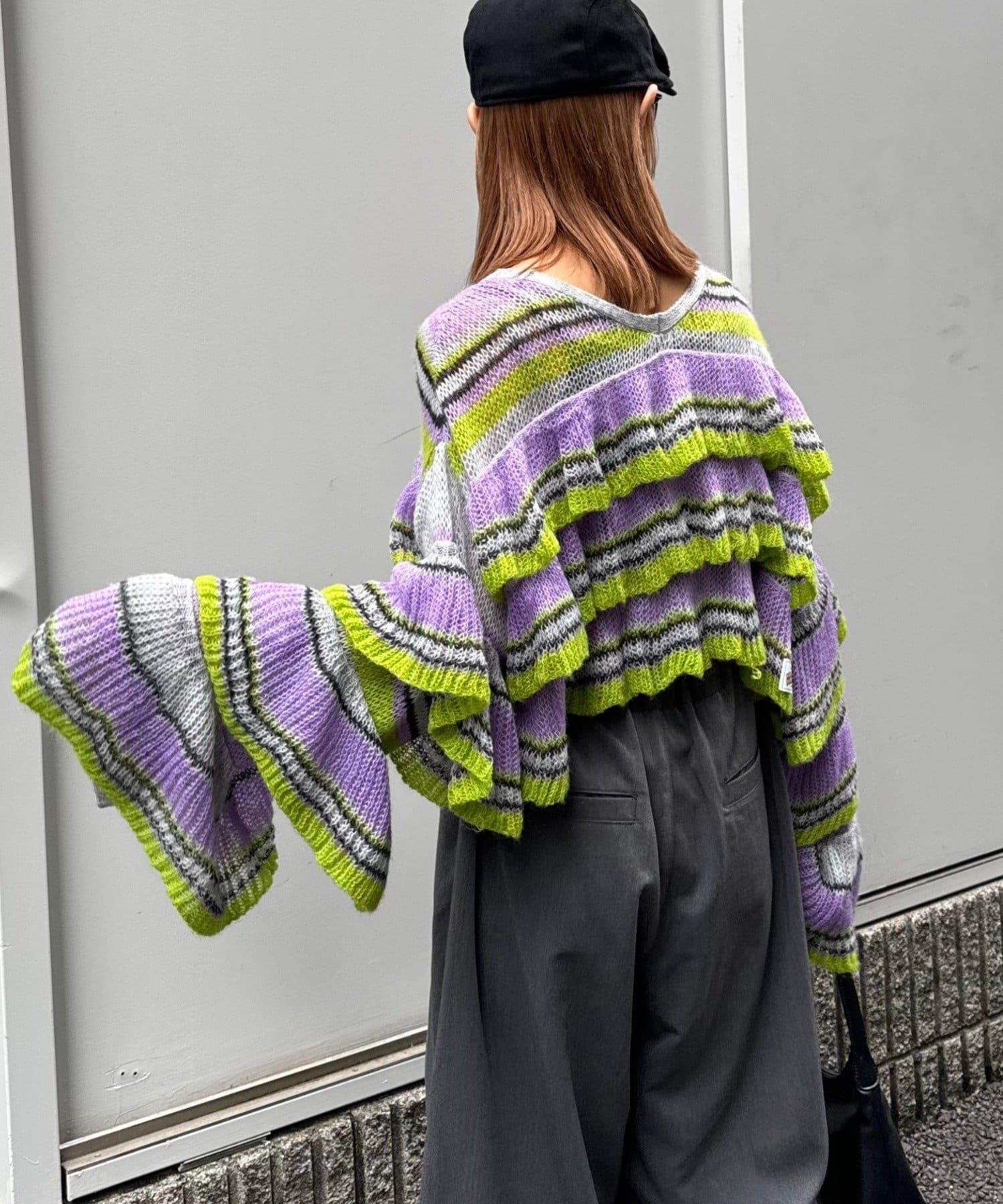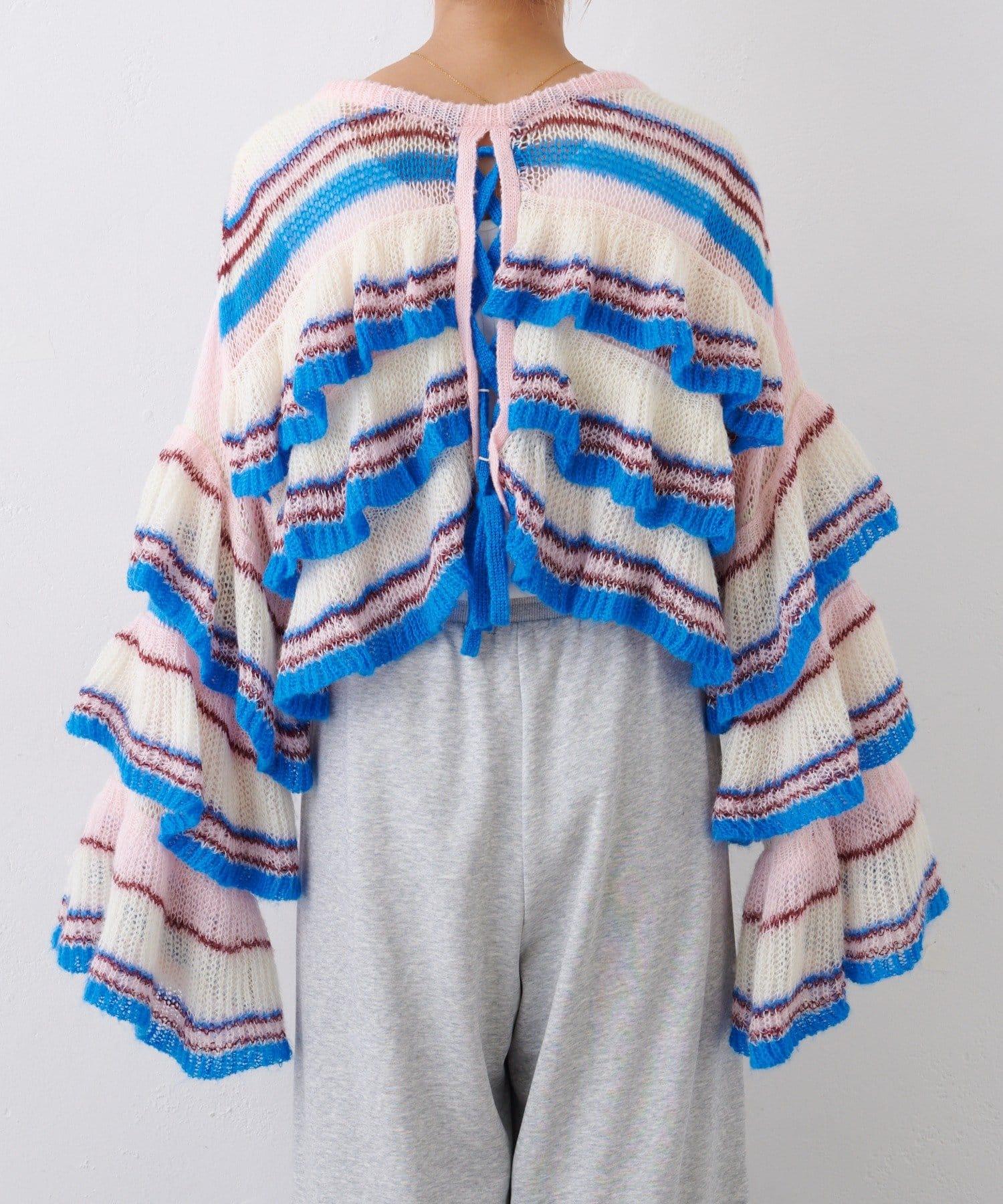★【HELLO.SANFRANCISCO/ハローサンフランシスコ】多色條紋透視荷葉邊針織衫