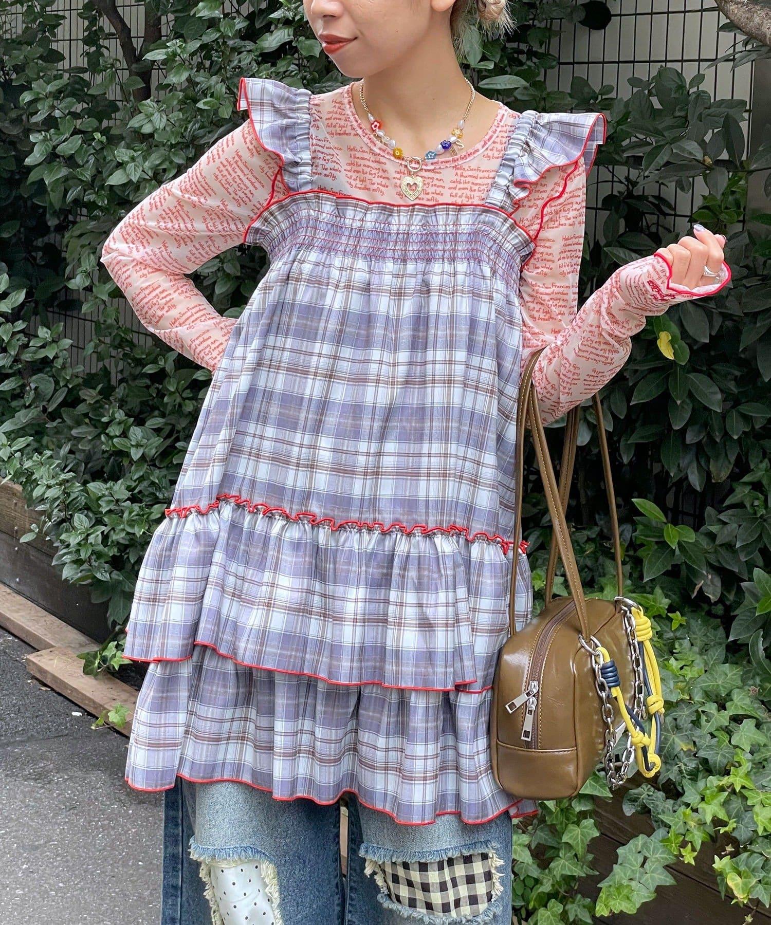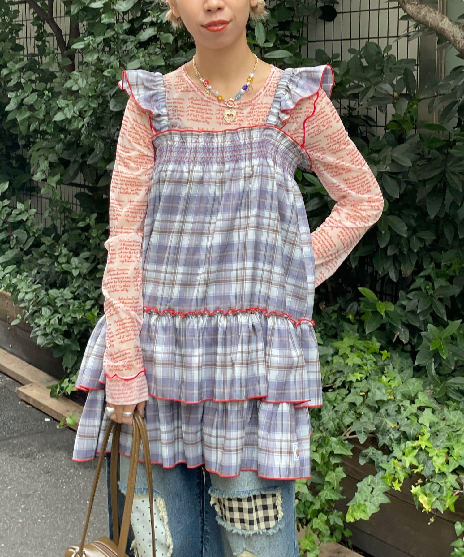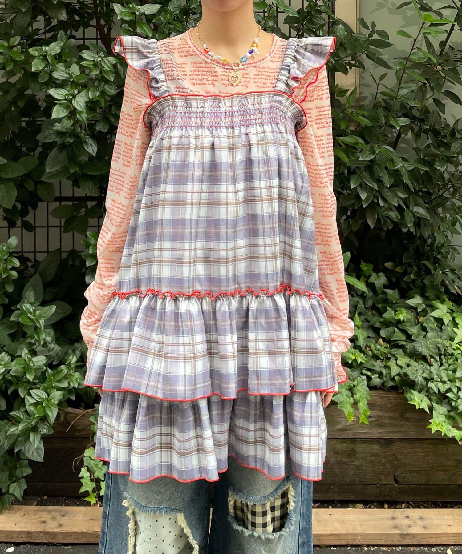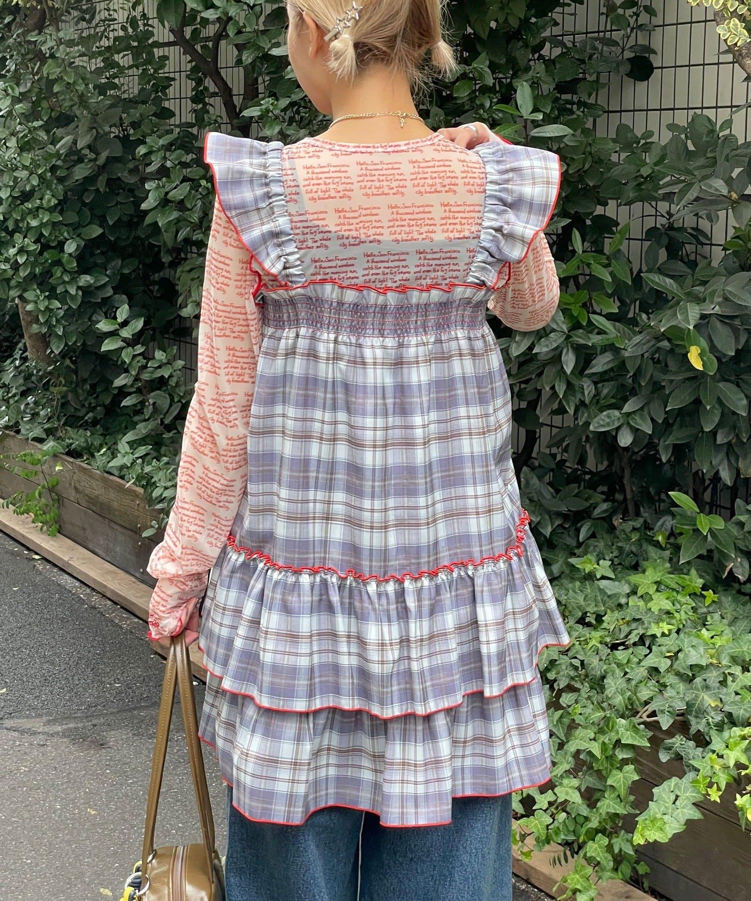 以棋盤格圖案為基礎的長衫連衣裙,褶邊切換,色彩搭配圓潤。