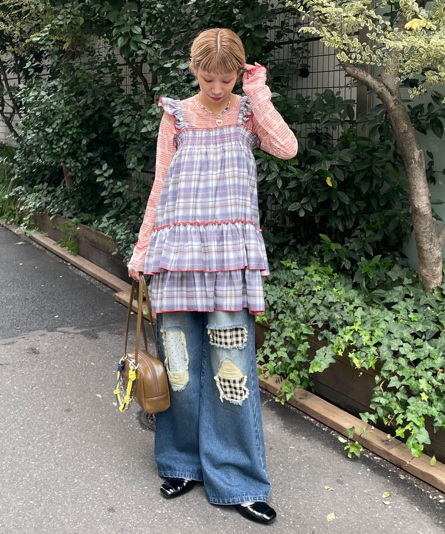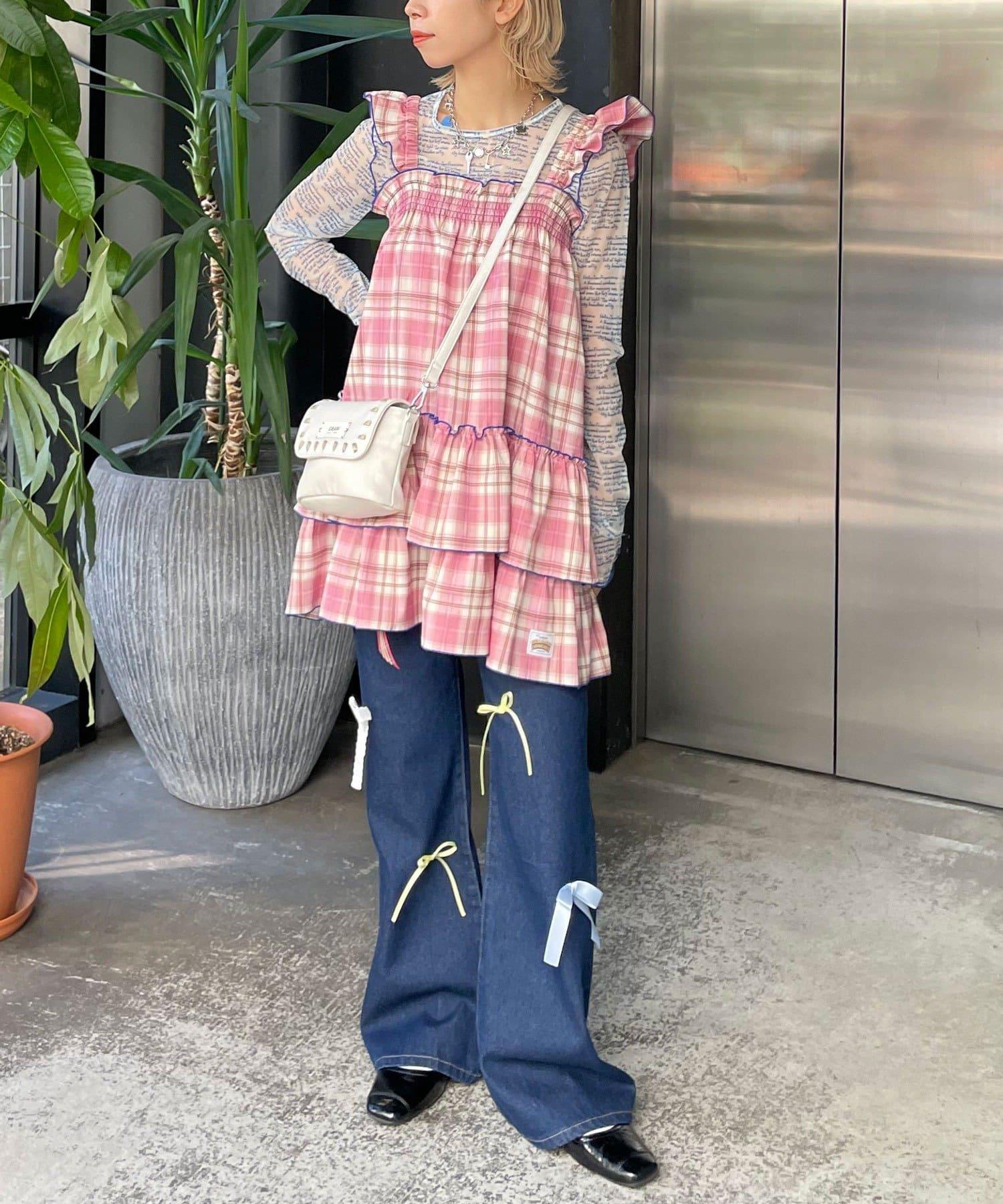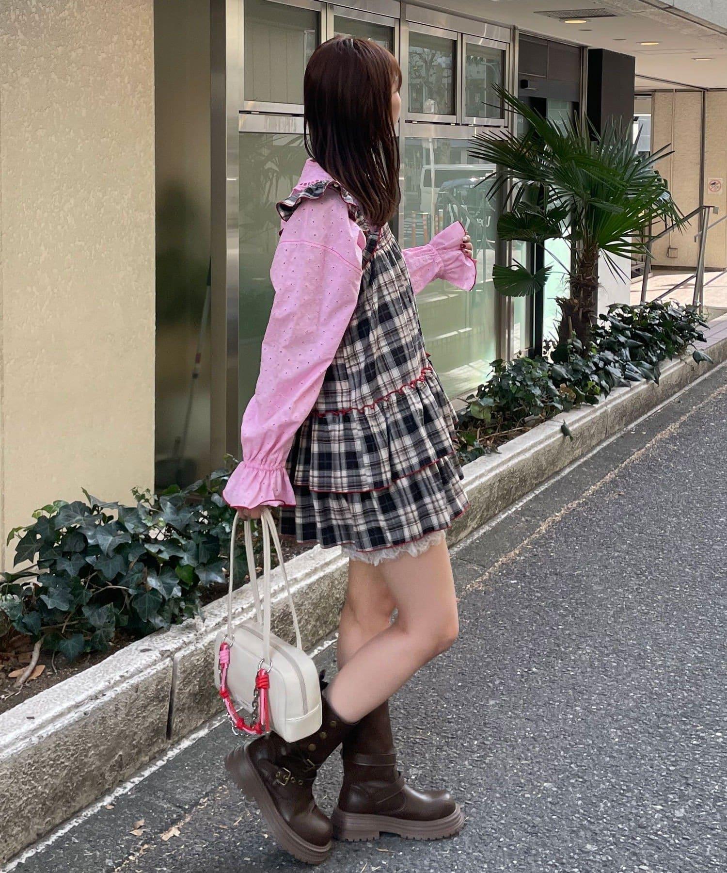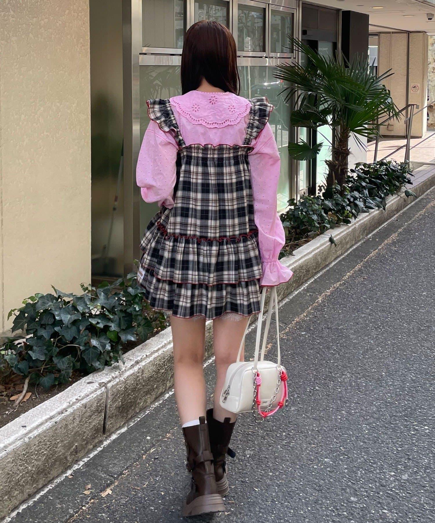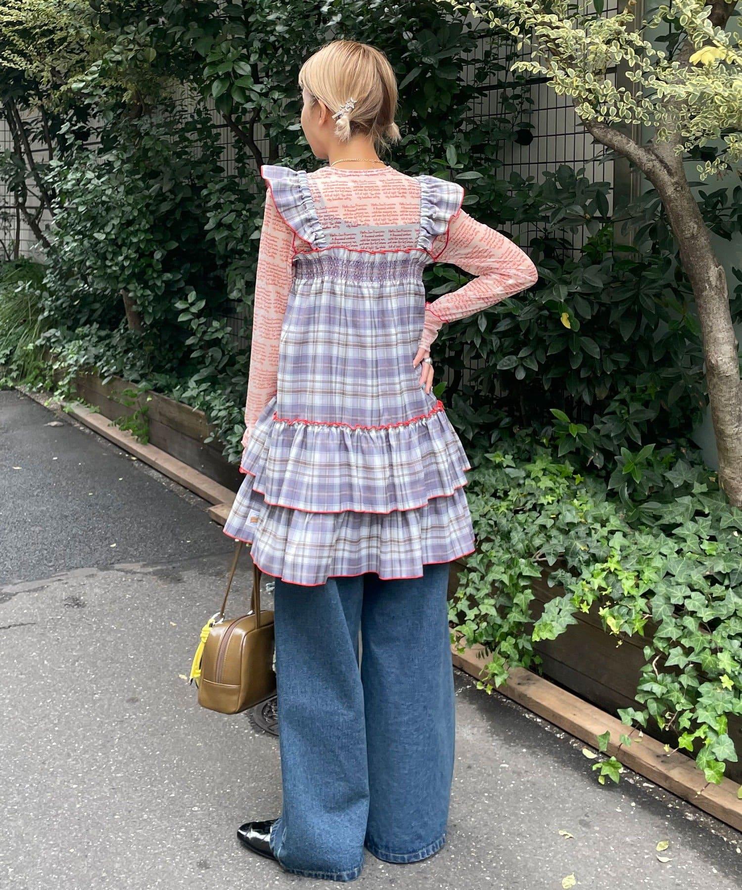 以棋盤格圖案為基礎的長衫連衣裙,褶邊切換,色彩搭配圓潤。