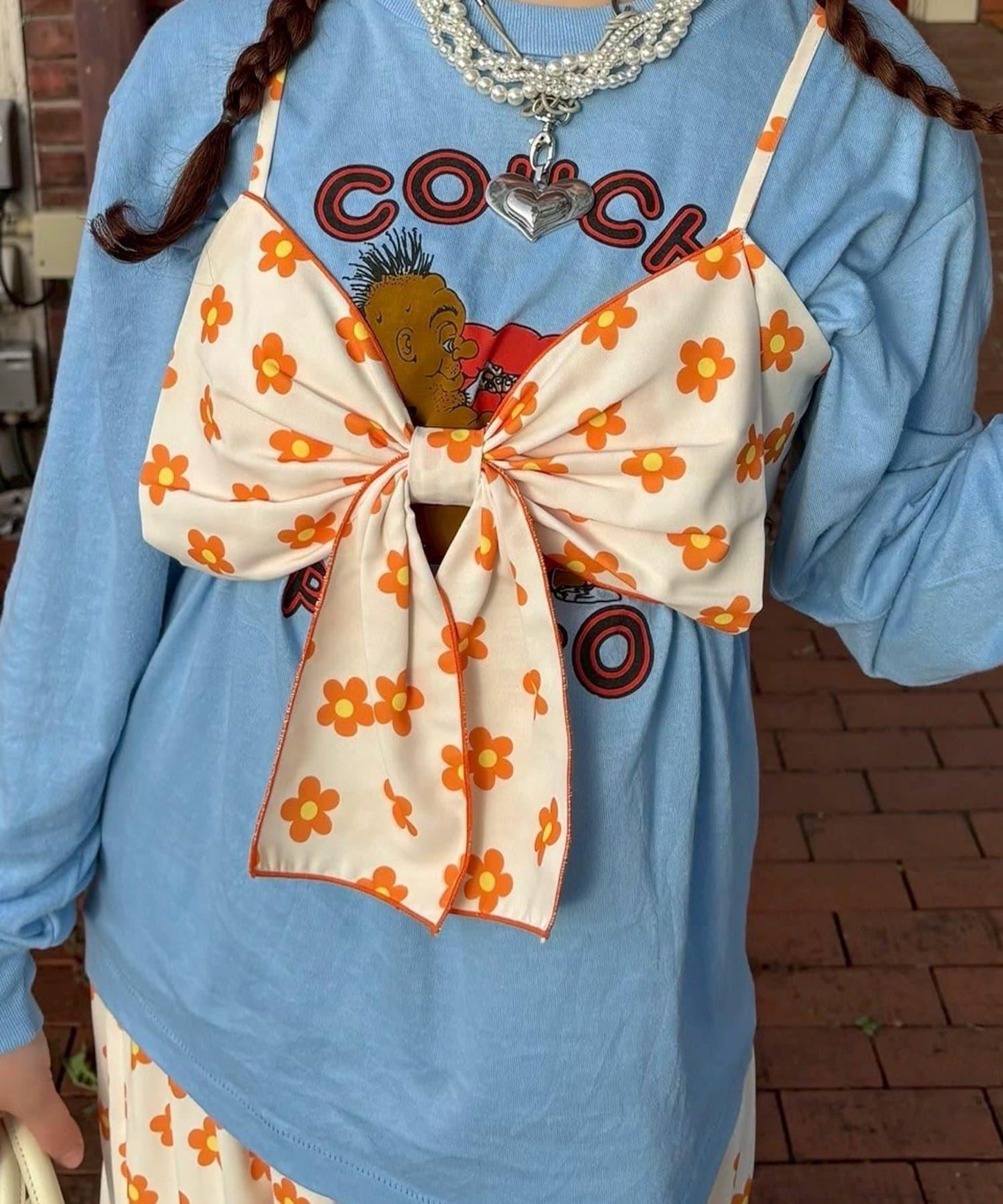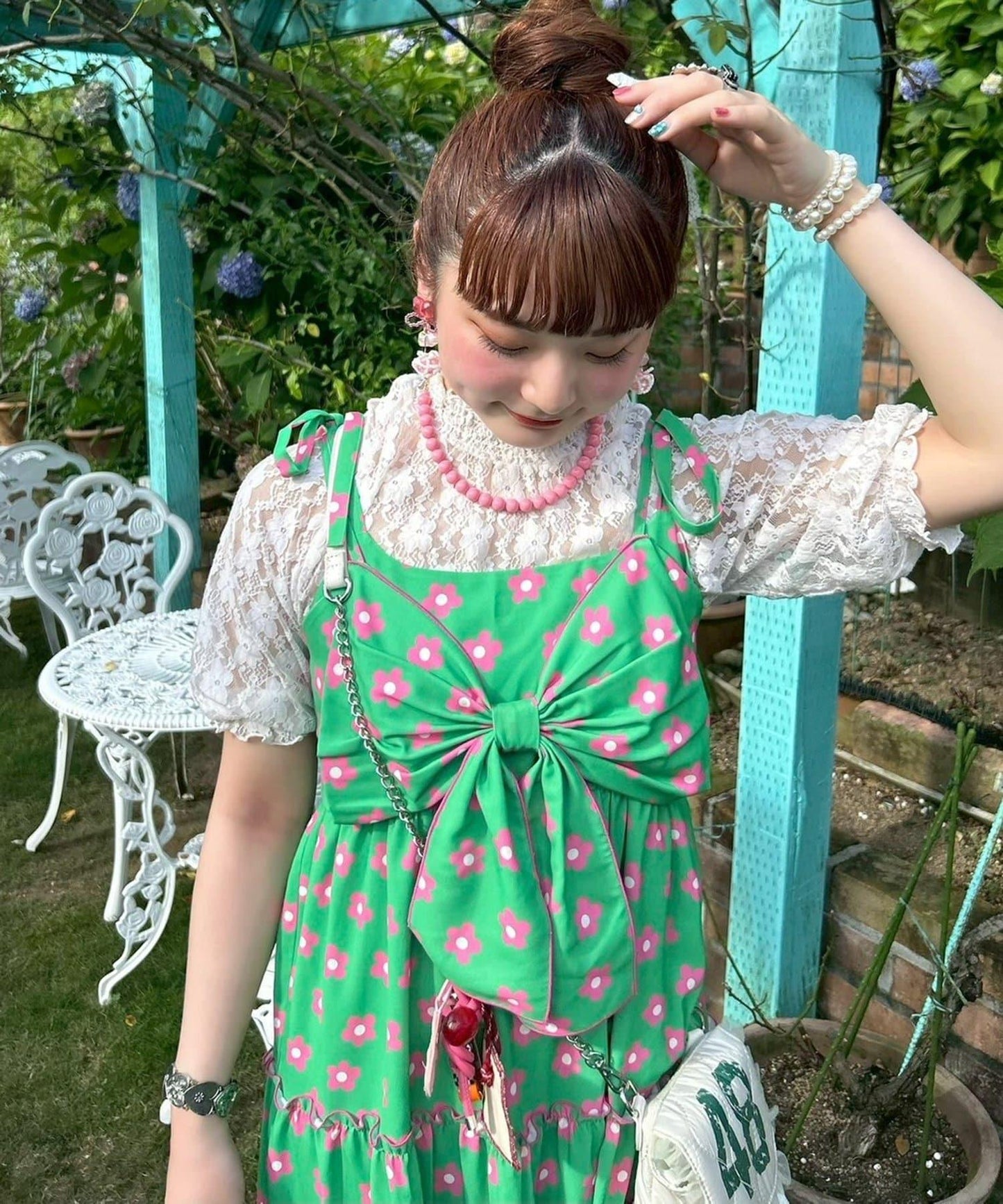 復古流行的花朵圖案,胸前的大絲帶是一大亮點!