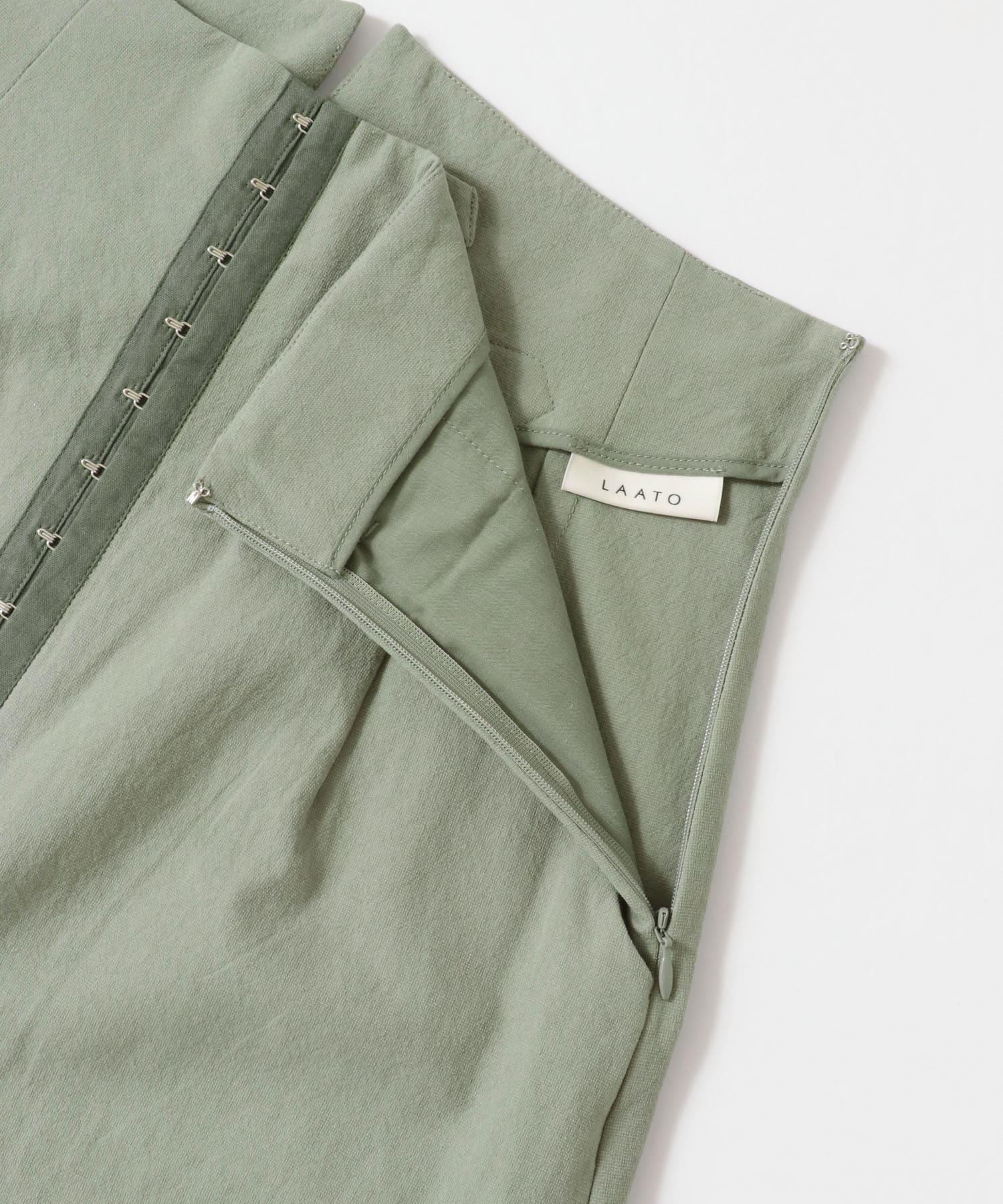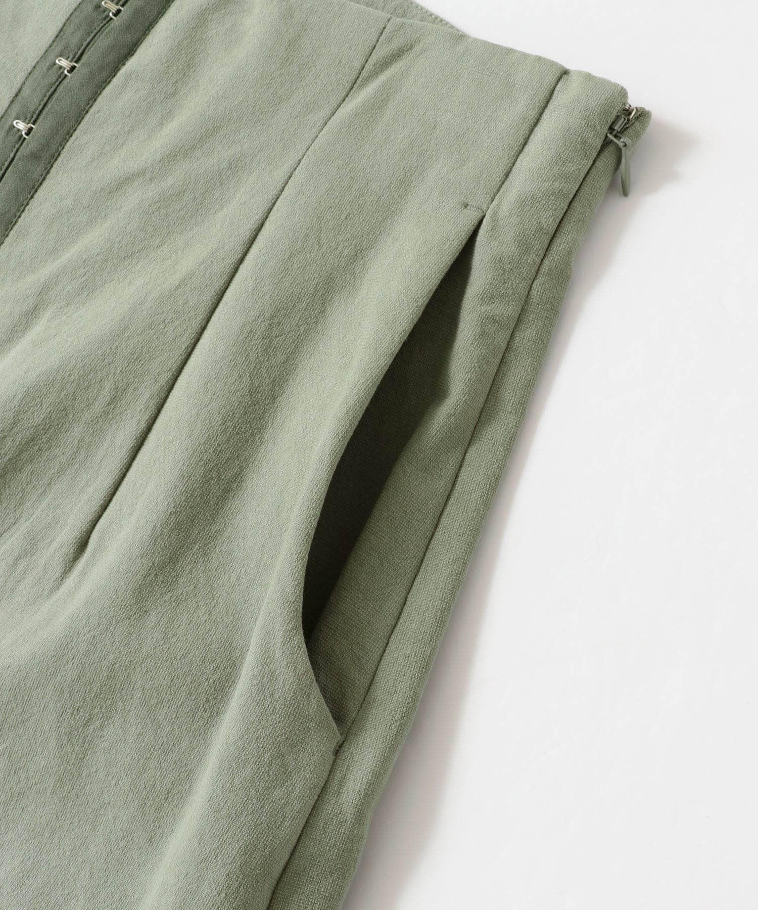 長度足以遮住膝蓋以下的部分,背後的腰帶設計十分隨意。