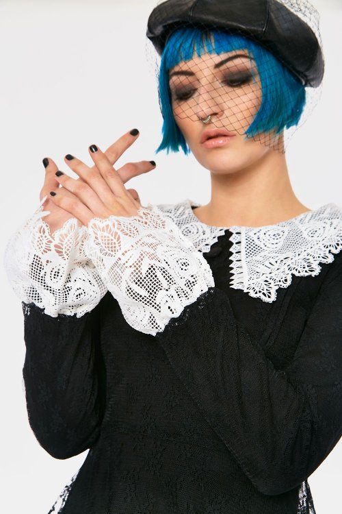 長袖裙型,全黑的裙身與領口和袖子上的白色蕾絲相映成趣。