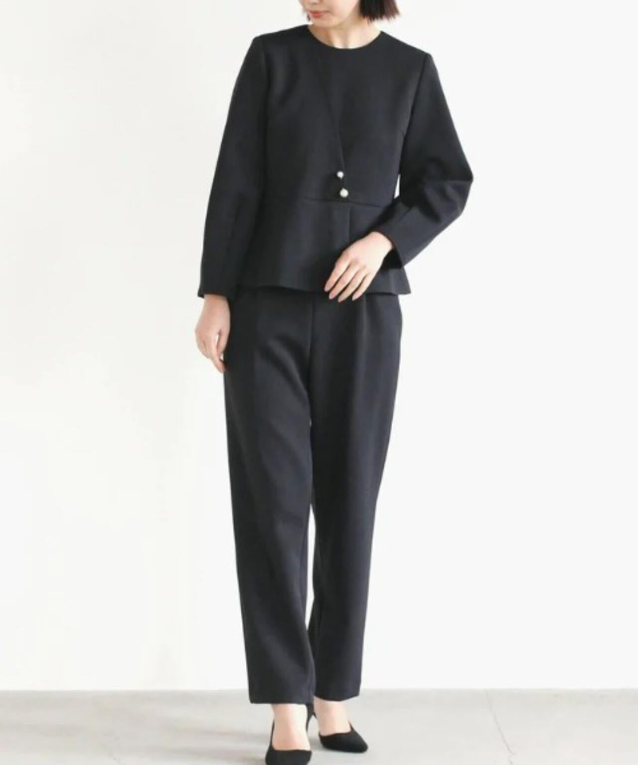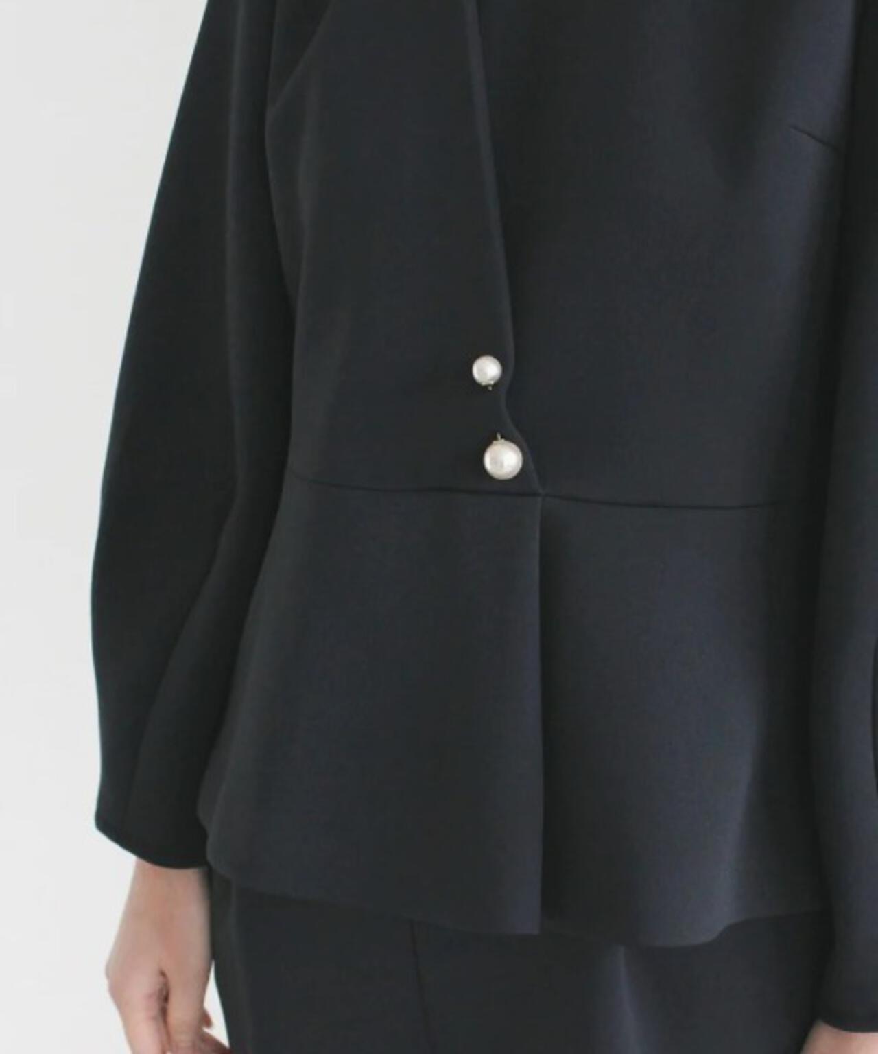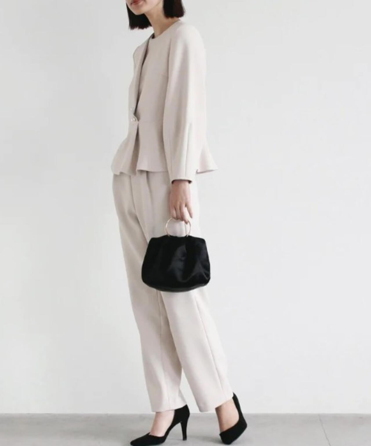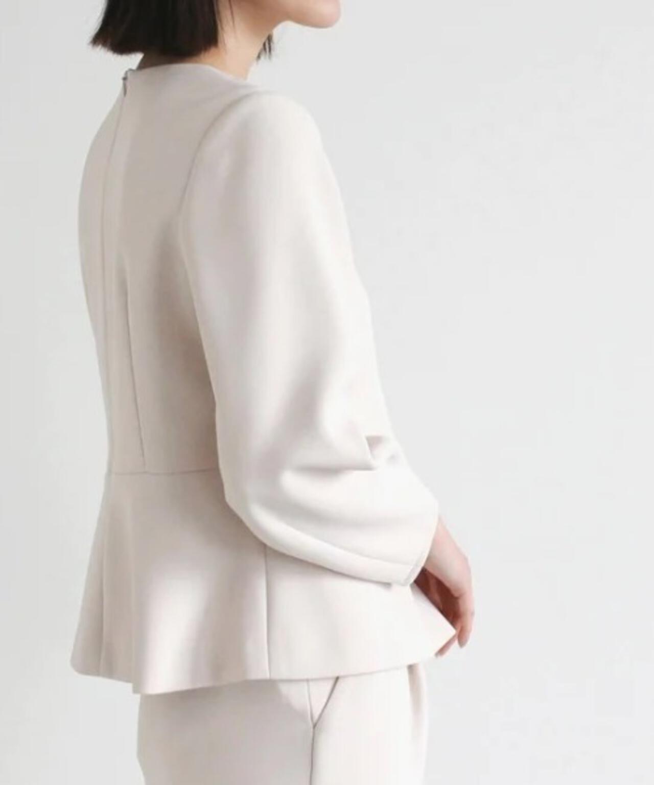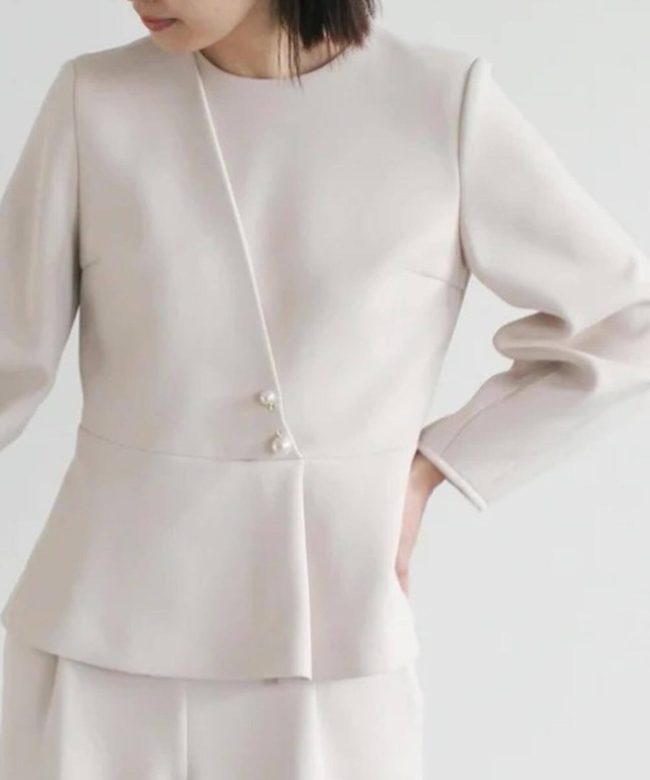 B'2nd也有非常受歡迎的套裝!同樣適用於典禮★對角線褶襉展現了利落的設計風格,可拆卸的珍珠別針則為這款設計感十足的上衣增添了華麗的印象。袖口的褶襉使袖子看起來更有立體感。蓬蓬裙的部分還遮住了腰部,這也是人們關心的問題。這款高彈性紙板針織衫具有良好的彈性,穿著方便,使用的面料具有柔軟的觸感和良好的張力感。這種面料的功能性也很強,抗透明、吸水的紫外線屏蔽率(UV cut)達到了 90%,這也是一大亮點!當然,與同種面料的長褲(高彈力長褲/008222)配套使用時,還要注意長褲的緊身剪裁。