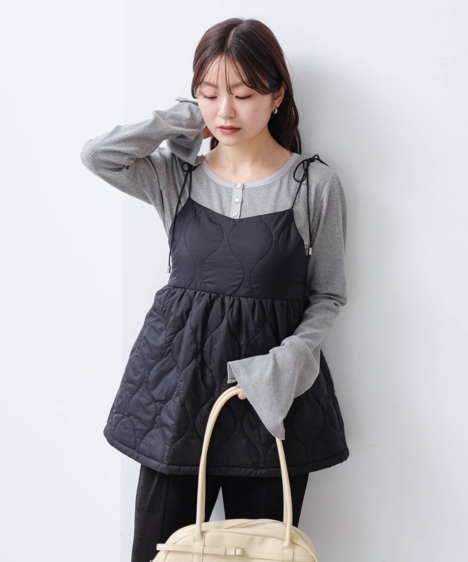 吊帶背心式半身裙採用保暖的絎縫面料製成,非常適合秋冬季節穿著。