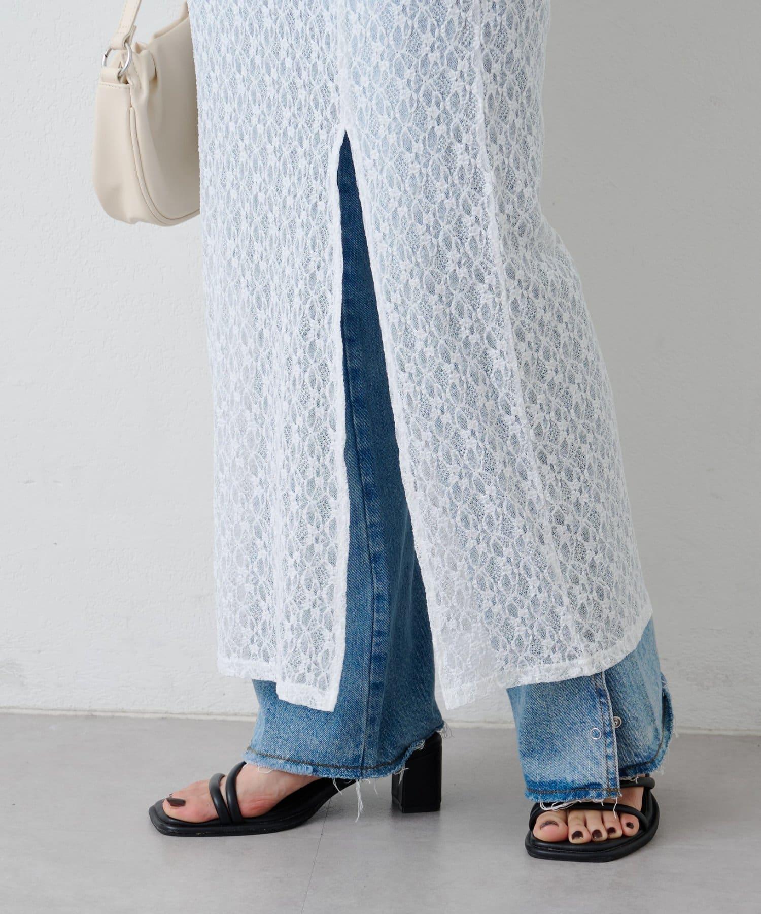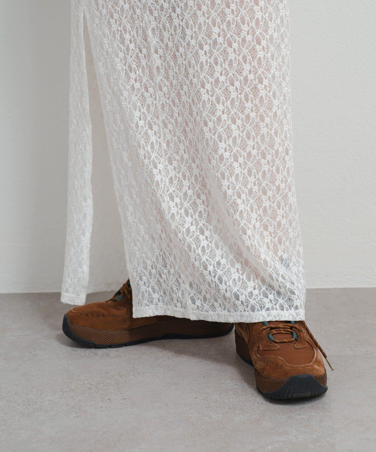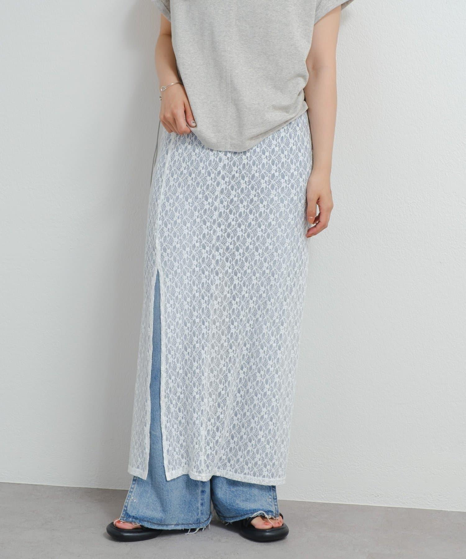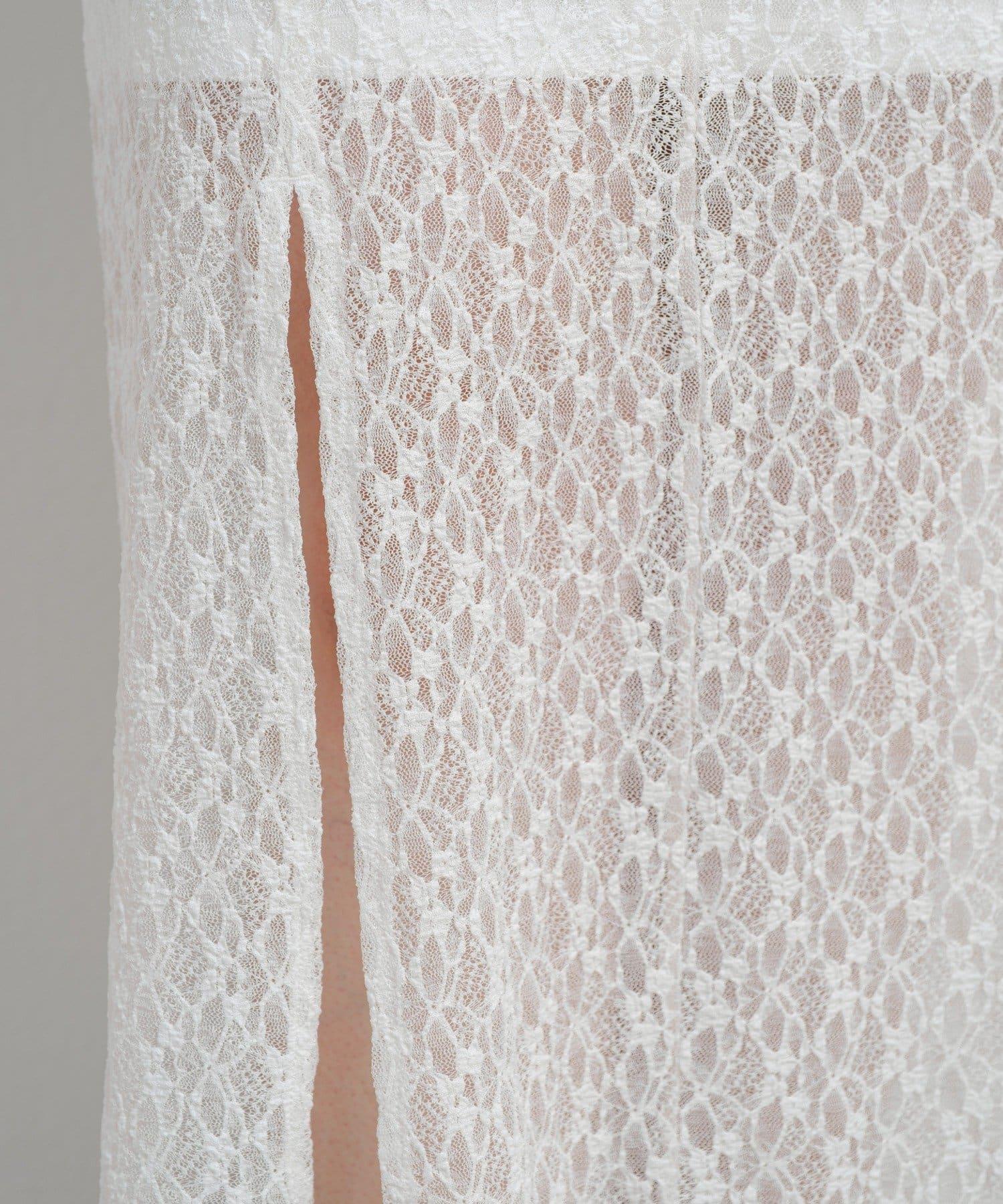 這款開衩長裙採用透明蕾絲面料,給人以清涼柔美的印象。