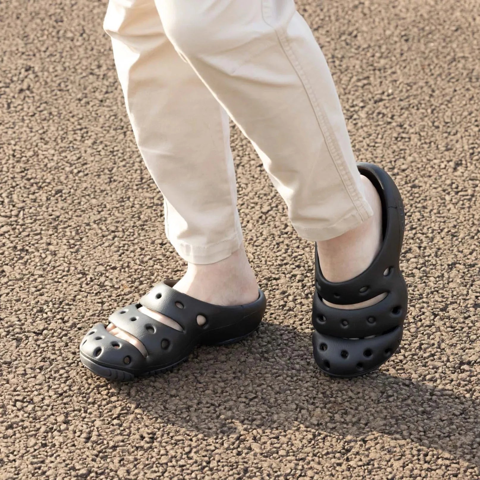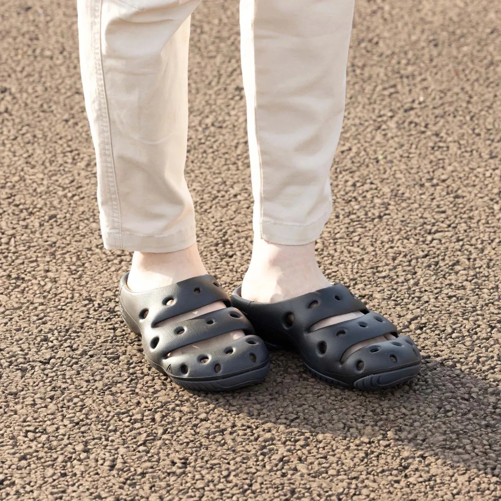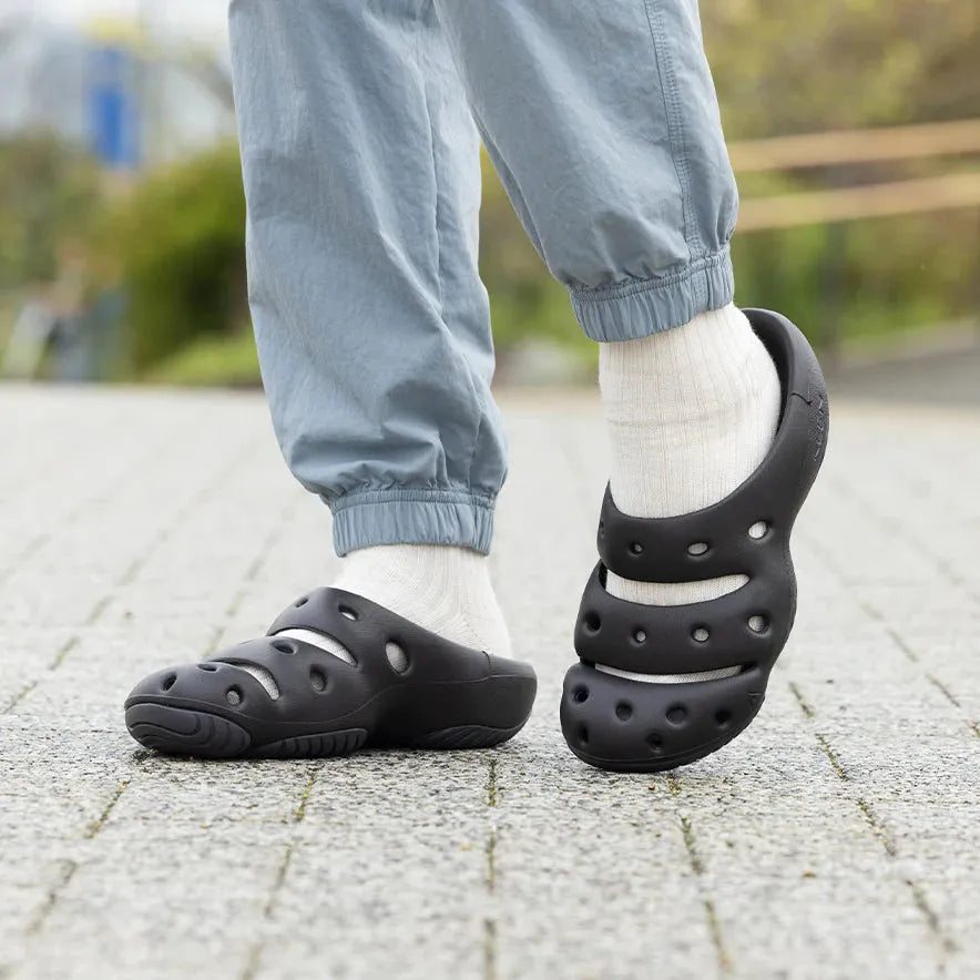 獨創的高性能木屐鞋。用途廣泛--運動後鞋、辦公鞋、園藝鞋、野營鞋等。