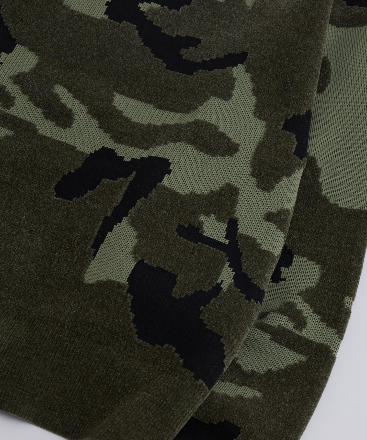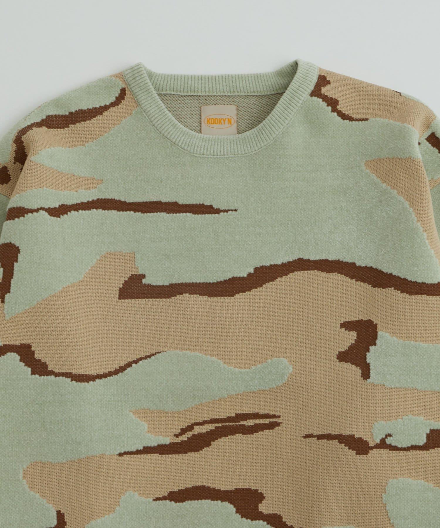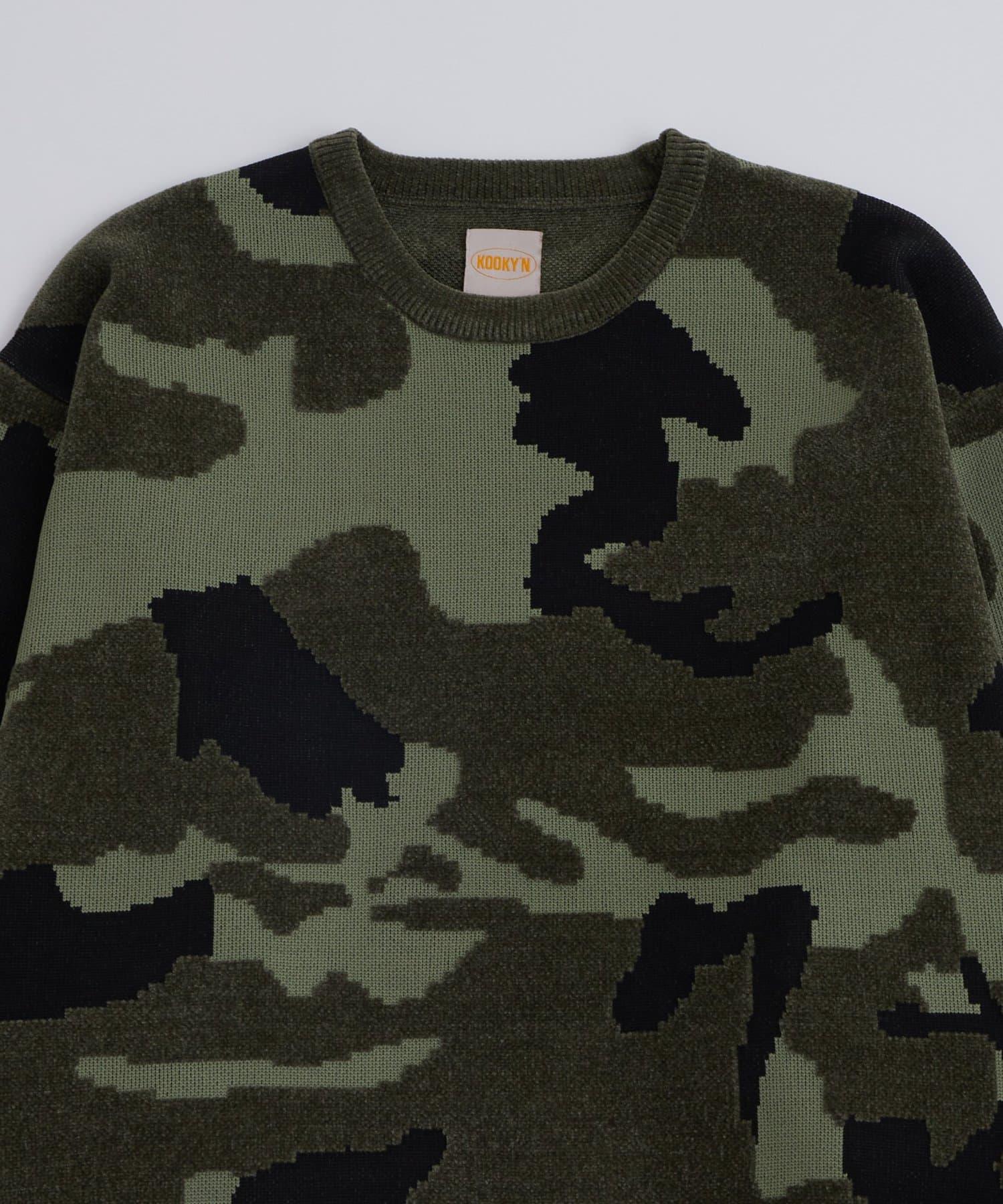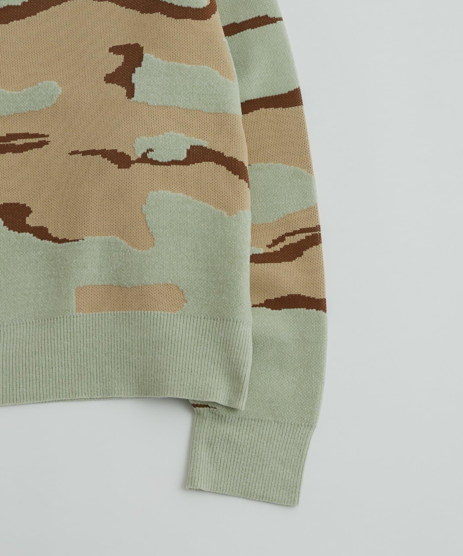 採用蓬鬆編織紗線編織的迷彩圖案圓領針織衫