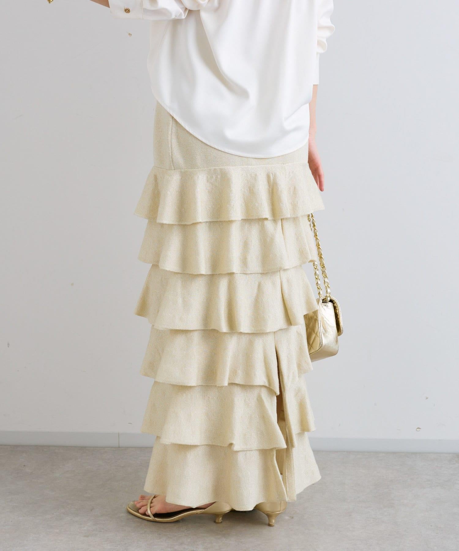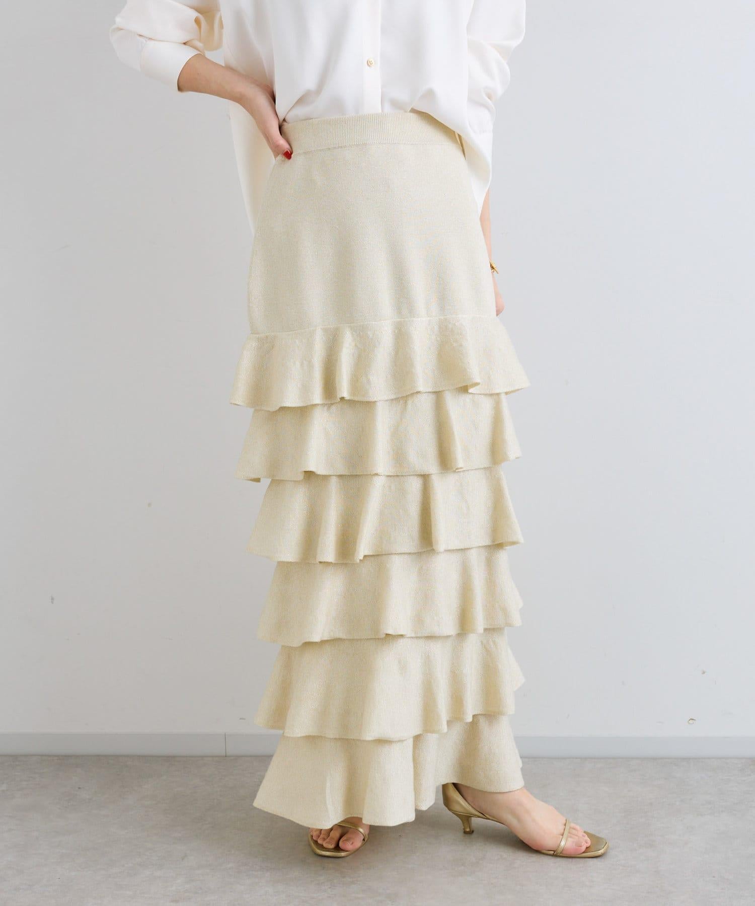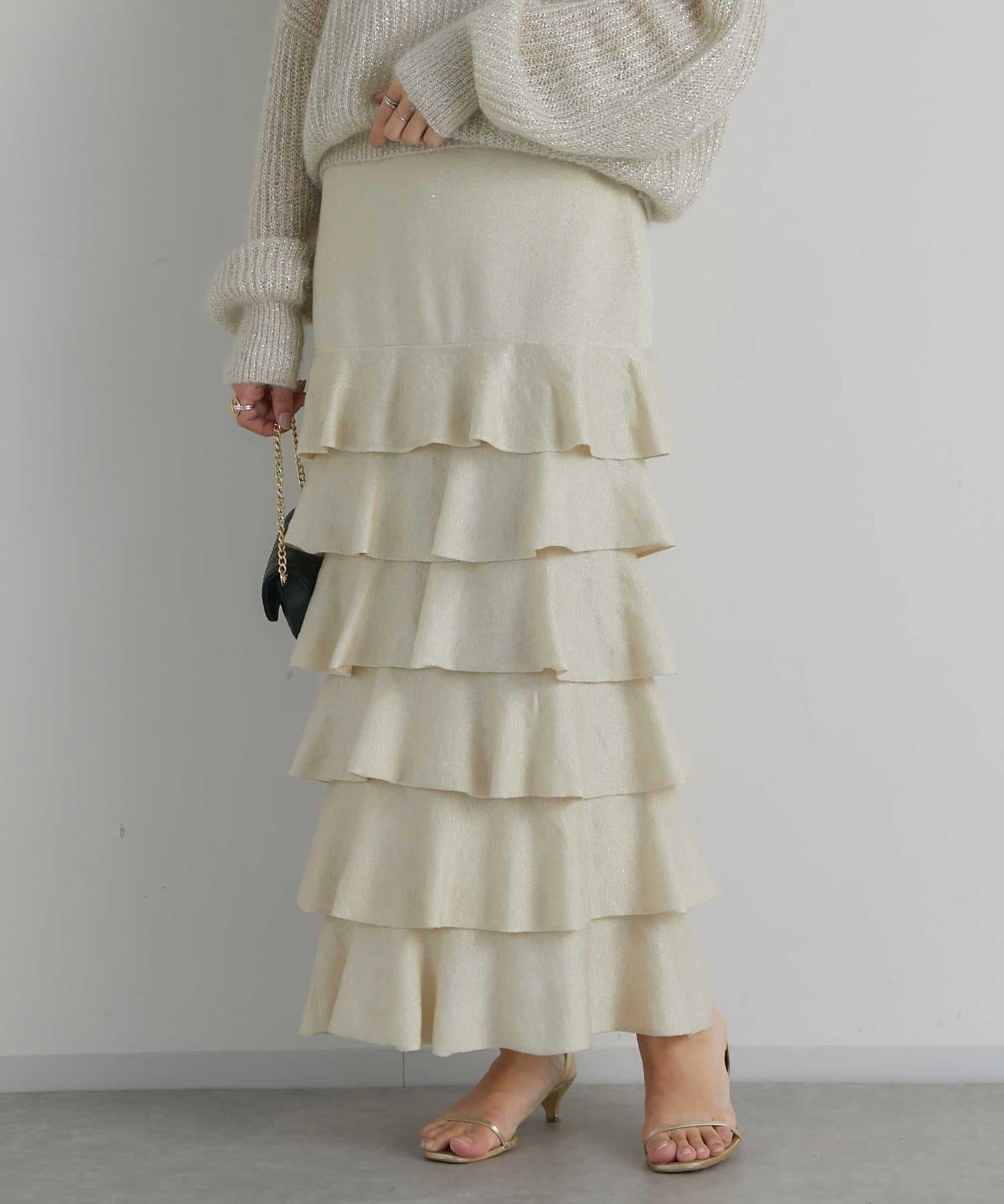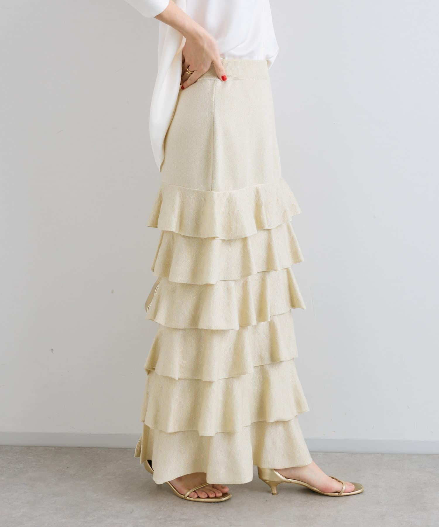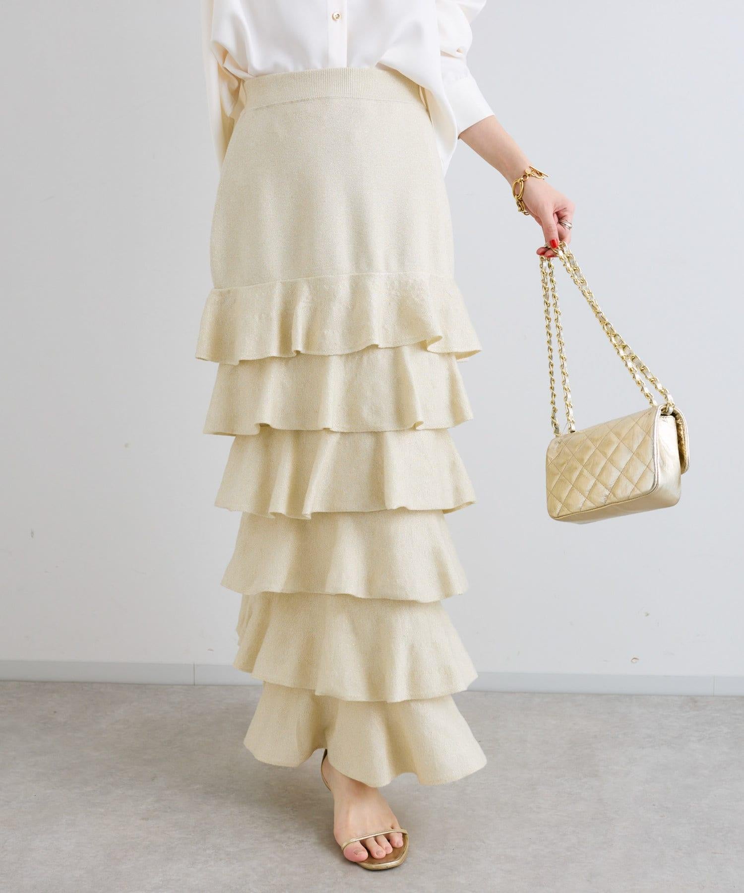 這是一款具有強烈視覺衝擊力的裙子,採用帶有流蘇層疊圖案的薄片針織面料。